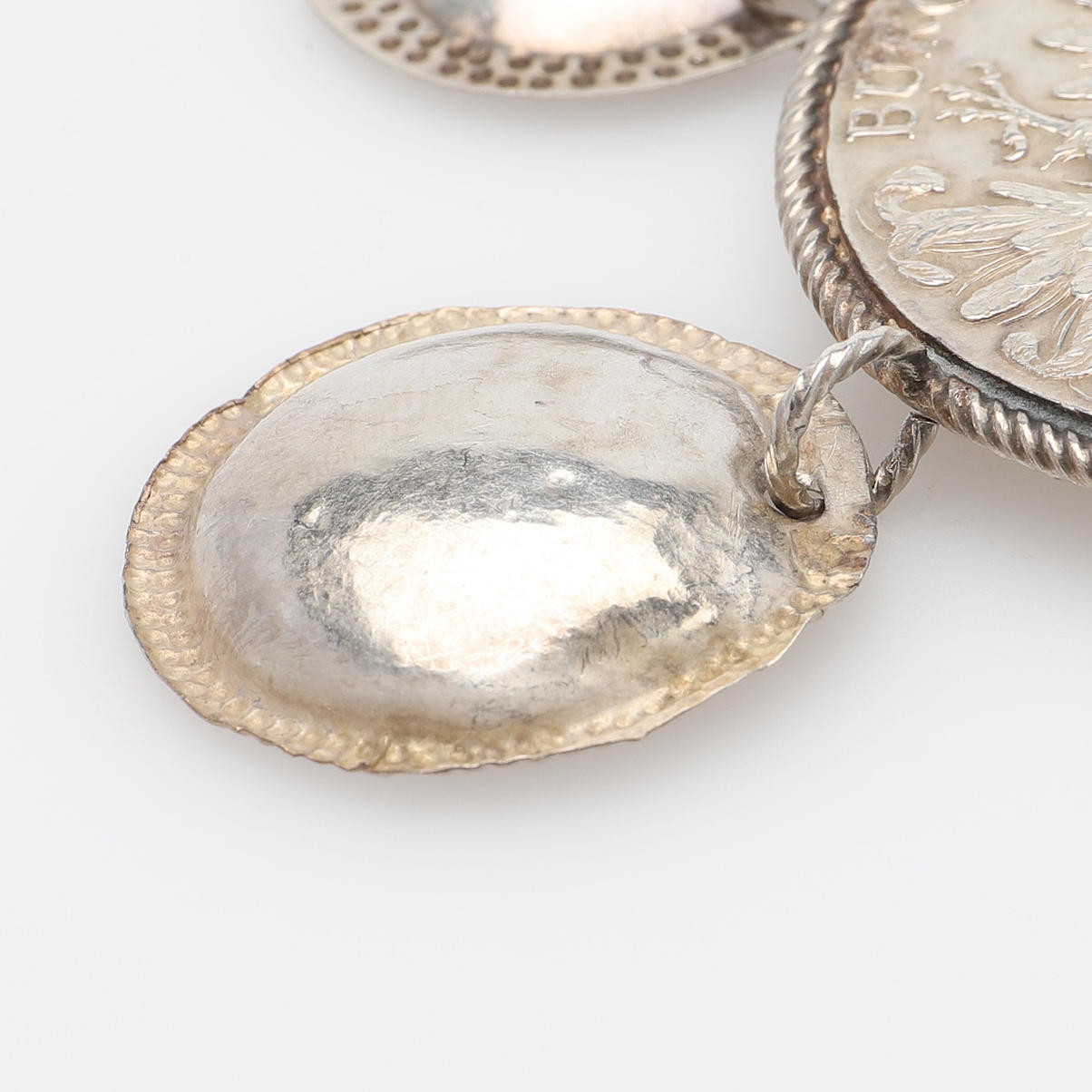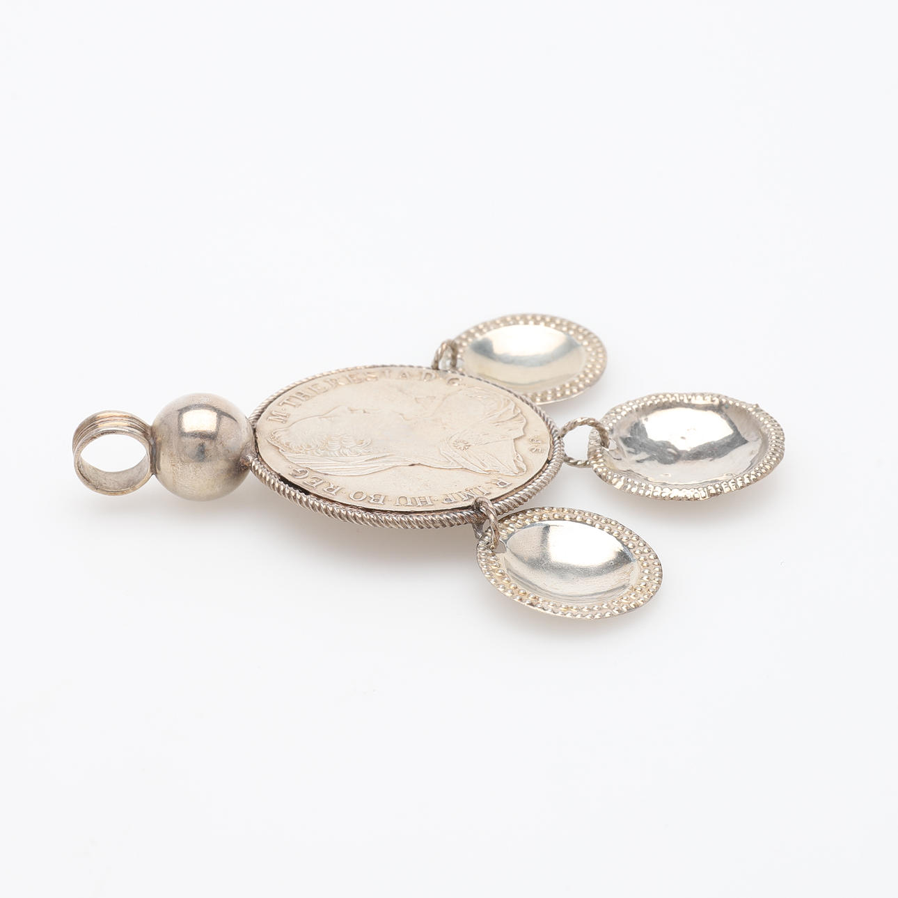 Silver, with framed Maria Theresa thaler and three hanging leaves, 19th century, height 9.5 cm.
