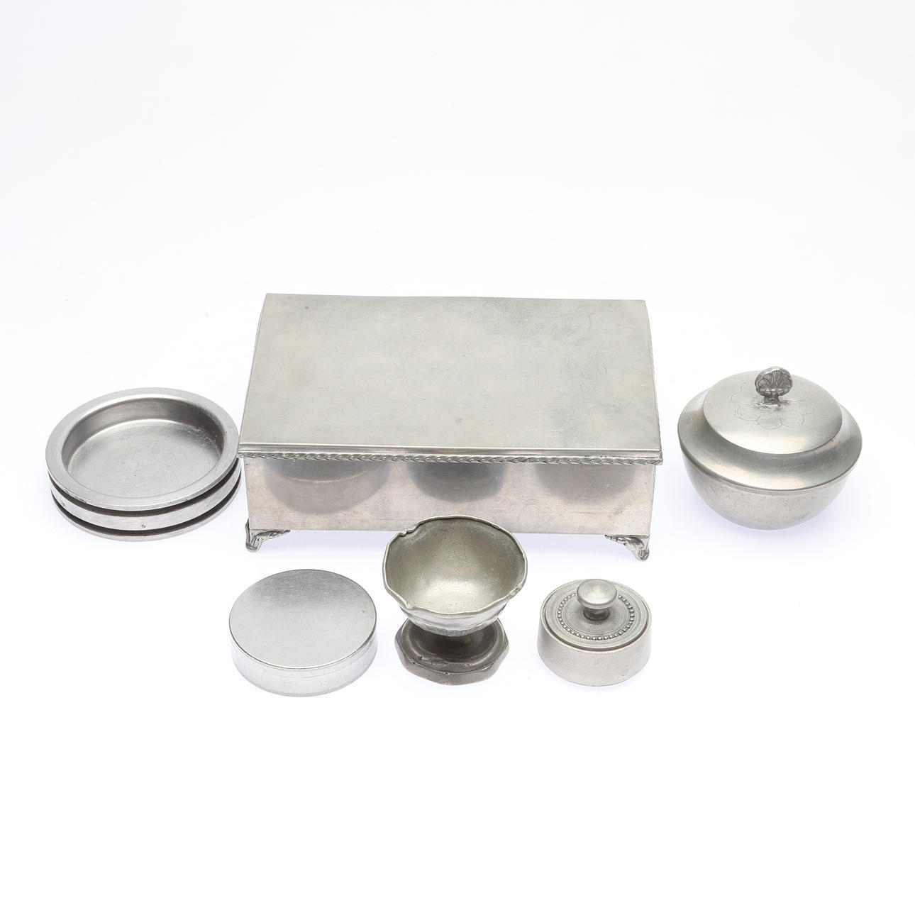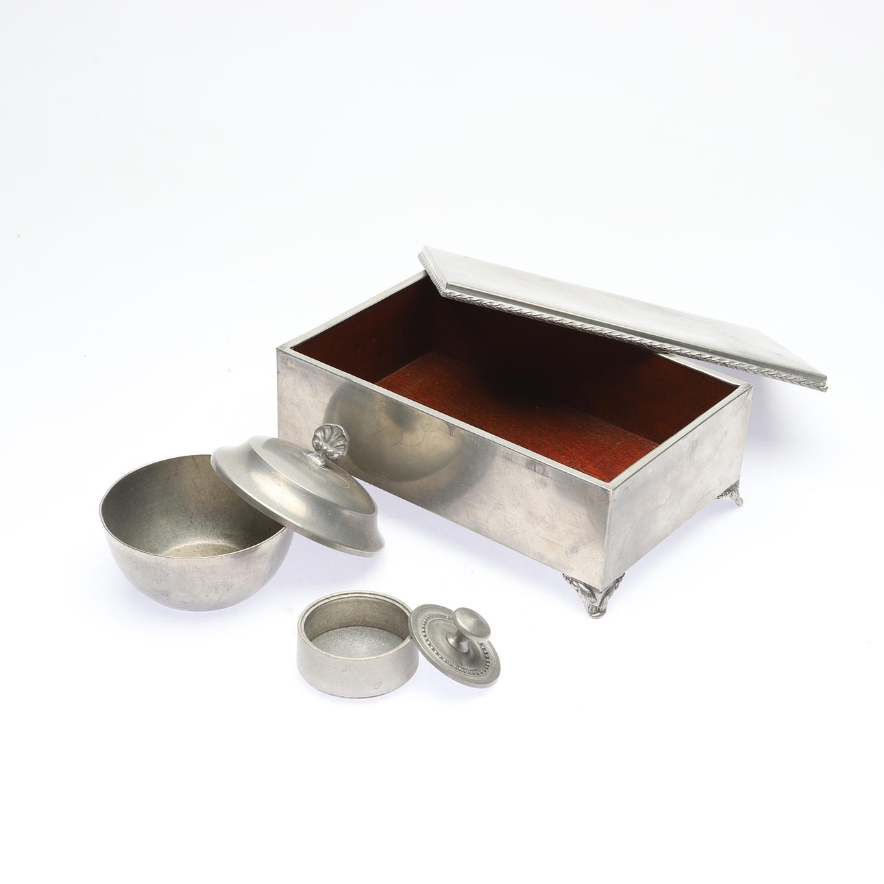 3080027. PEWTER OBJECTS, 6 parts, including boxes.