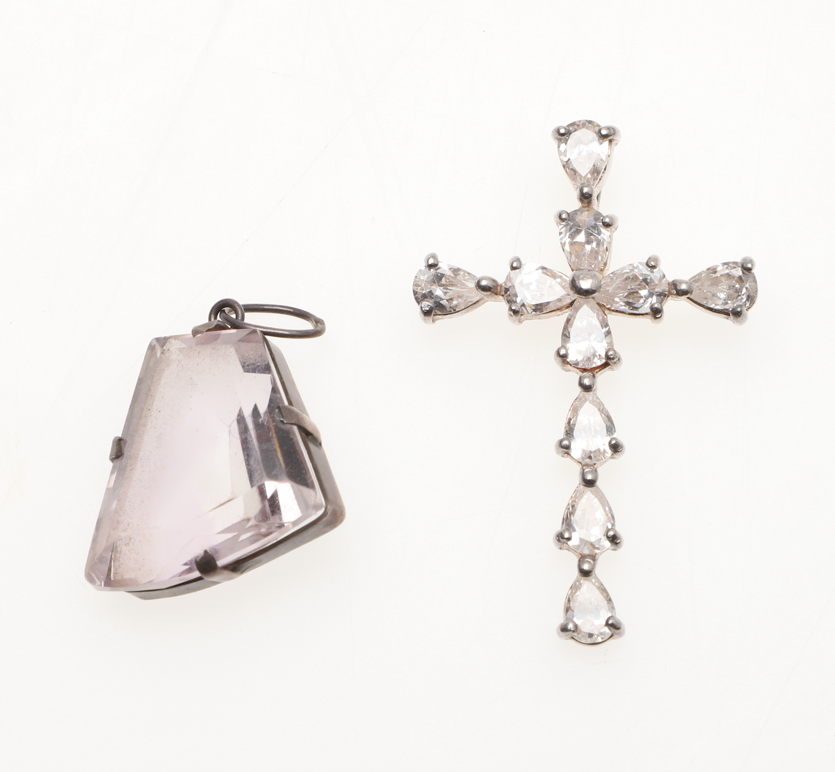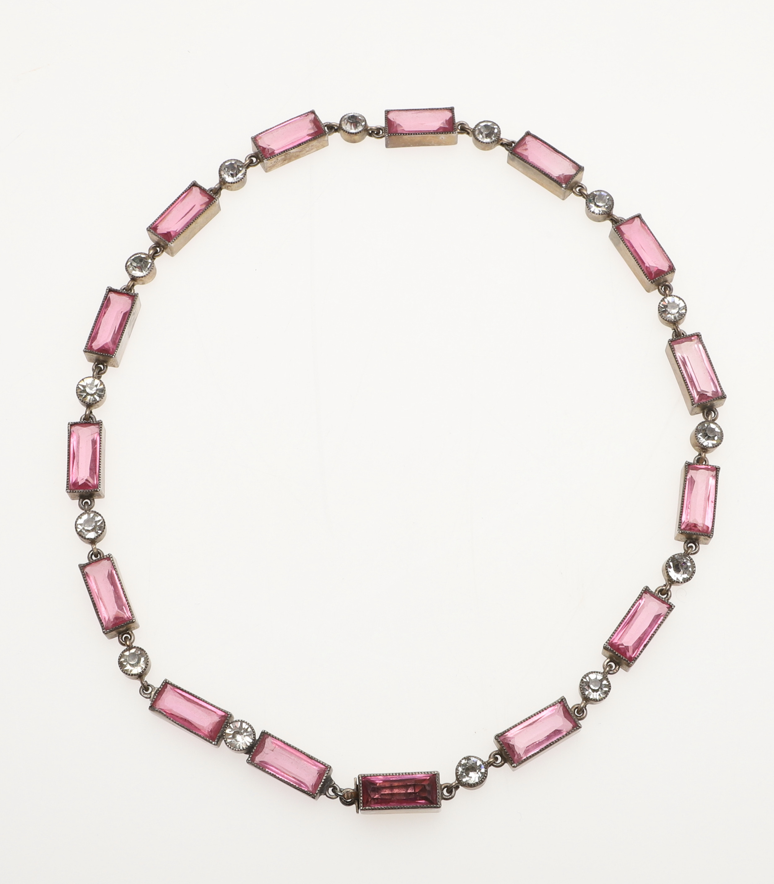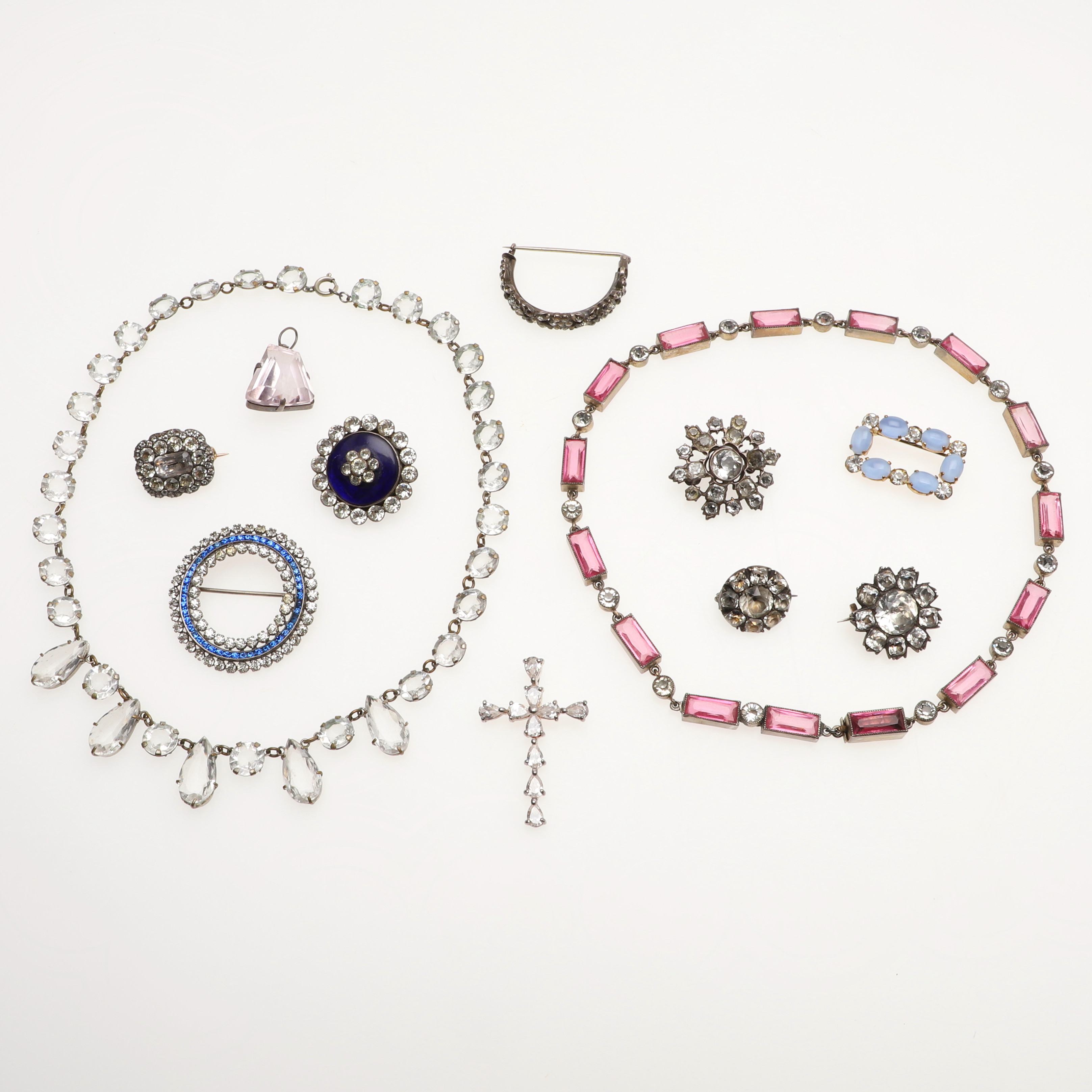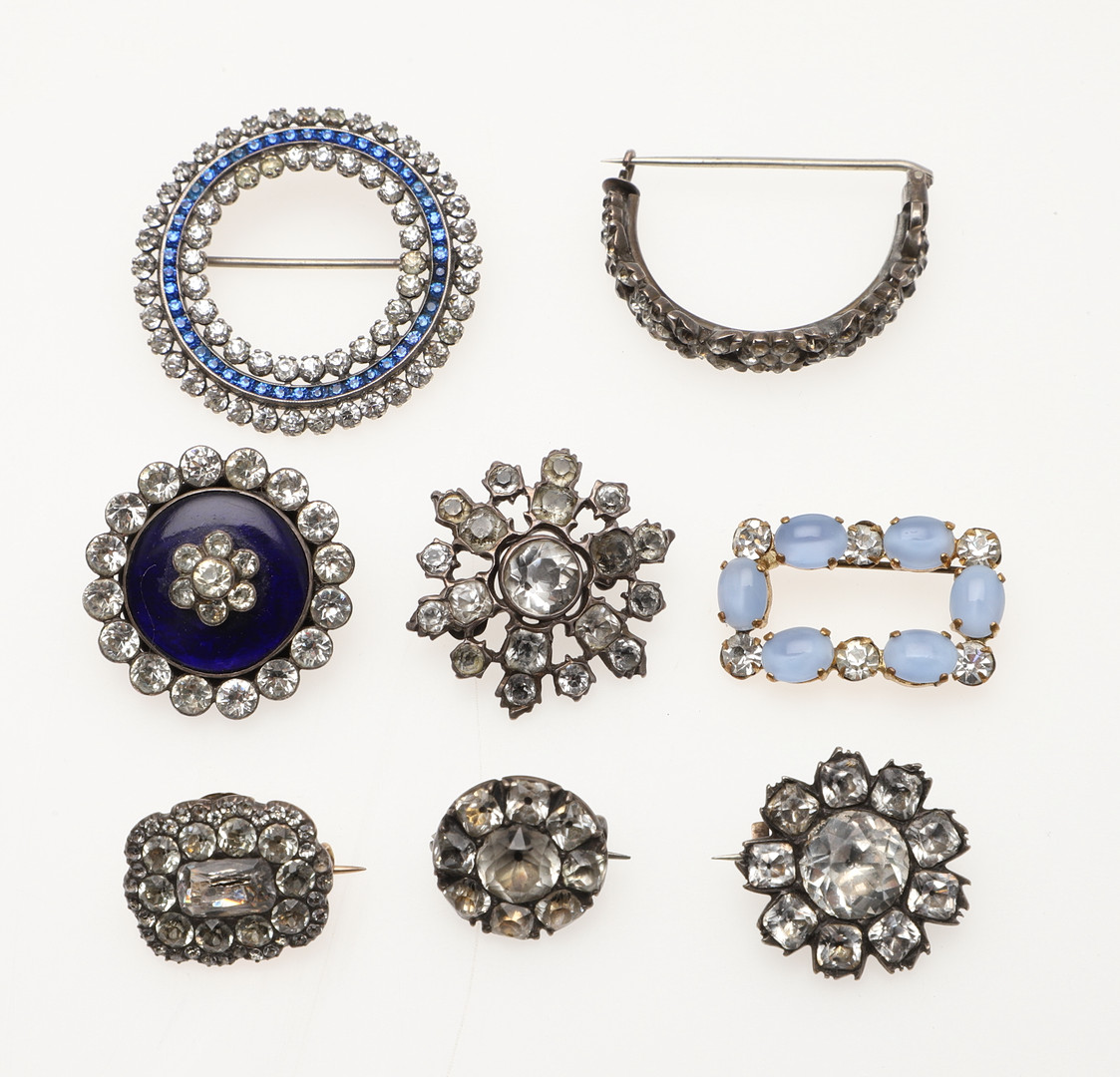 3082876. FIVE GEORGIAN SILVER AND PASTE BROOCHES, TWO PASTE NECKLACES ETC.