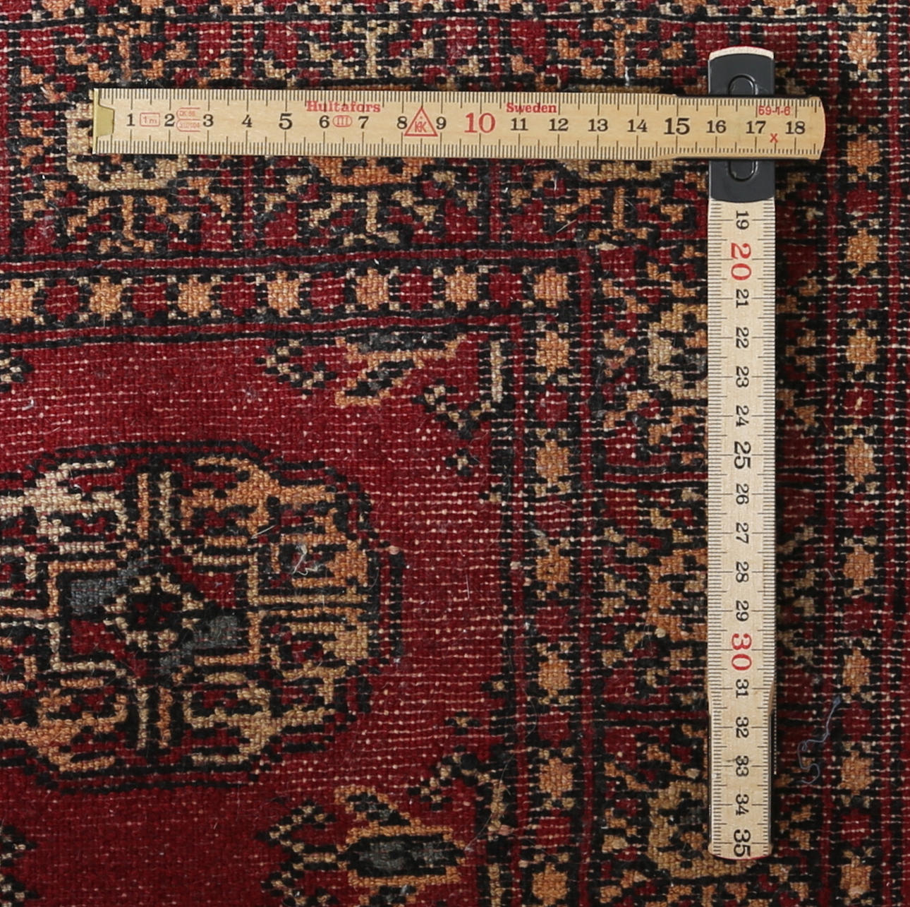 With geometric pattern, colors ranging from red and beige, labelled, 100% wool.