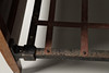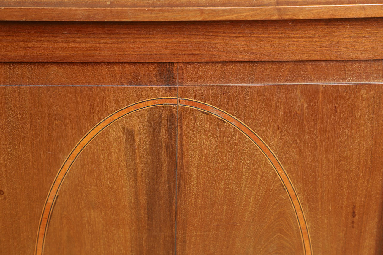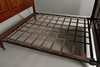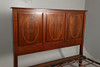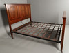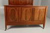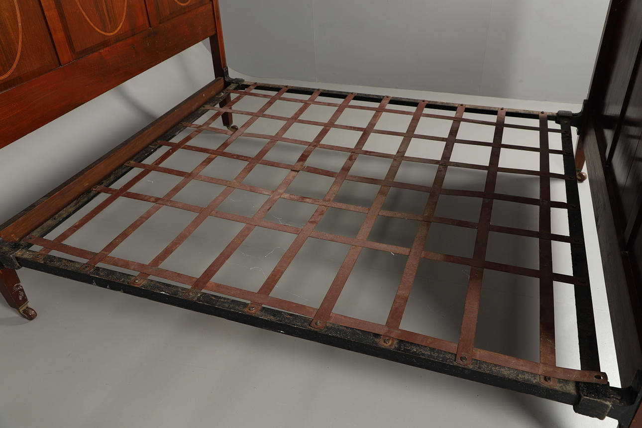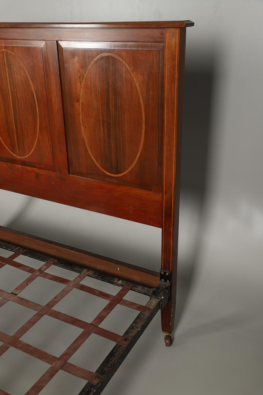 the panelled bed ends with decorative oval inlay on ceramic casters, the iron framed bas fitting a 5ft mattress.