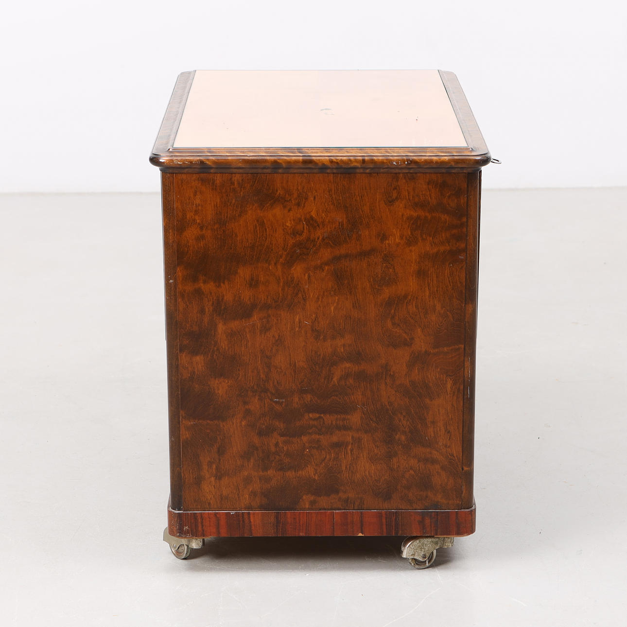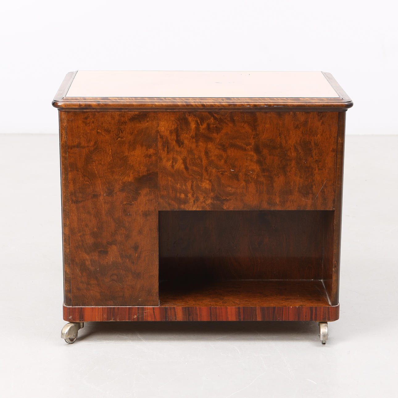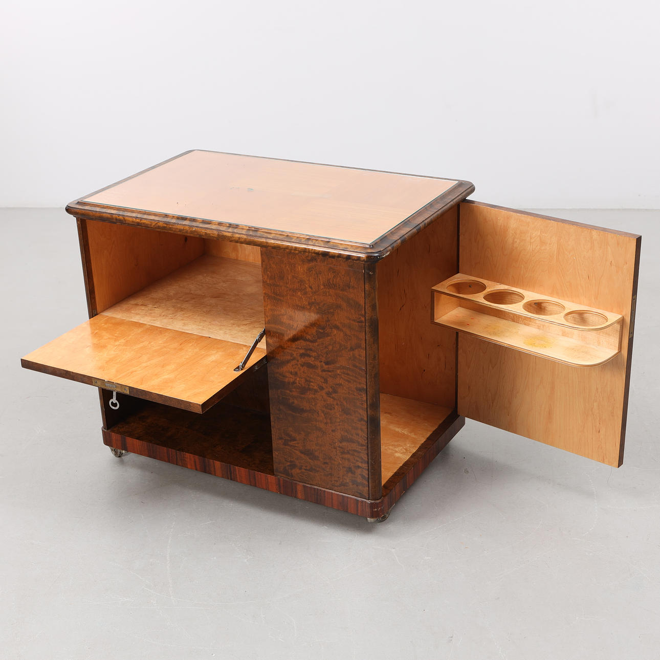 Cabinet with bottle storage behind door, door and shelf. Glazed disc. On wheels. 67x43.5, height 58 cm.