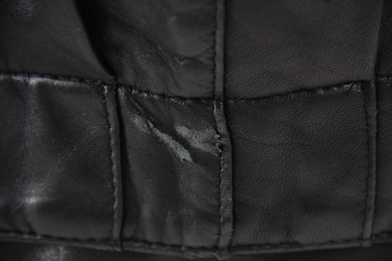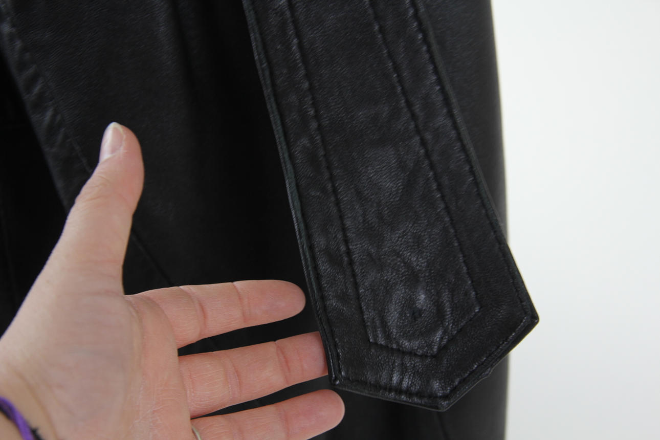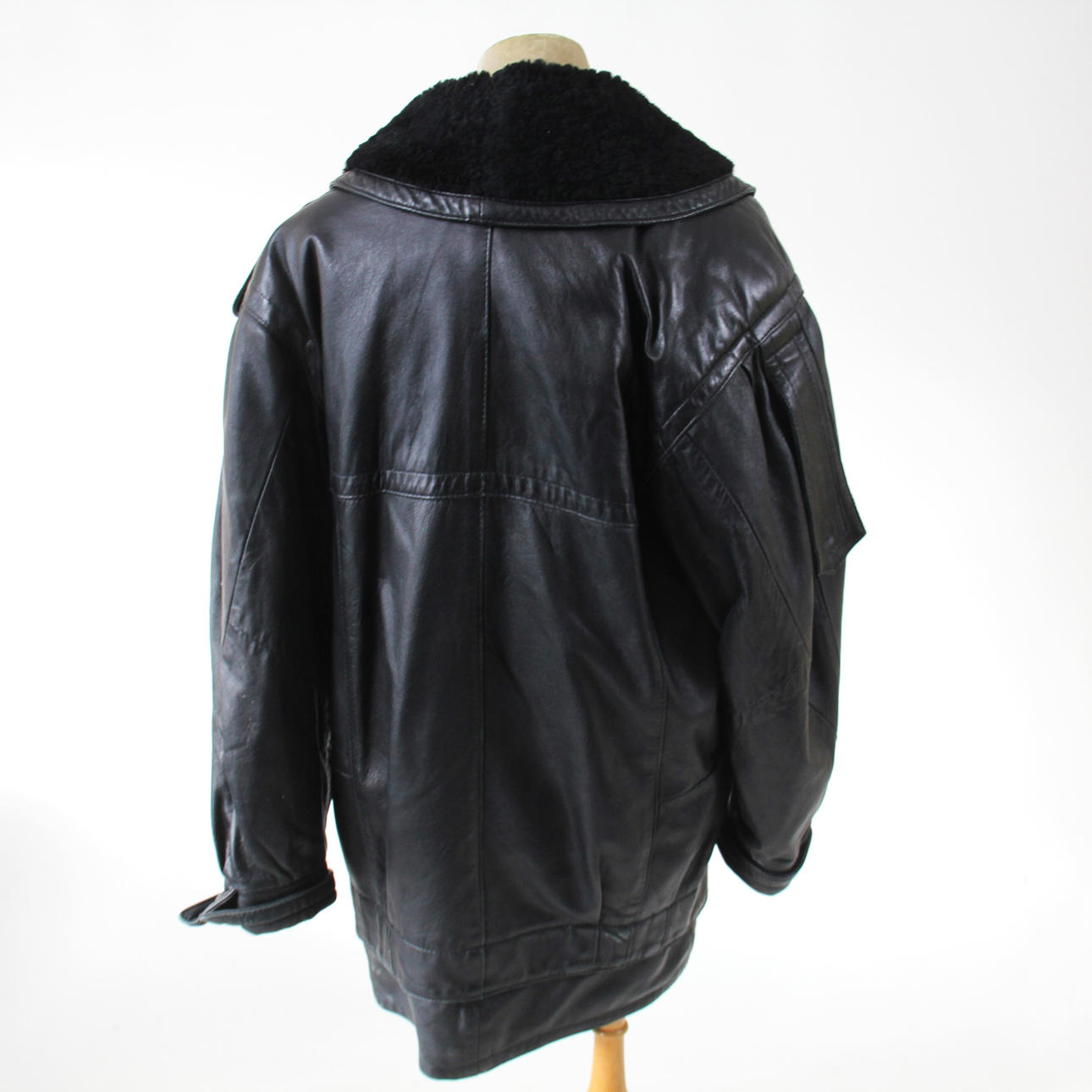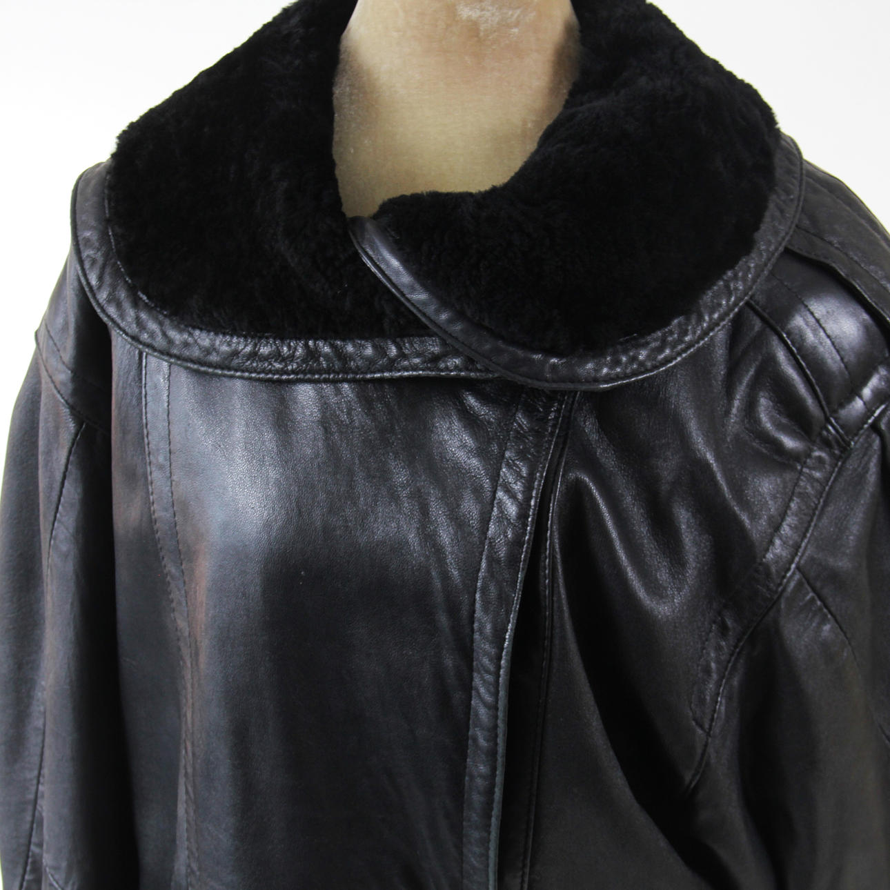 A woman's 1970's Toto London leather coat with a lambs wool collar, shoulder to shoulder 53cm. L. 86cm.