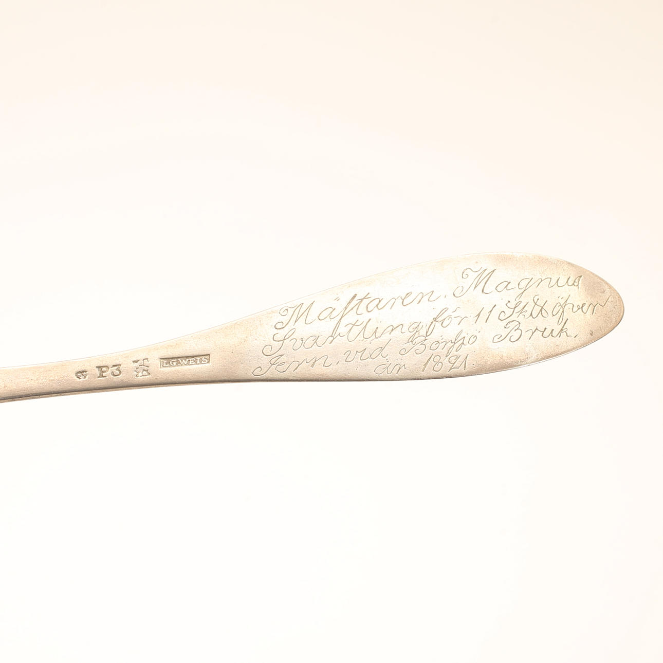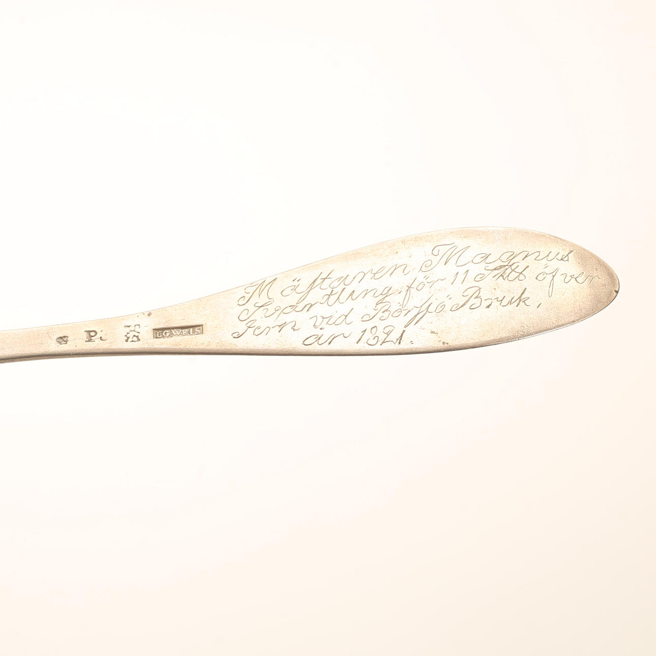 Inscription; "Master Svartling for 11 Skp Öfverjärn at Börsjö Bruk in 1821". Length approx. 22.5 cm, weight together approx. 187g.