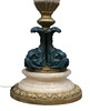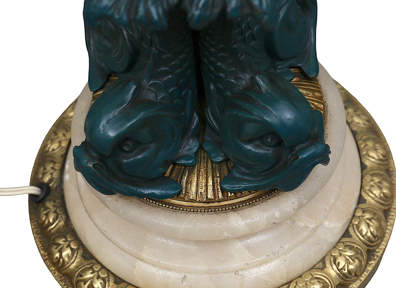 At the base, dolphins with green patina