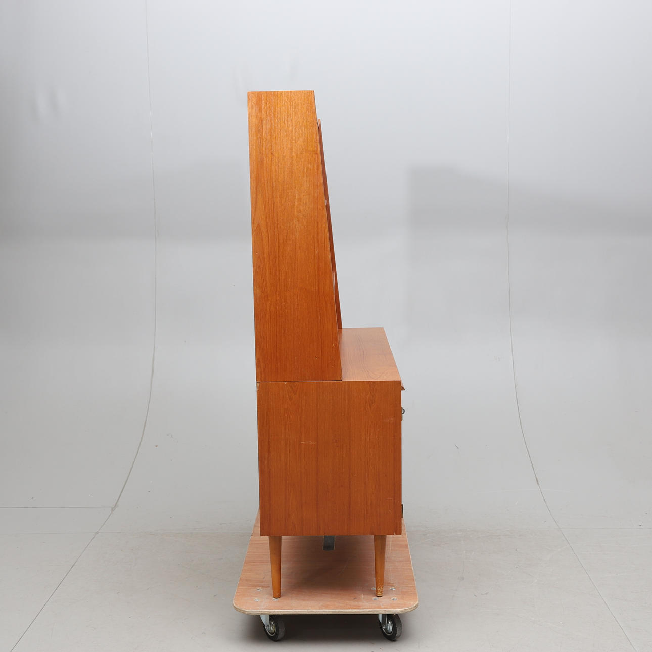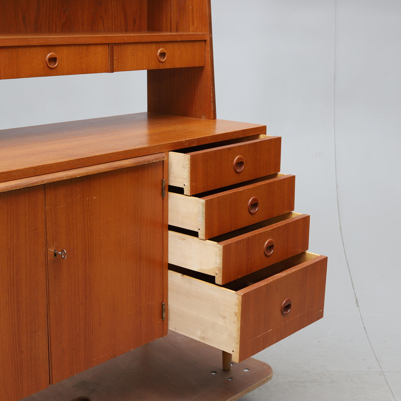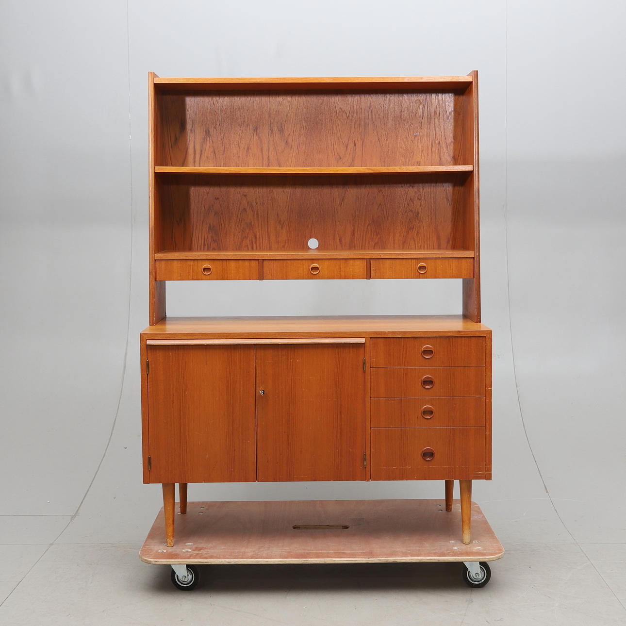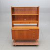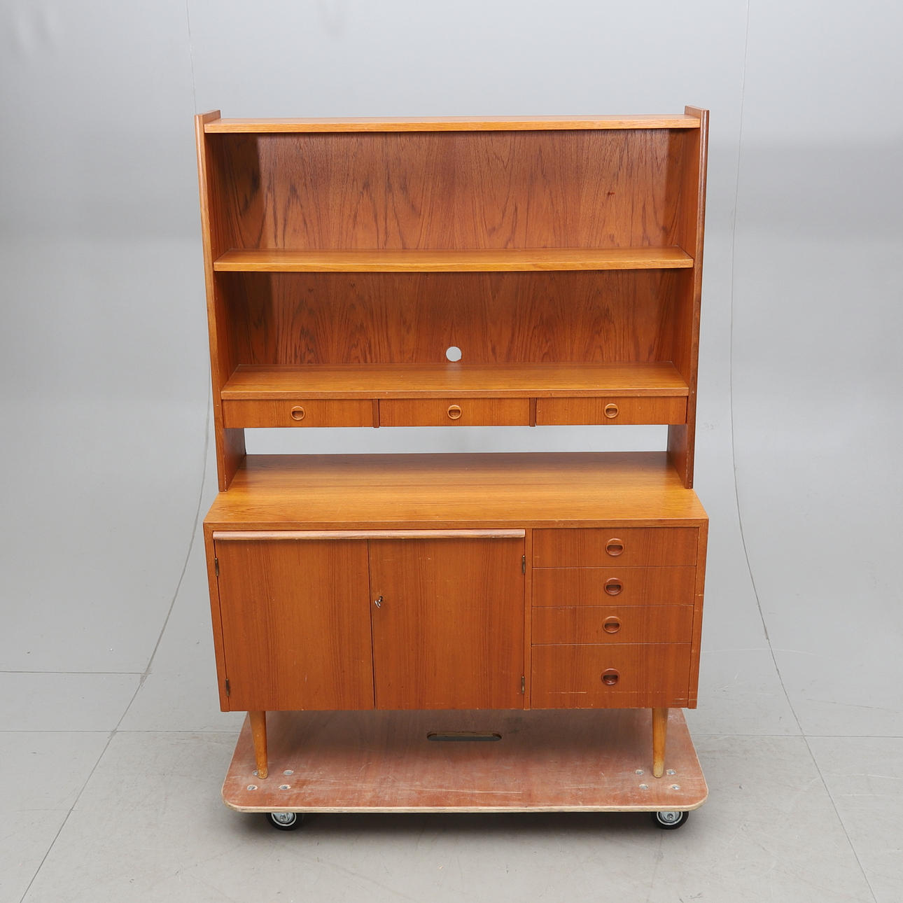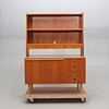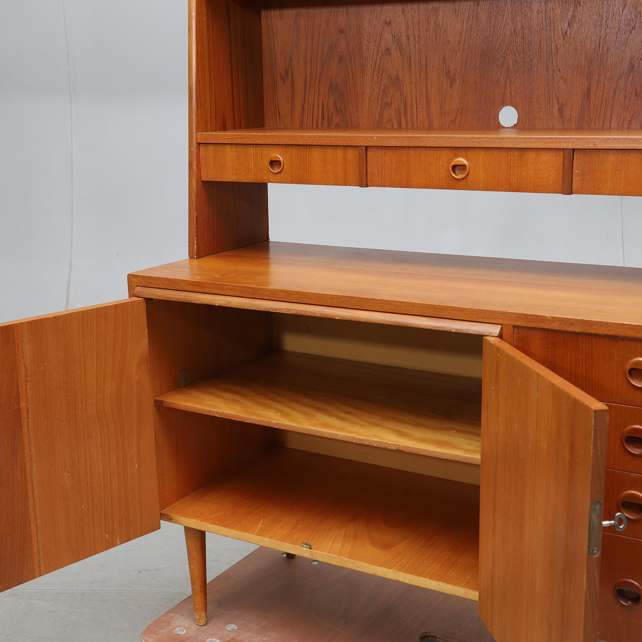 Veneered with teak. Two-piece. Upper part with shelf and 3 drawers. Lower part with pull-out writing board, 4 drawers and cabinet with underlying shelf.