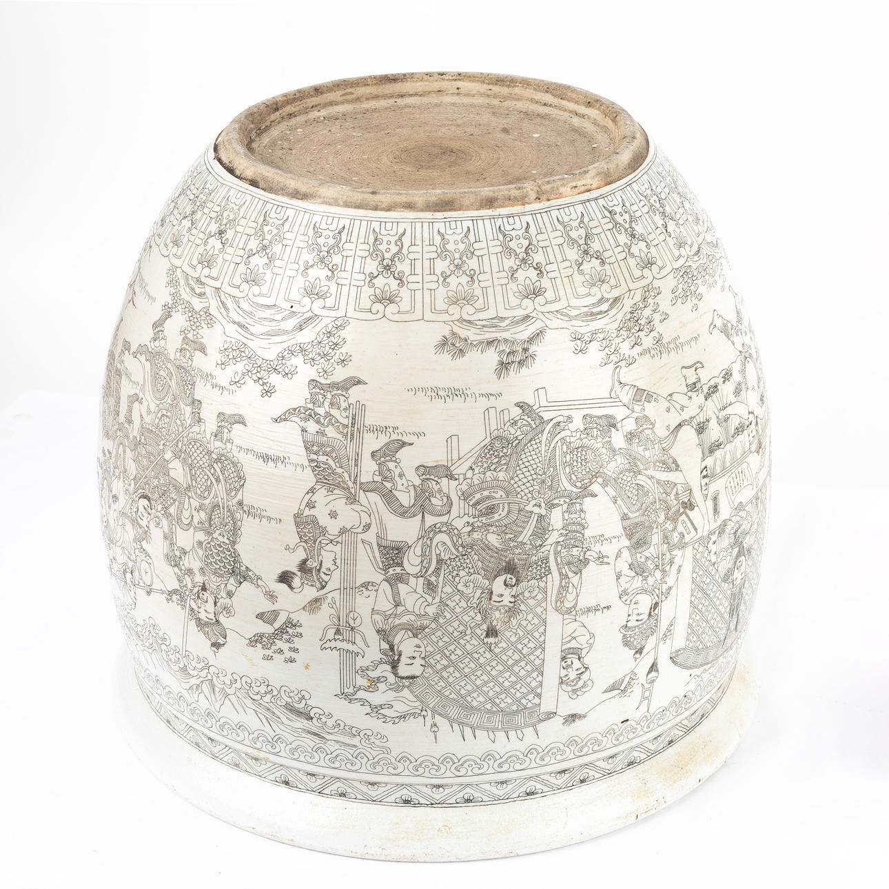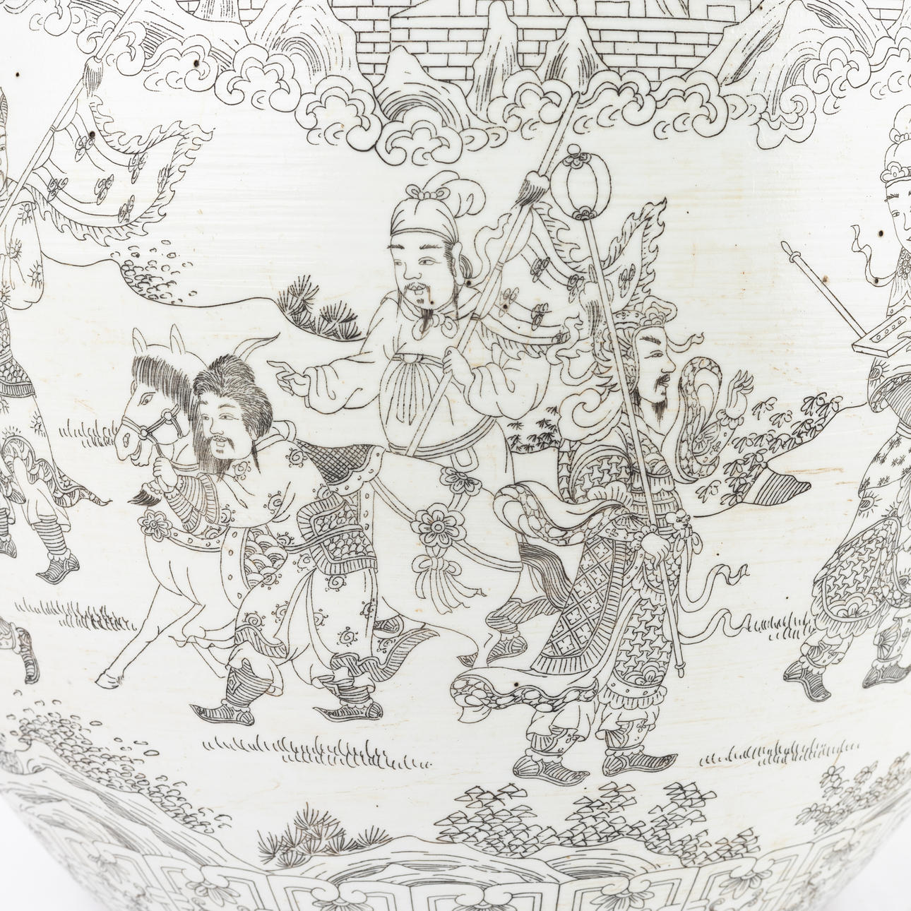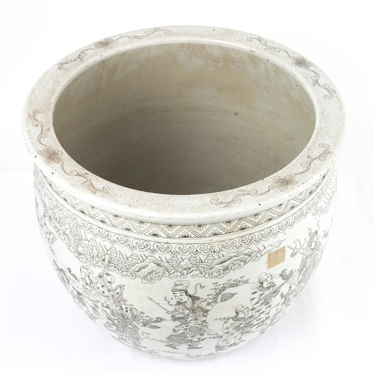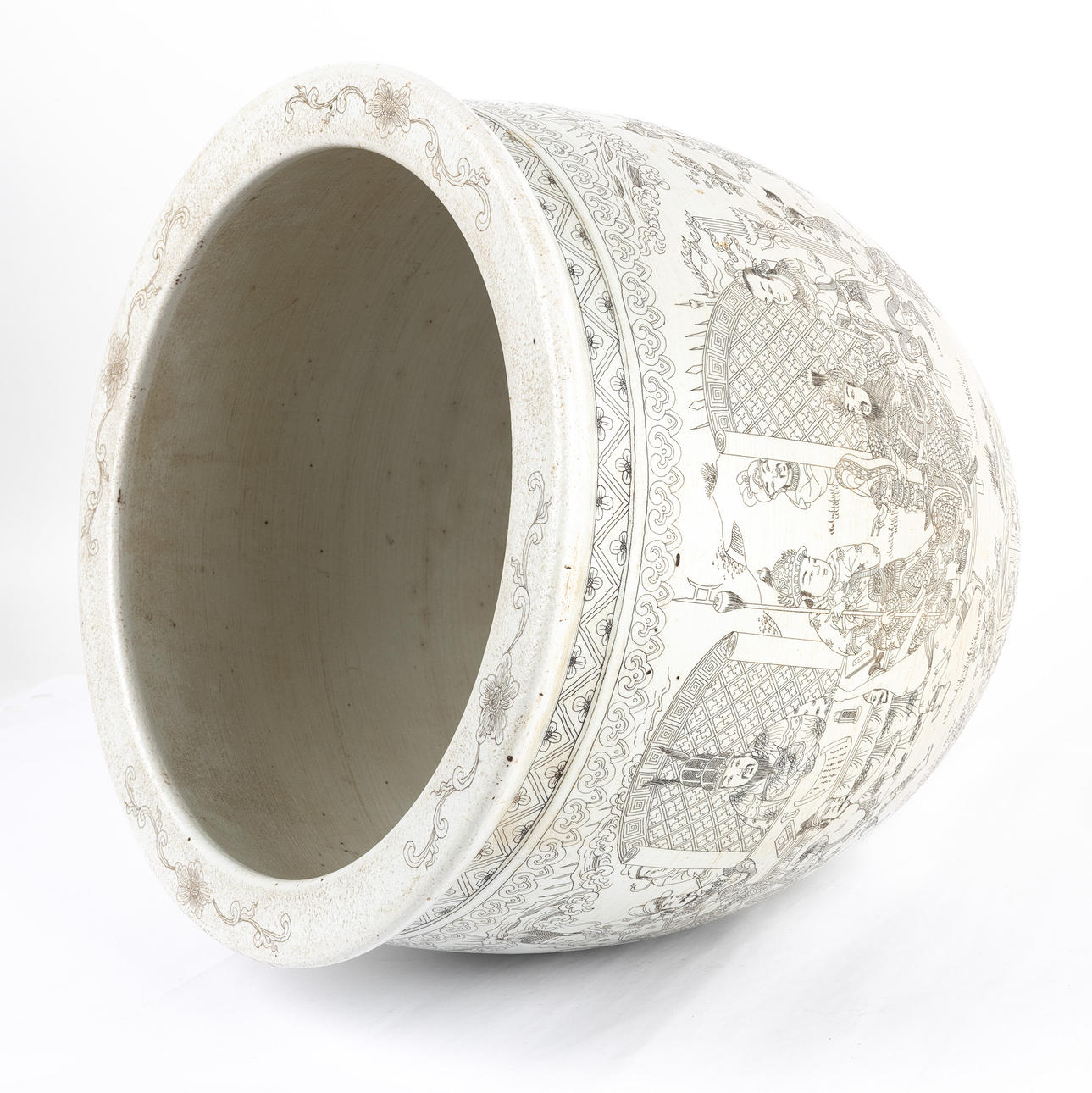 White glazed and with figure scenes in sepia representing warriors, diam 38, height 34 cm.
