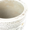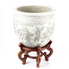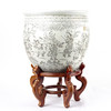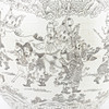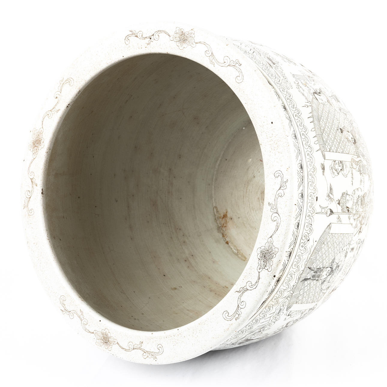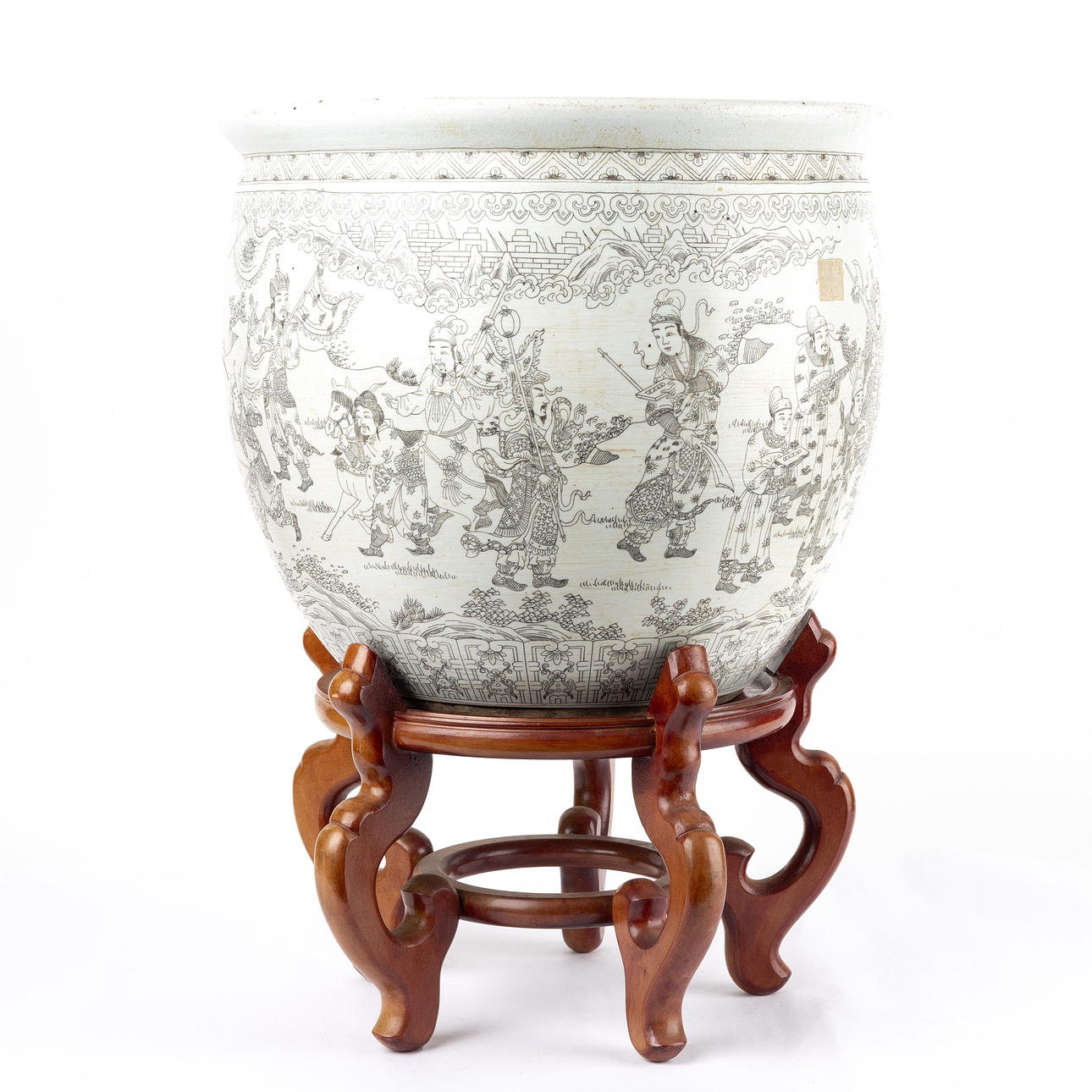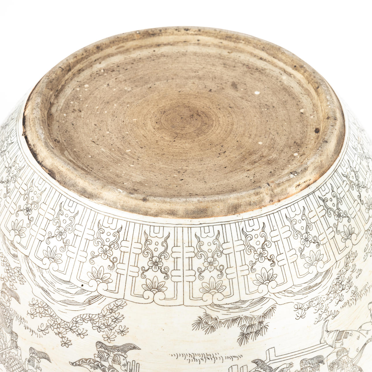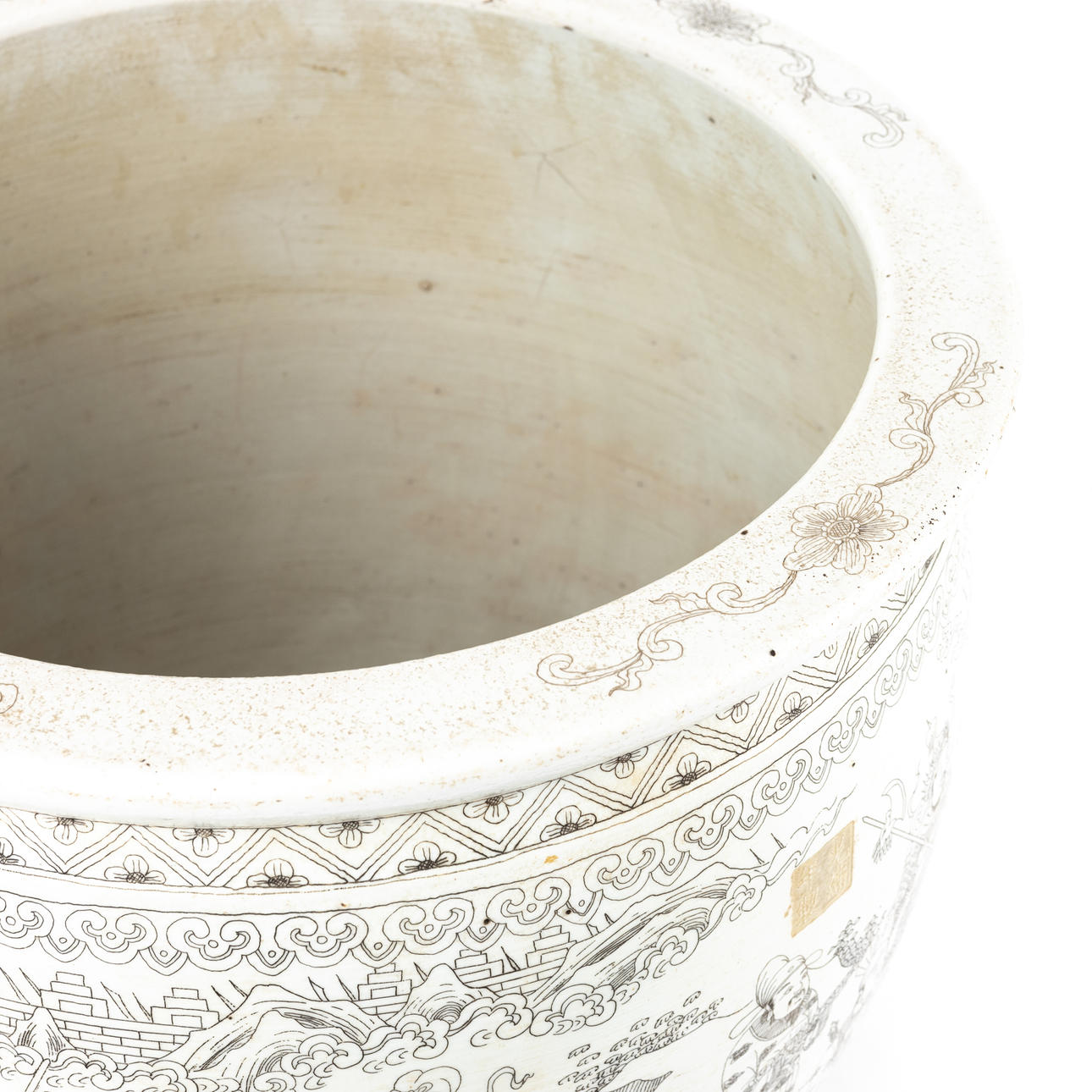 White glazed and with figure scenes in sepia representing warriors, diam 38, height 34 cm.