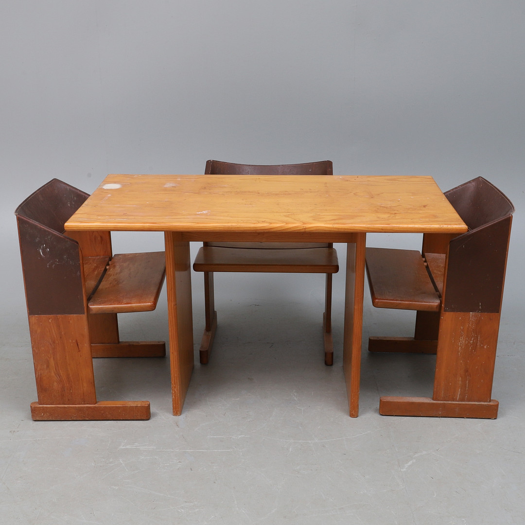 3109209. A RETRO PINE KITCHEN TABLE AND THREE MATCHING CHAIRS.