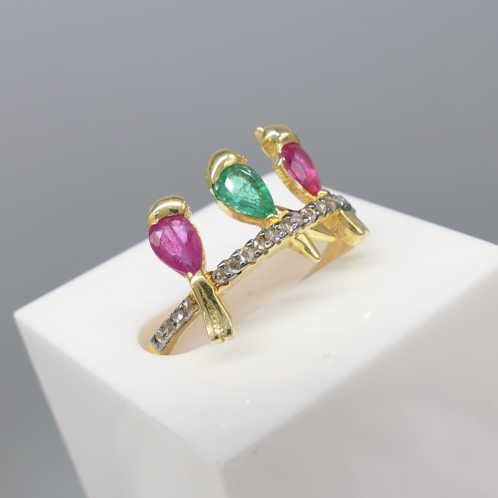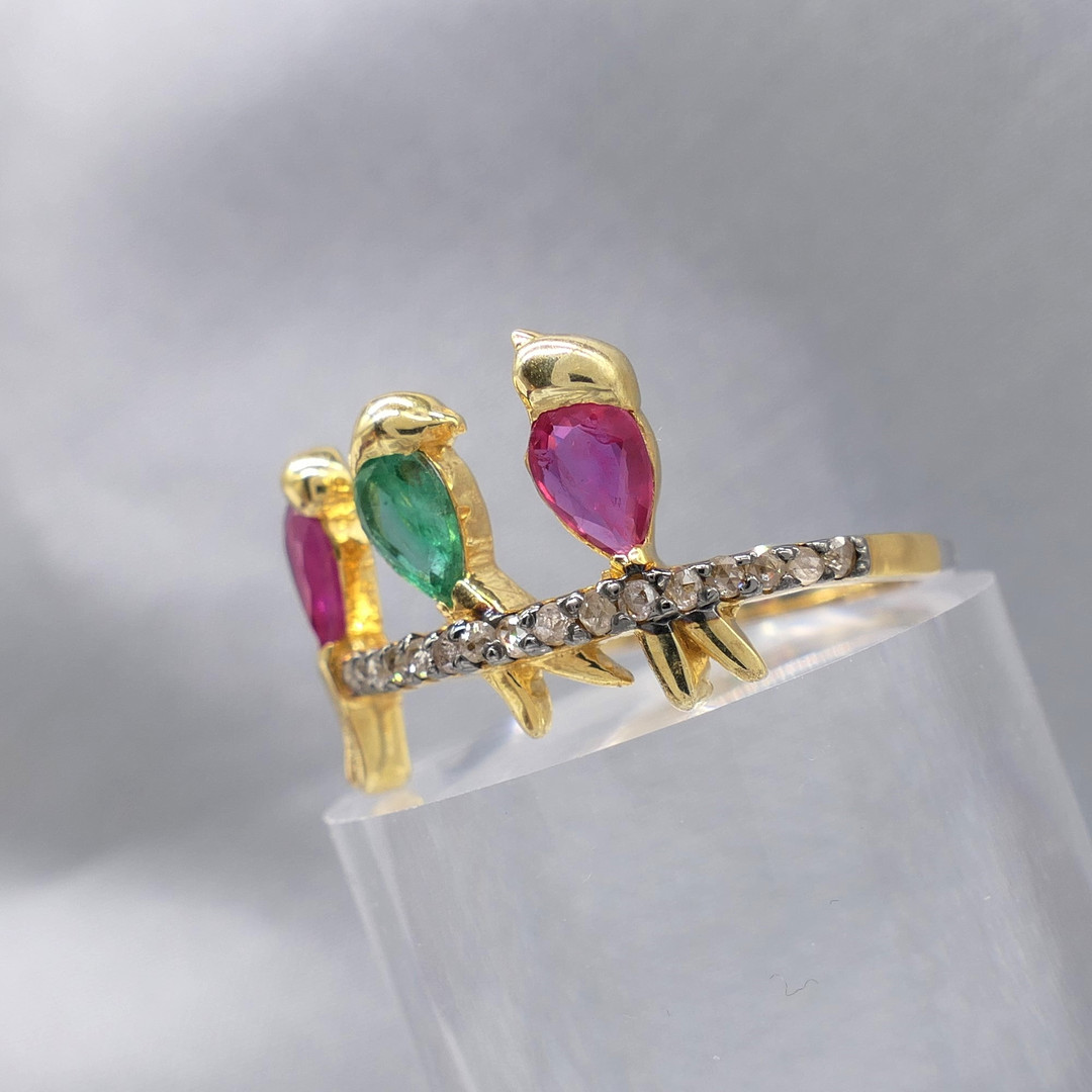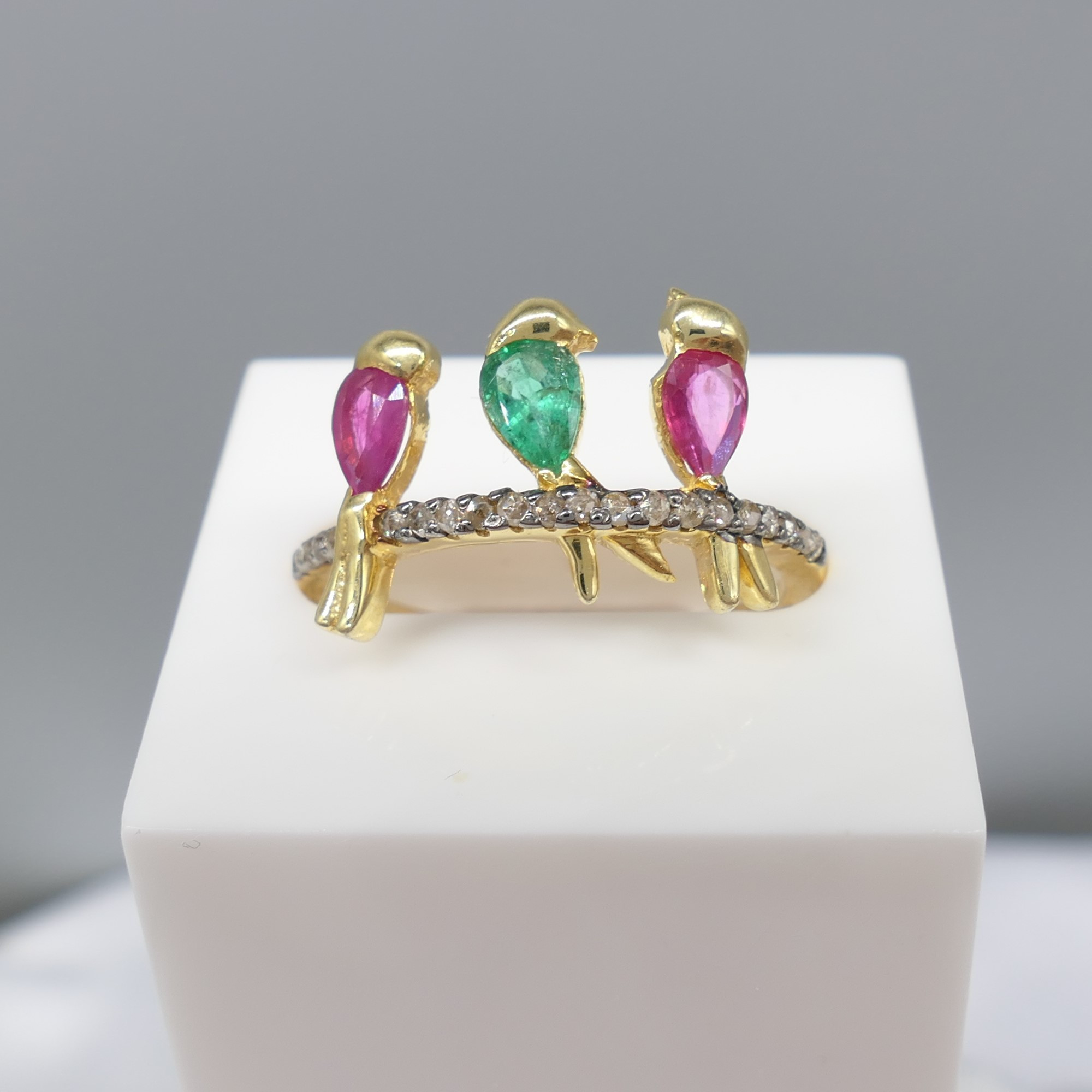 3109472. RUBY, EMERALD & DIAMOND love birds ring.