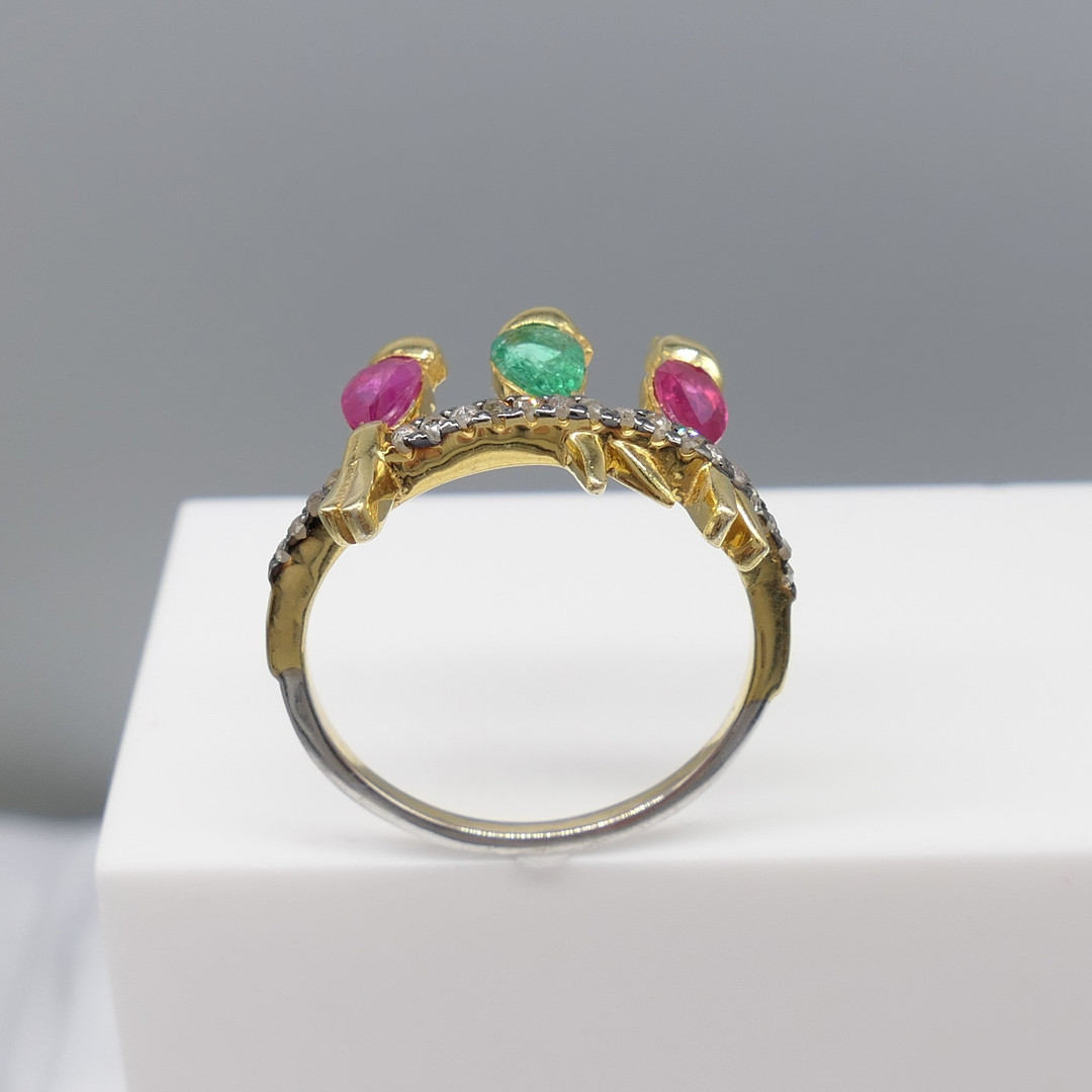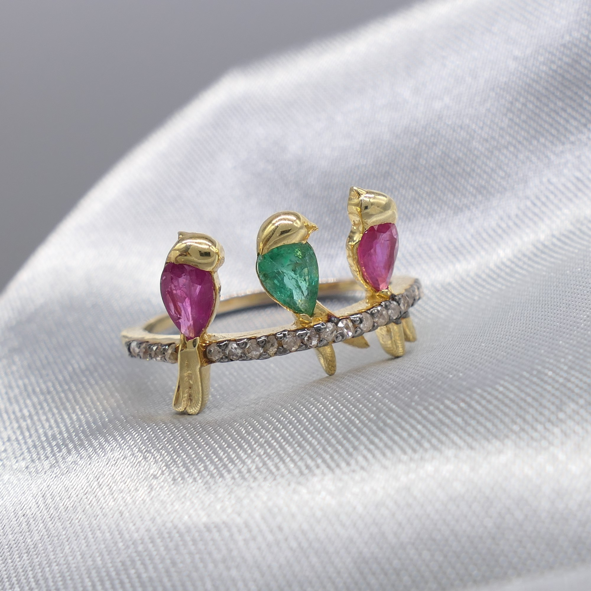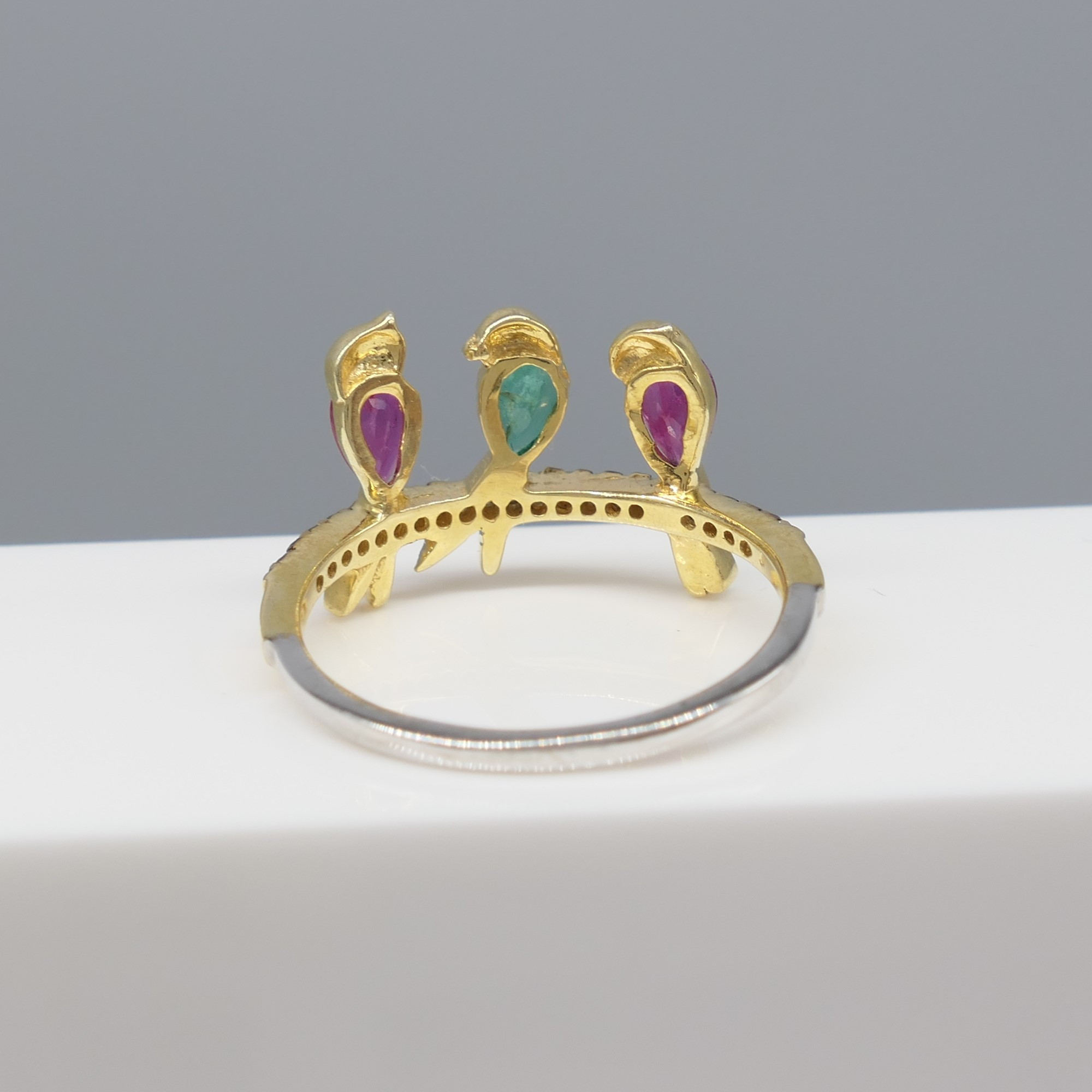 3109472. RUBY, EMERALD & DIAMOND love birds ring.