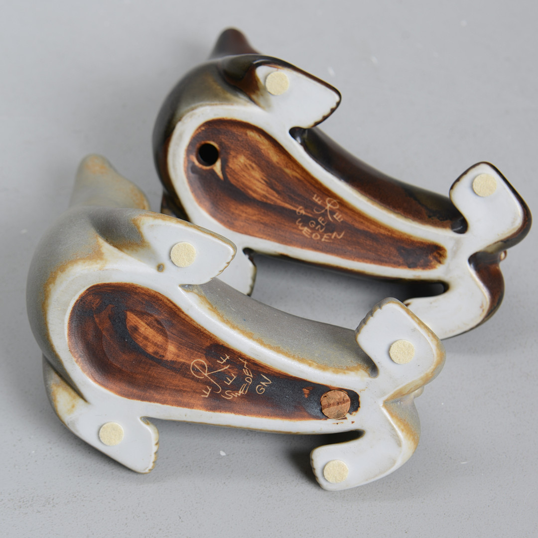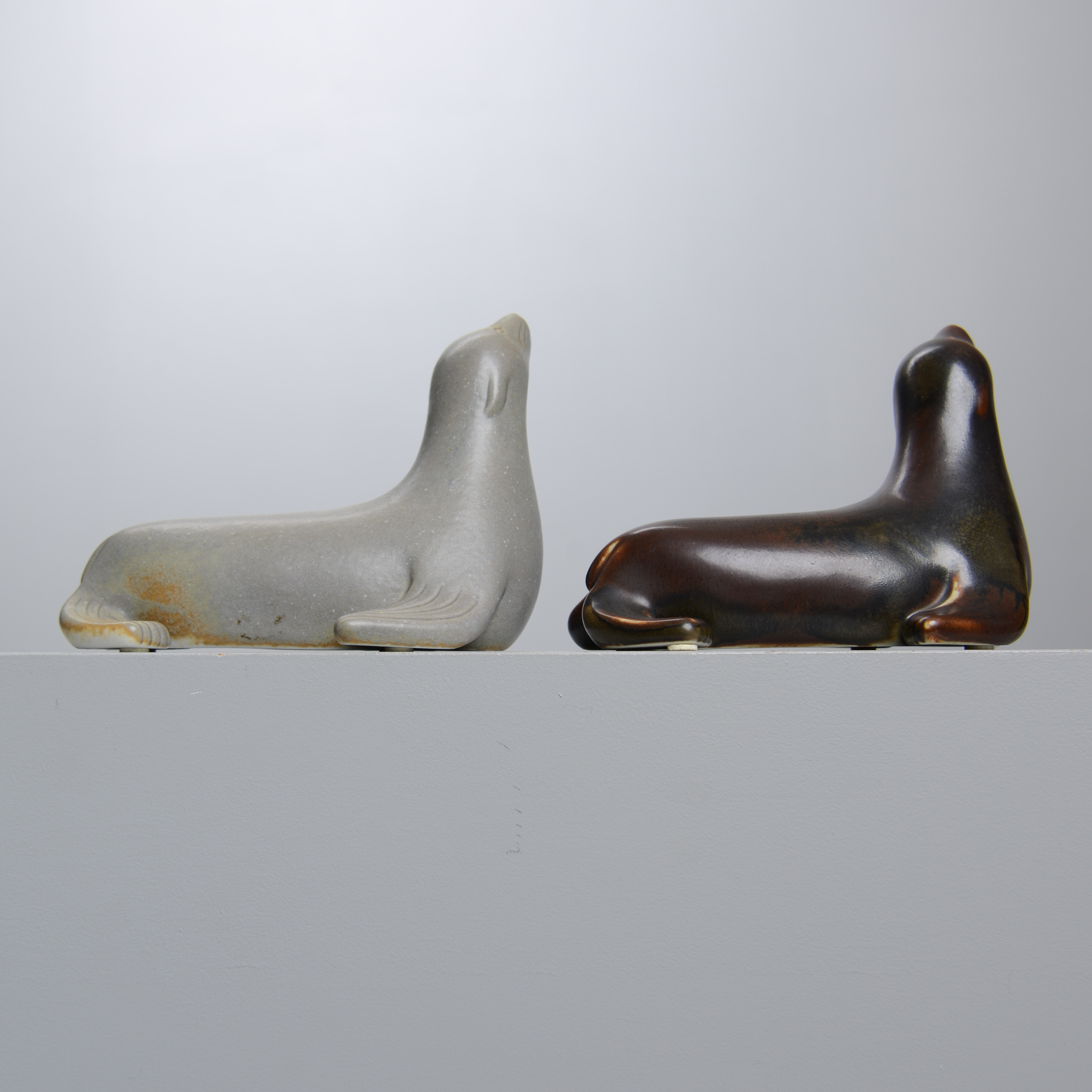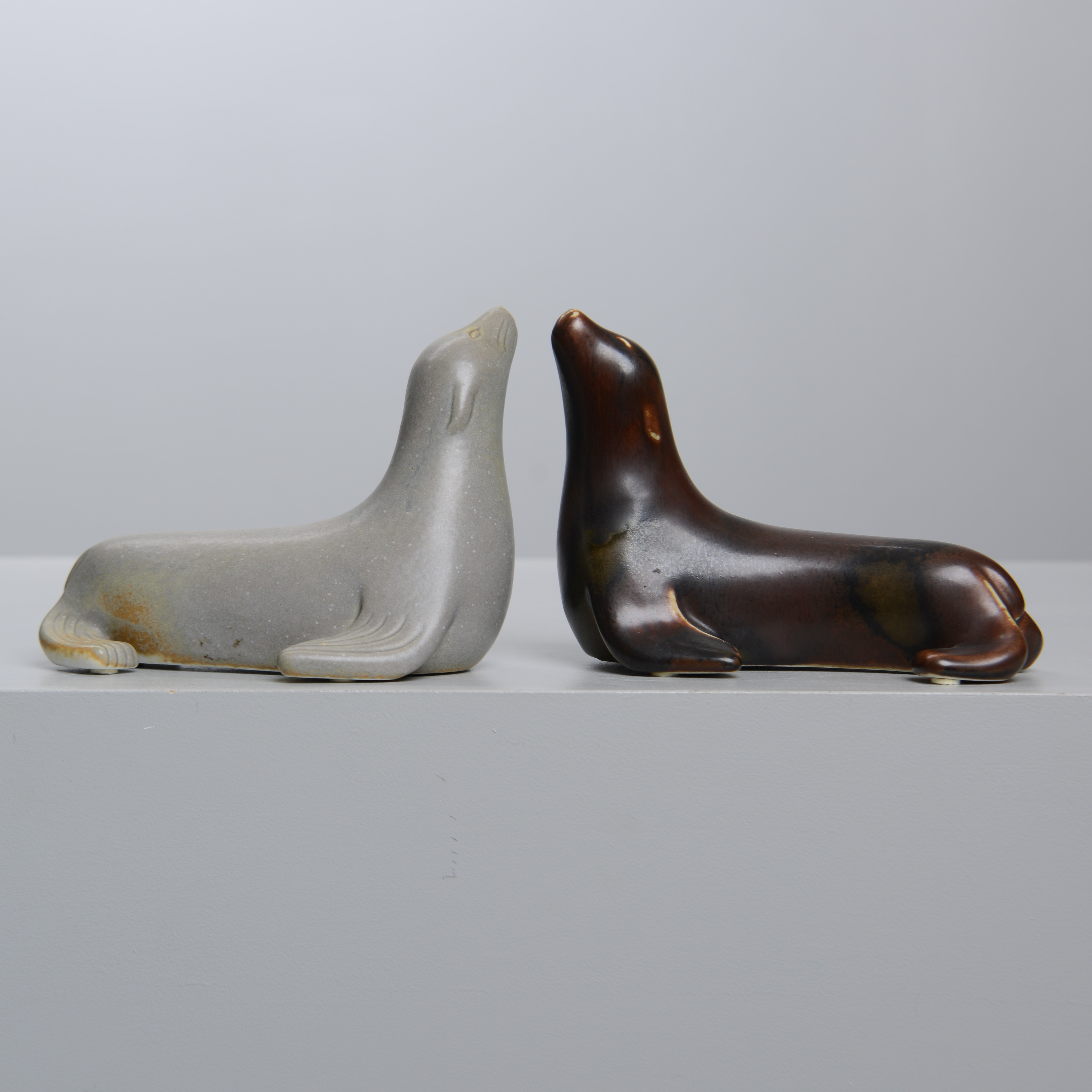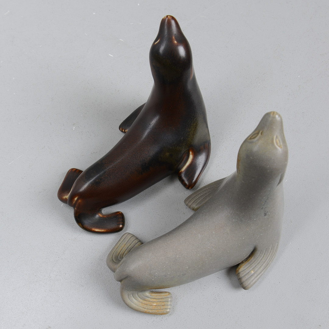 3109557. GUNNAR NYLUND. Two stone sea lions, Rörstrand, monogram signed.