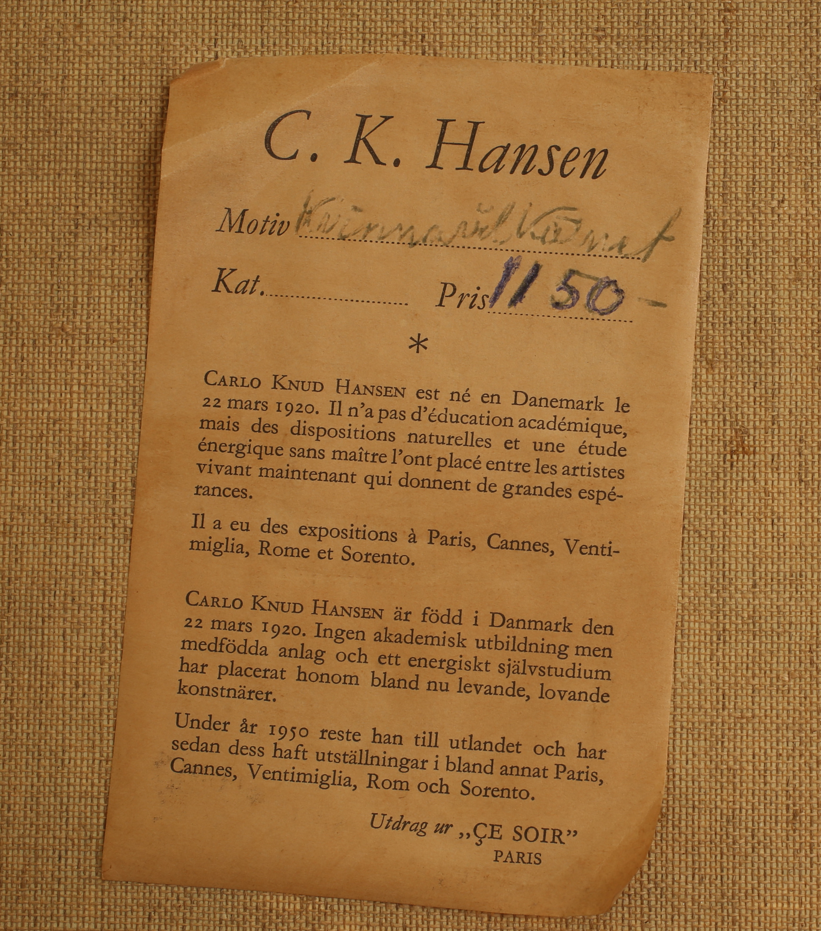 3111048. CARLO KNUD HANSEN. Oil on canvas, signed.