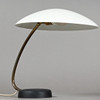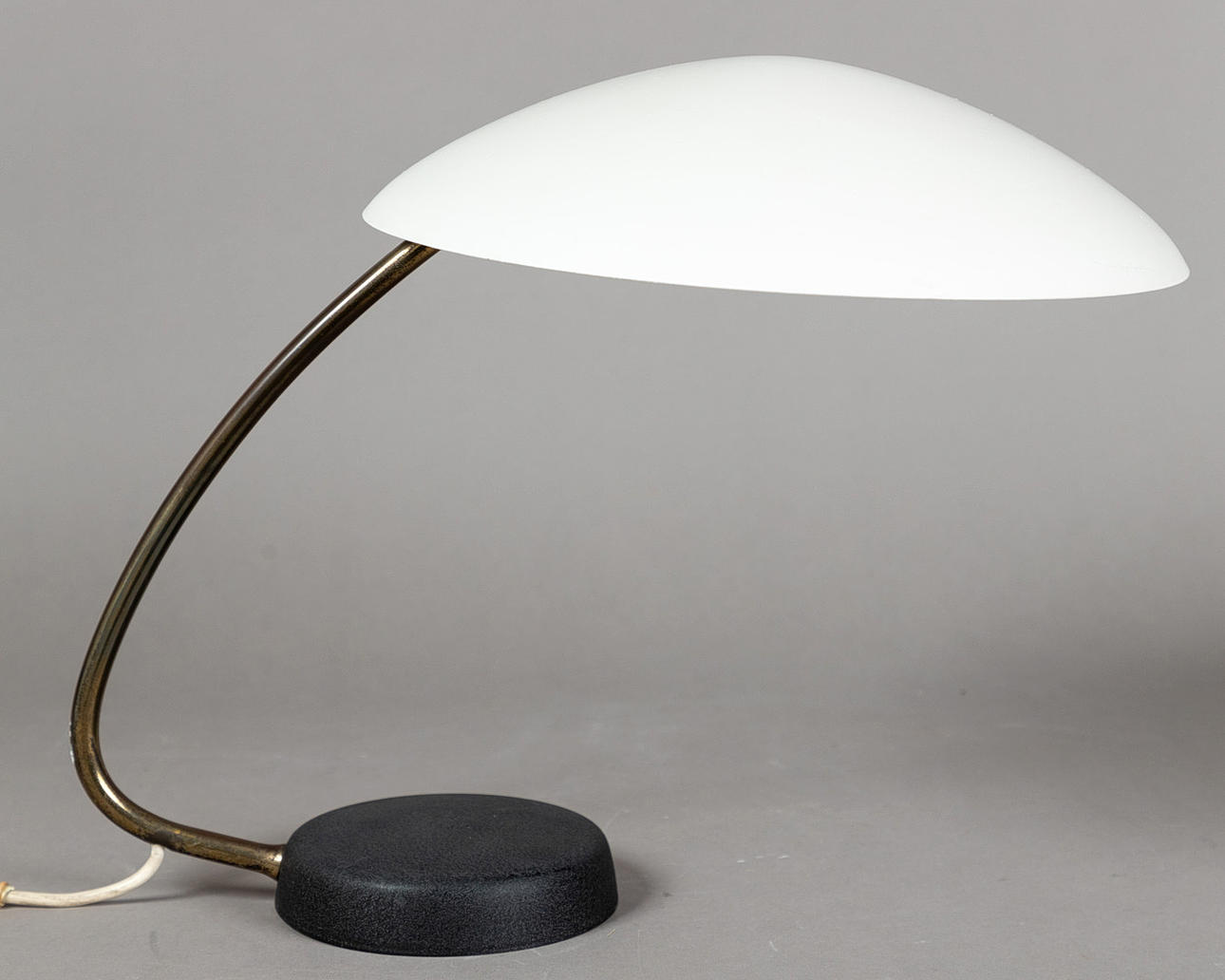'Model 7675' table lamp by Jürgen Cosack for Cosack. Germany, 1950s. Ivory-white metal shade on a brass lamp stem and a black metal base. 1 burner, E27 socket.