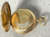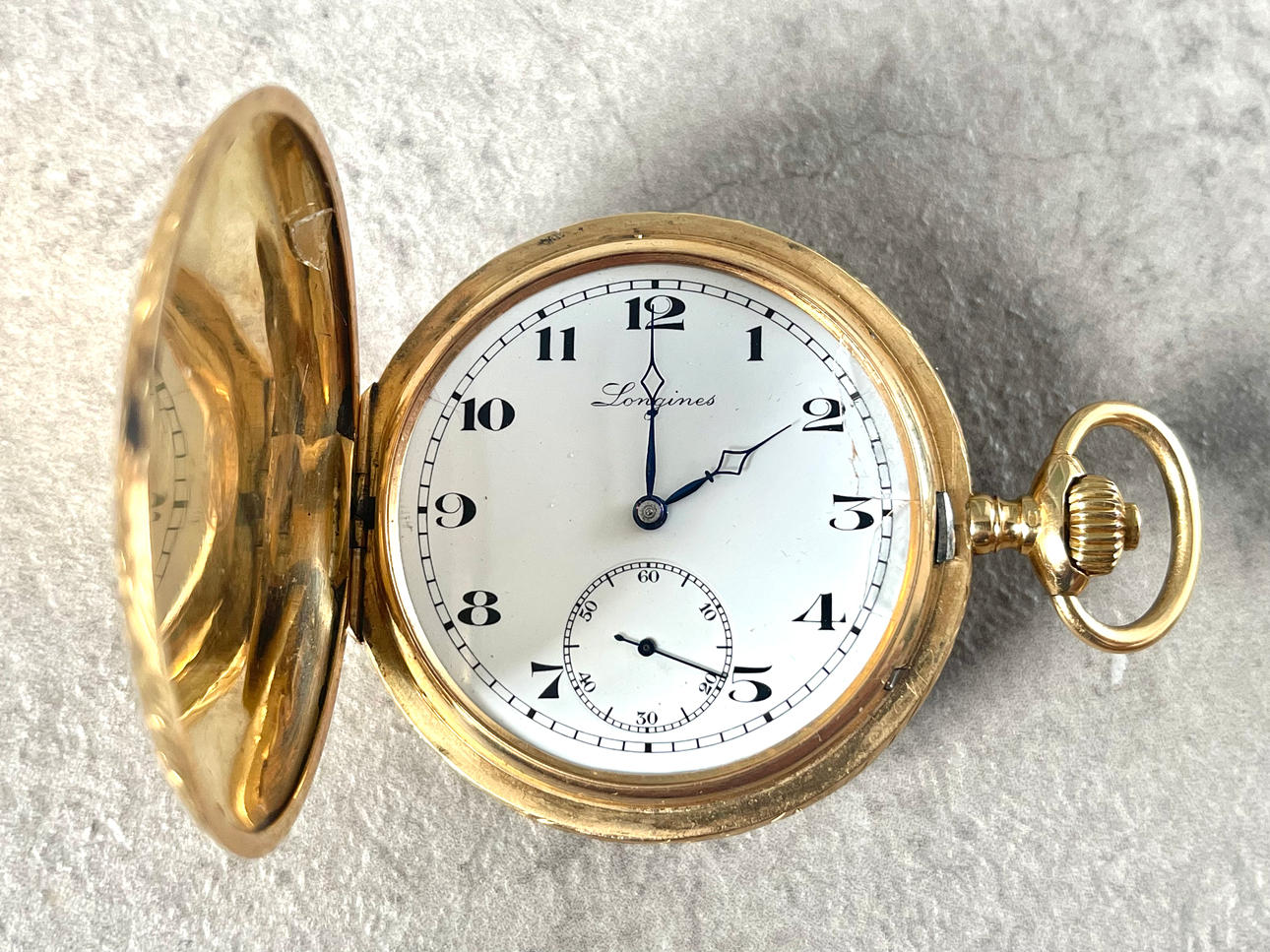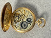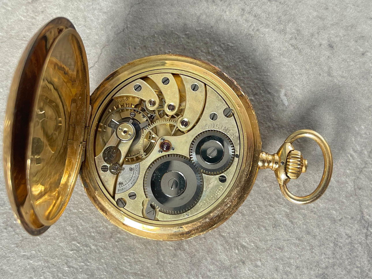 18k gold case with approx. 59mm in diameter. Box with three chiseled covers. Brass machine. Porcelain dial with micro seconds at six. Manual winding. Total weight 95.35gr. Approximate years 1920-1930.