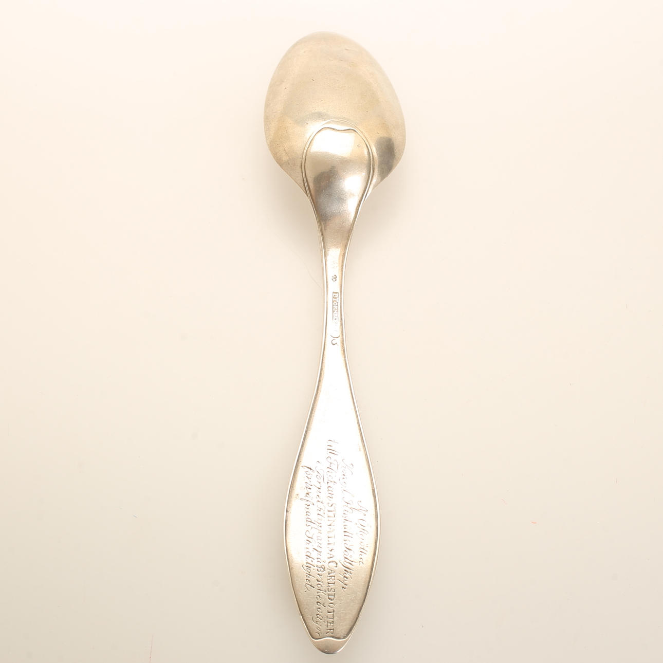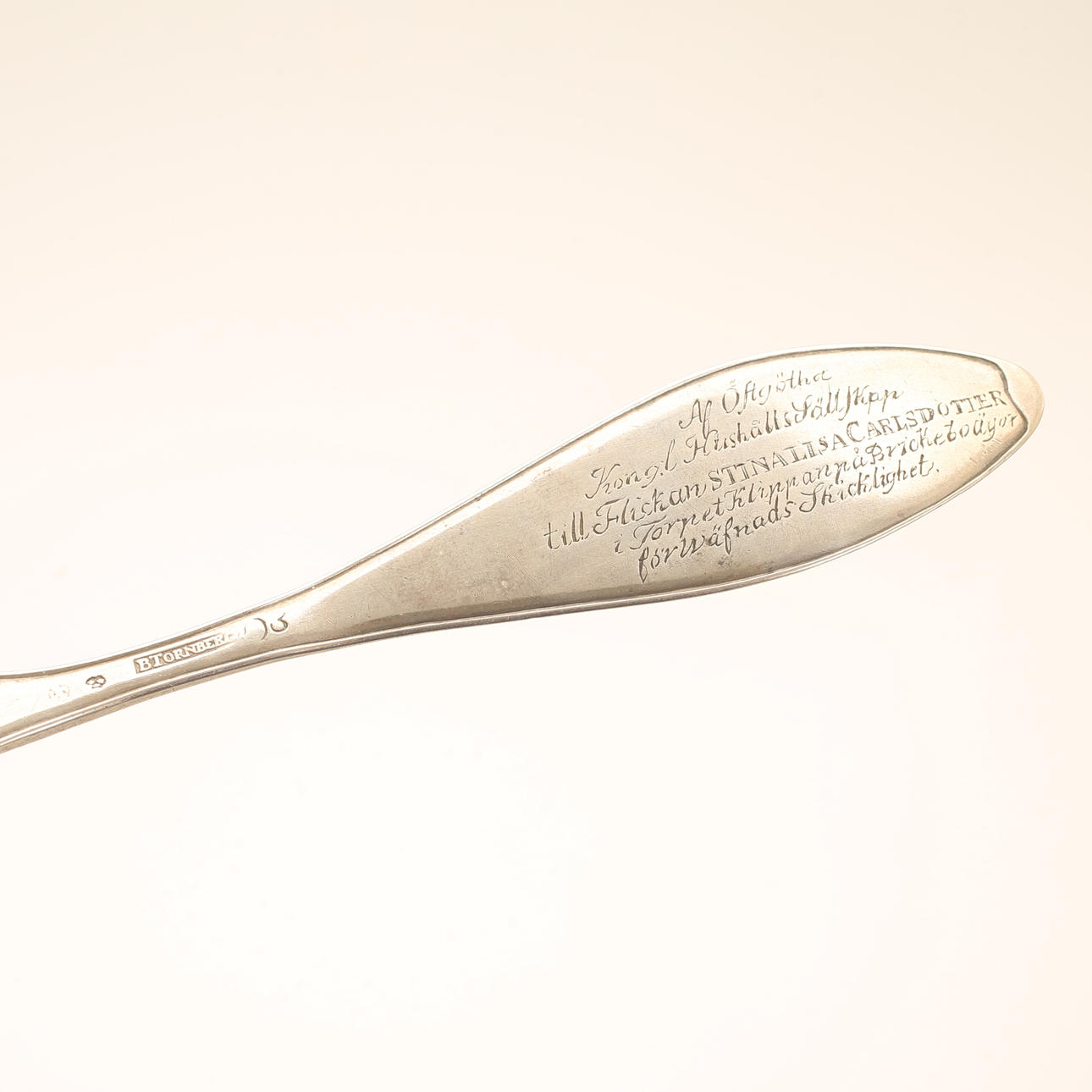 Spoon of Tonberg, Linköping 1820. Weight approx. 64g, length approx. 22,5 cm. Inscription; “Af Östgötha Kongl Husholdssällskap till Flickan Stina Lisa Carlsdotter i torpet Klippan på Brickebo Ägor för Väfnad Skilitet”.
