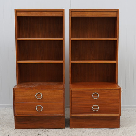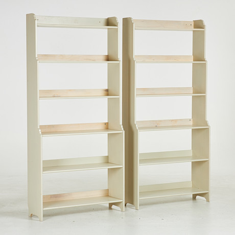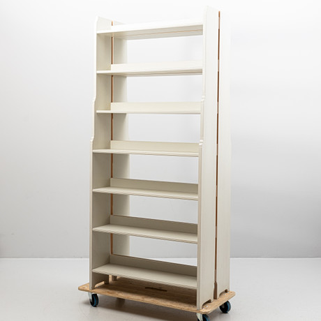 Acid stained pine. 6 fixed bookshelves. Bookcase width 93, depth 32, height 198 cm. CD shelf width 24 cm.
