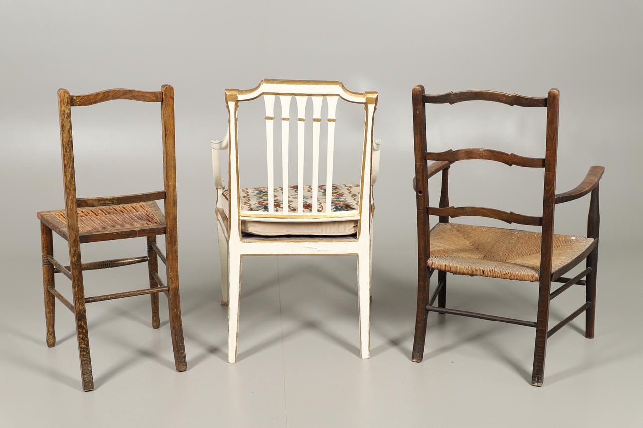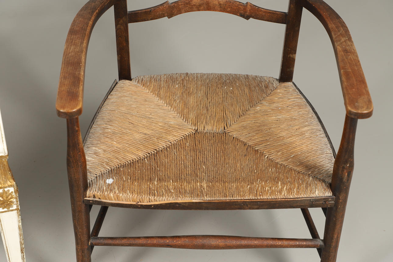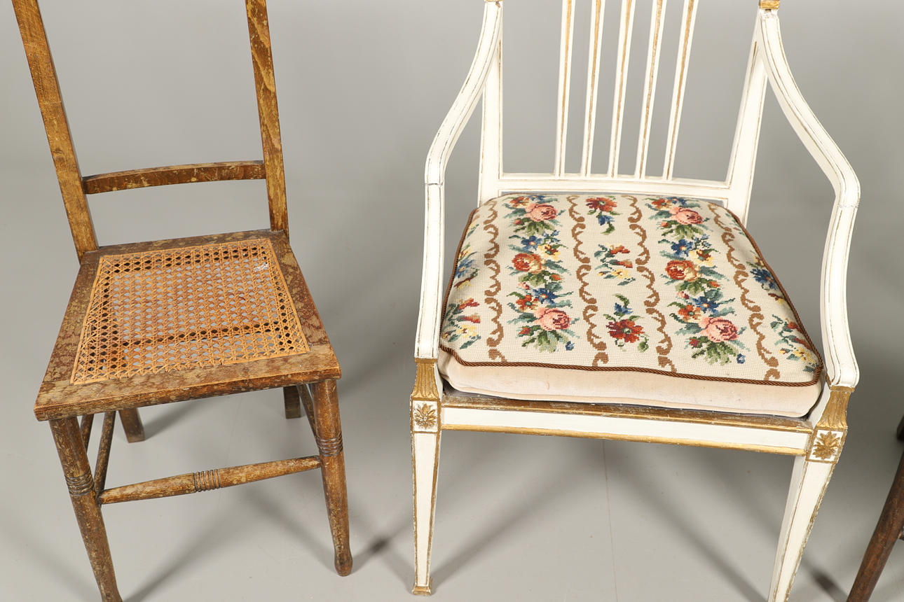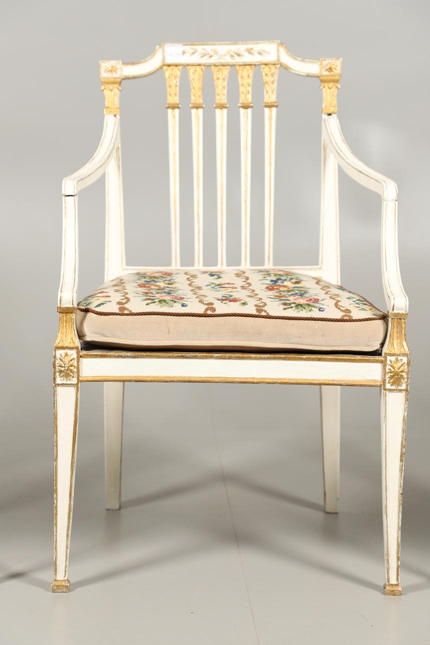 The first a French white & gilt painted chair in the Louis XVI style, 20th century, 86cm high x 55cm wide x 53cm deep.