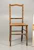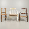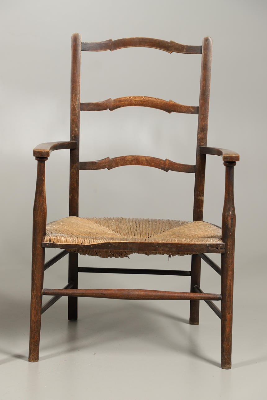An oak ladder back chair with rush seat, reduced in height. 82cm high x 54cm wide x 46cm deep.