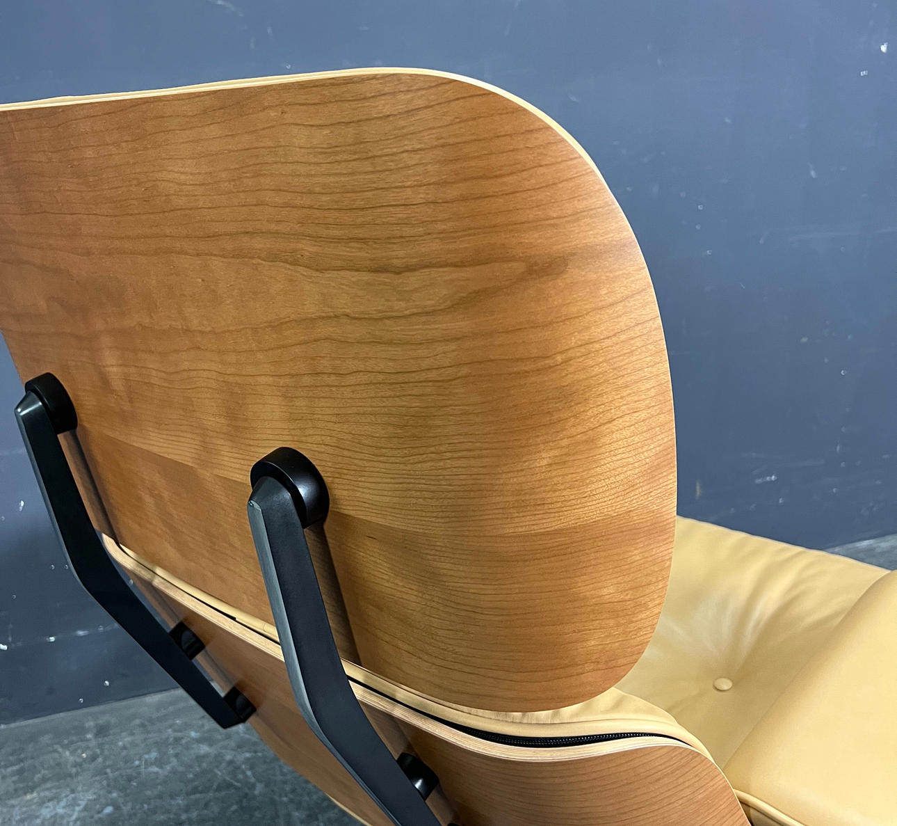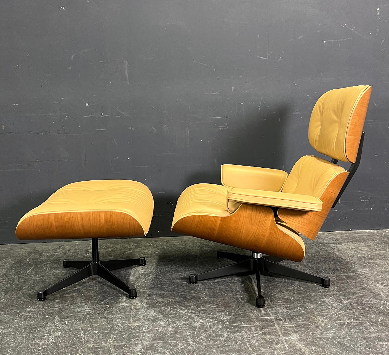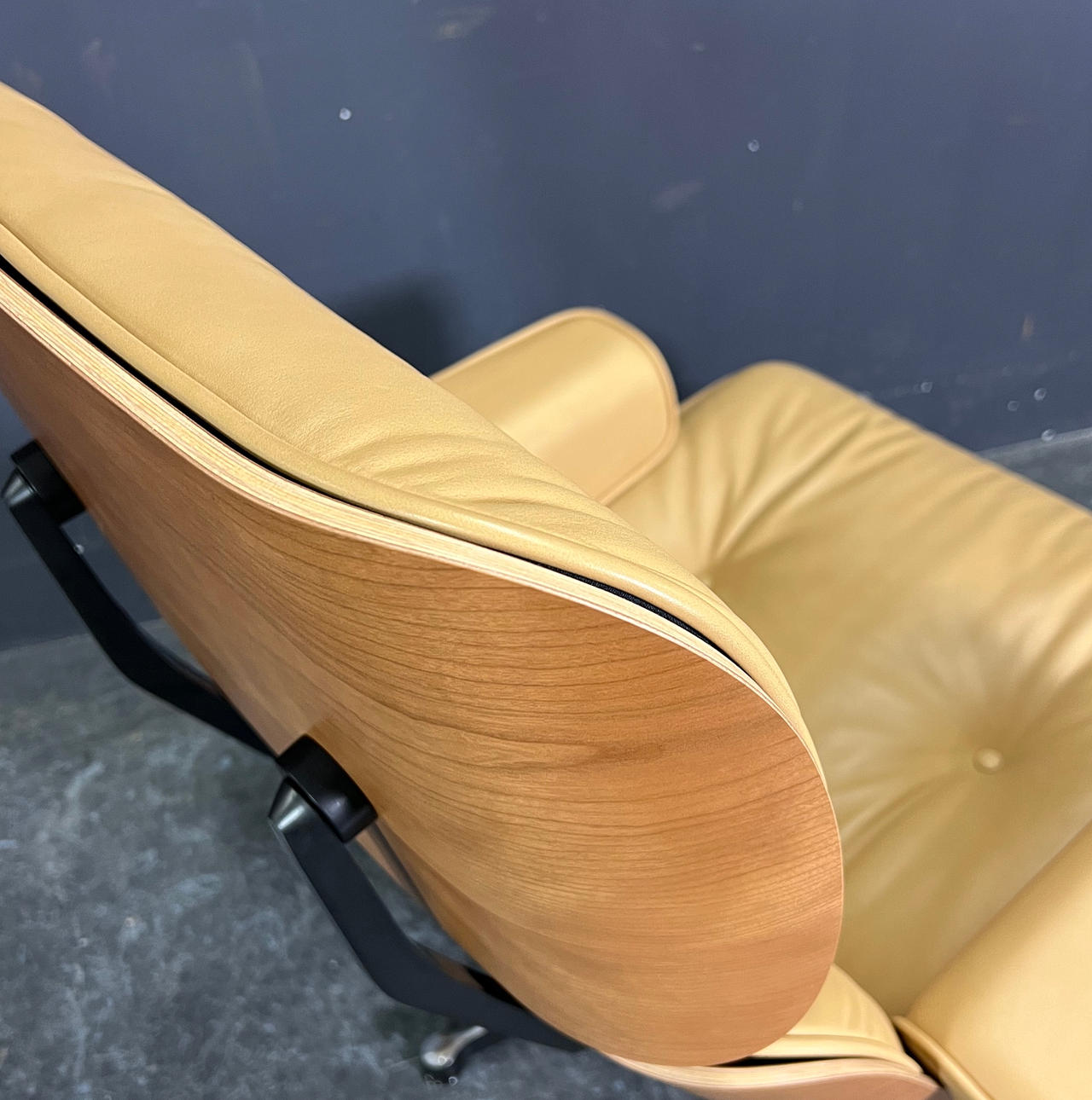 Design: Charles & Ray Eames from 1956 Manufacturer: Vitra Base rotating aluminum frame with plywood shells in American cherry. Removable cushions in Natural Caramel leather Dimensions of the armchair: seat height approx. 38 cm total height approx. 84 cm total width approx. 84 cm depth approx. 85-91 cm.