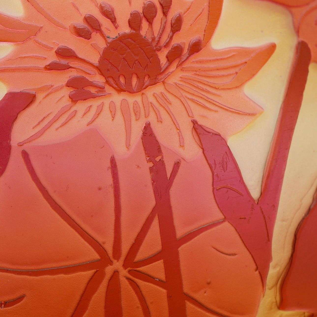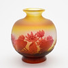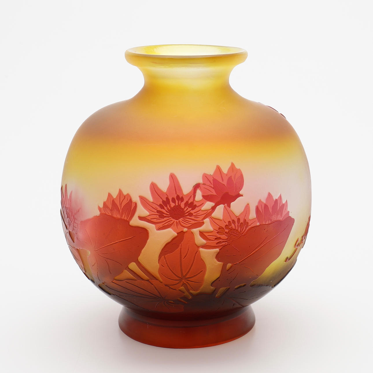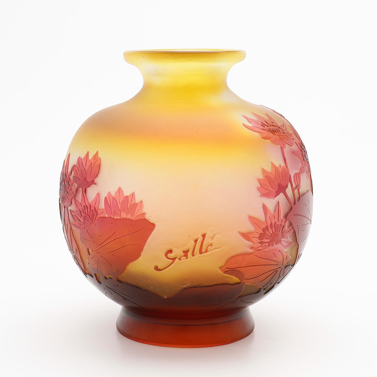 Art Nouveau, globular with small heel and flared neck, slightly iridescent overhang glass in yellow and red with etched decoration depicting cyclamen, signed “Gallé” on the waist,, raised 13 cm.