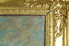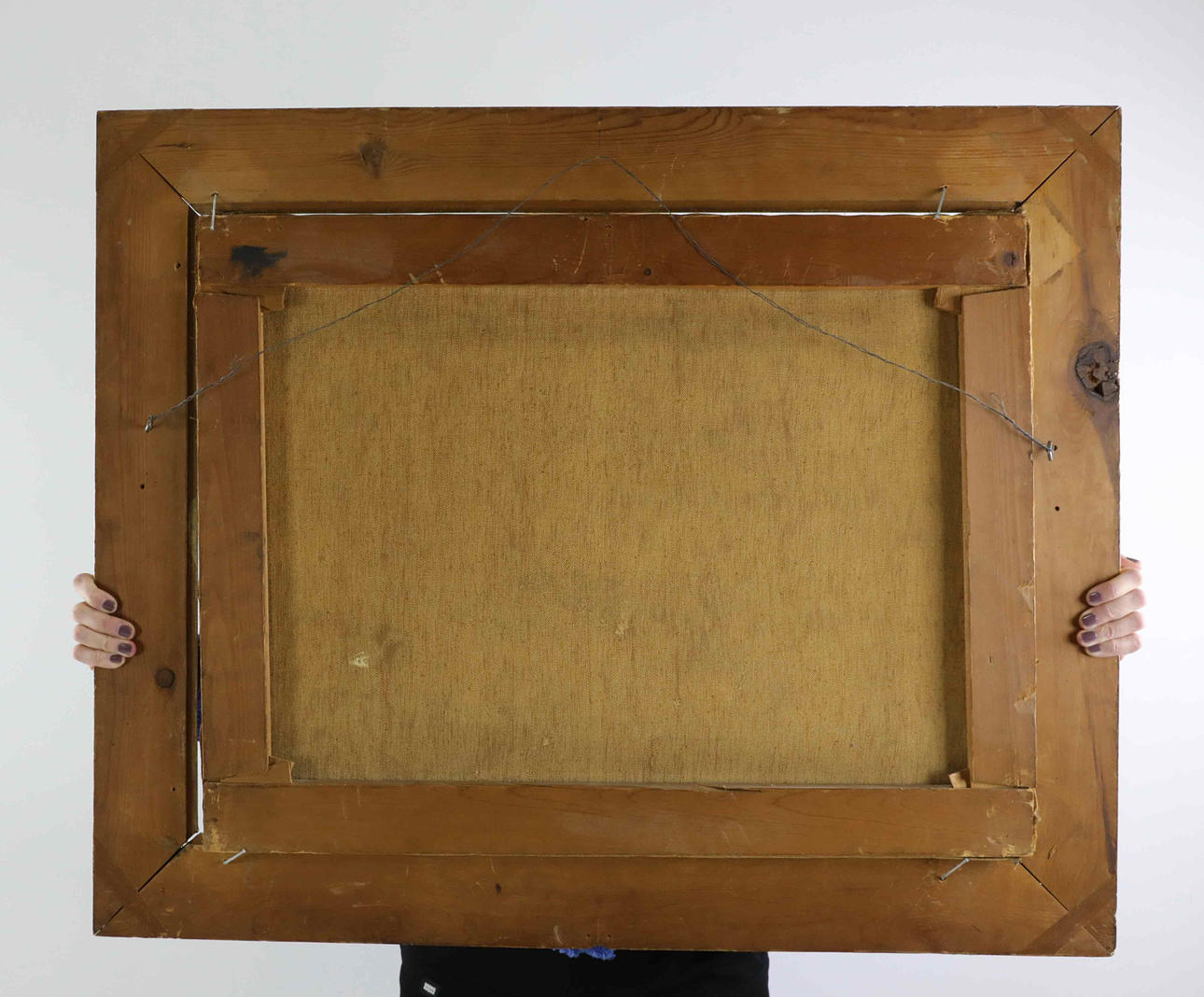 Not examined out of frame. There is pressure damage in canvas after frame, as well as slight color loss after edges.