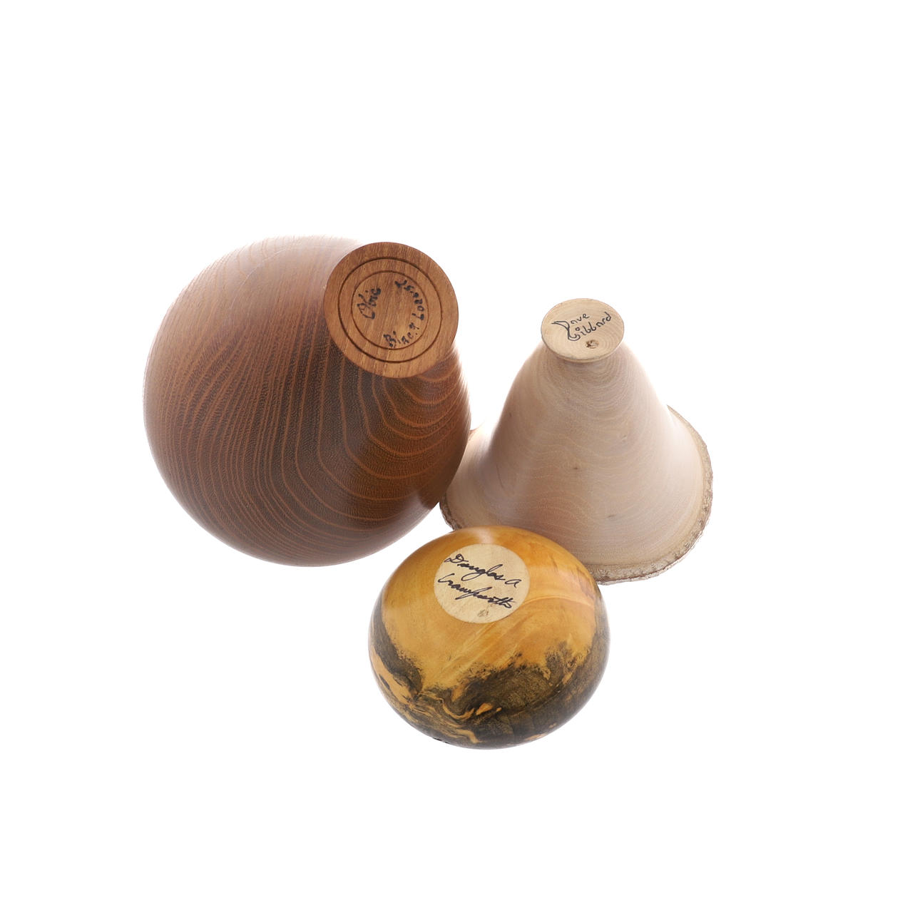 7.8cm diameter, a conical vase signed 'Dave Gibbard' 10cm high, a Black Forest vase signed 'Obie' 15cm high, and another woodturner bowl (4).