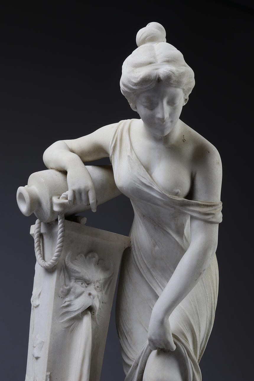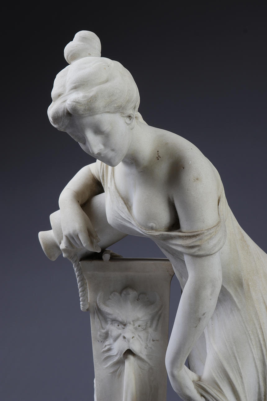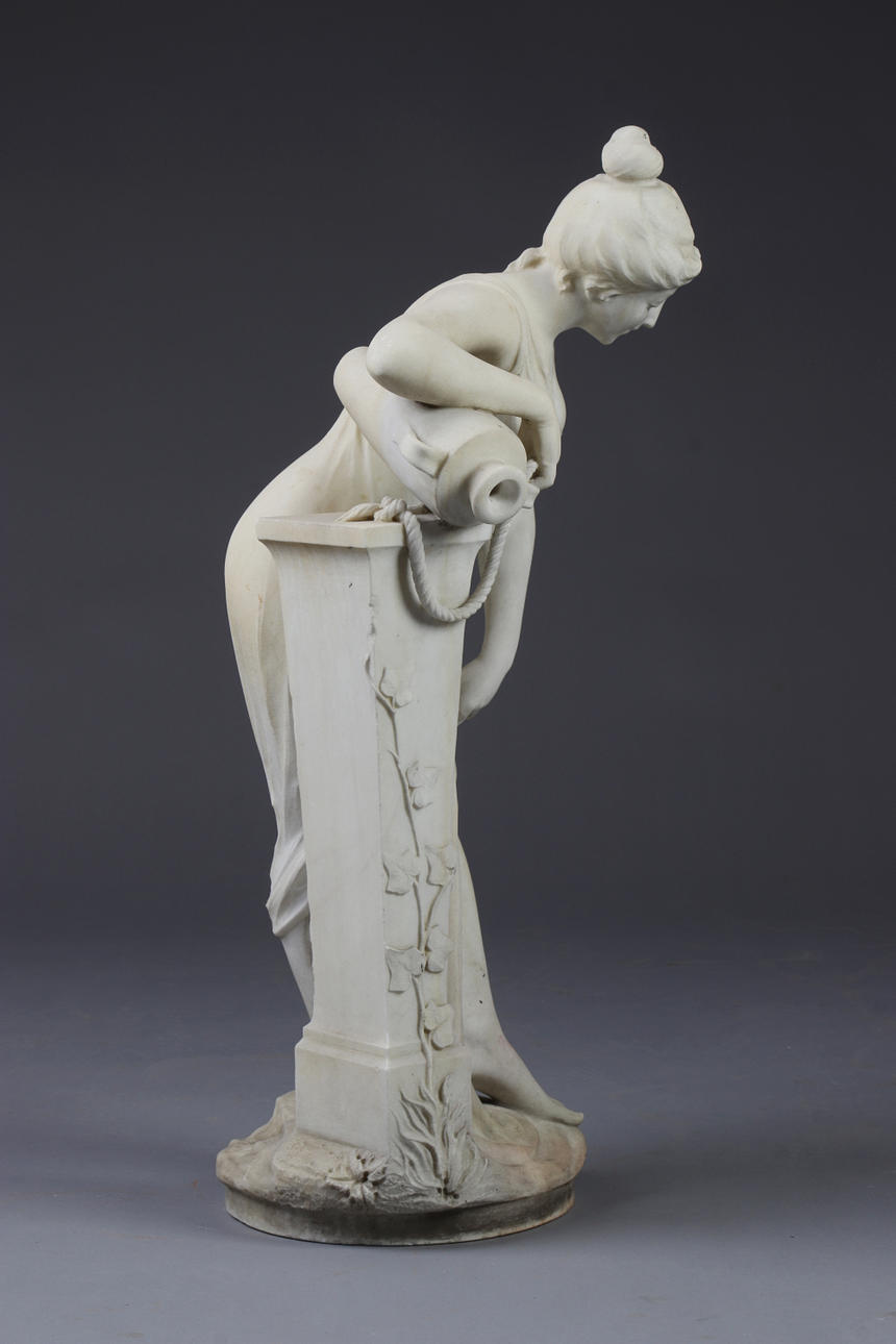 Sculpted marble. Woman with amphora at column. Around the year 1900. Signed Prof. F. Saul (Saul Fanfani). Height 84 cm.