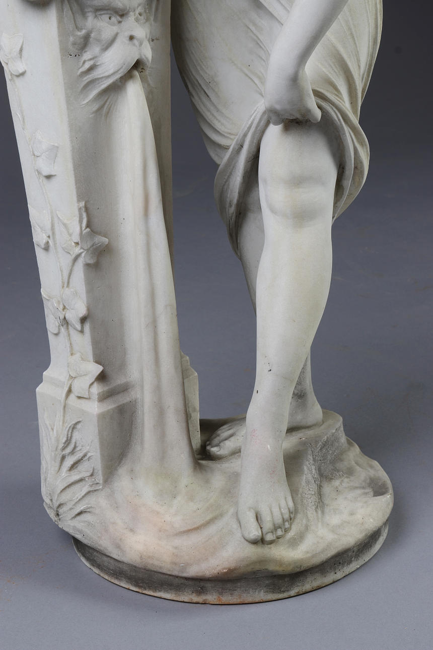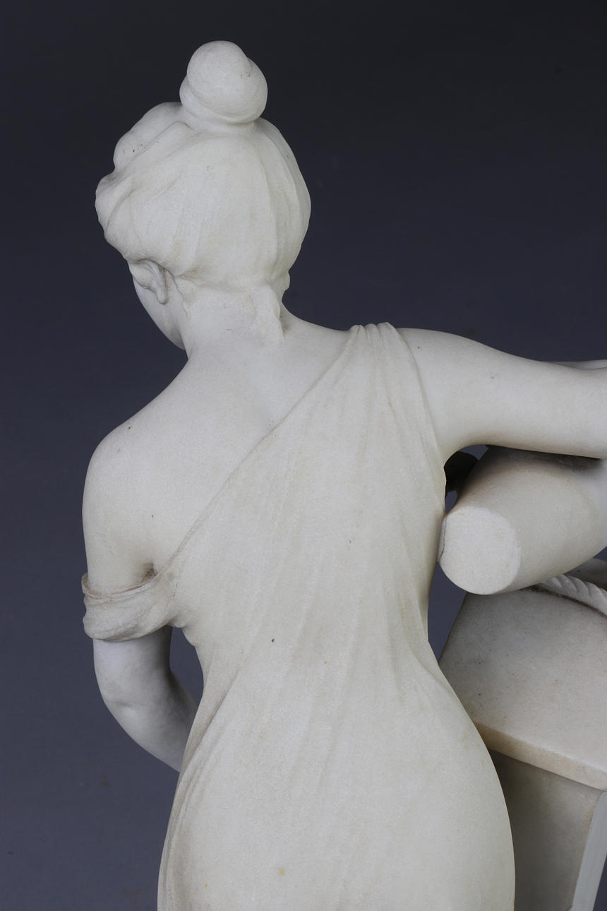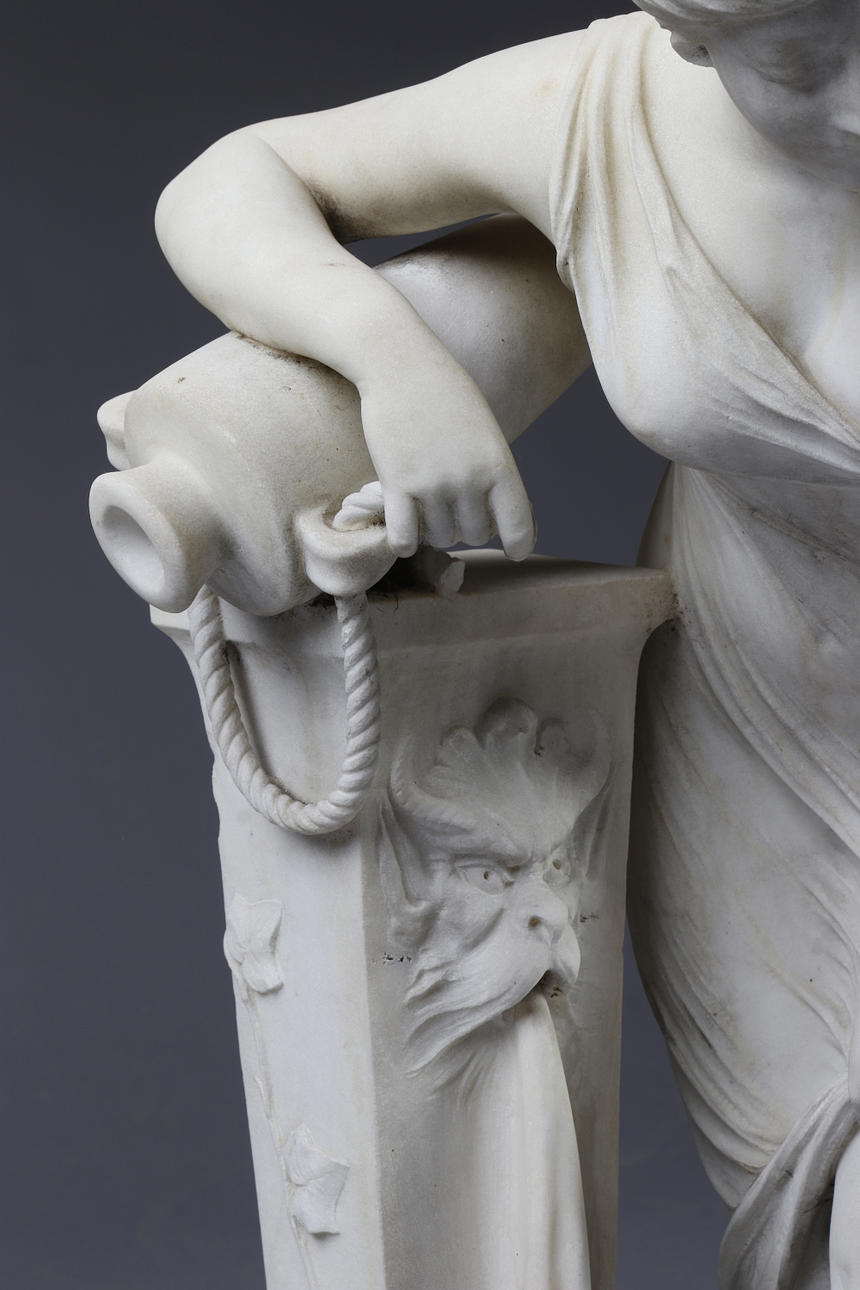 Sculpted marble. Woman with amphora at column. Around the year 1900. Signed Prof. F. Saul (Saul Fanfani). Height 84 cm.