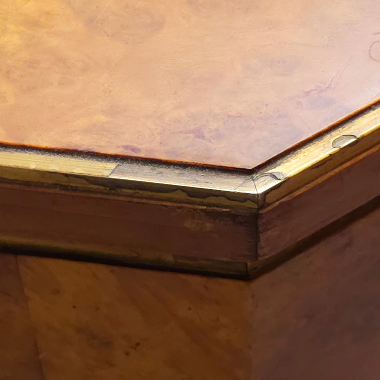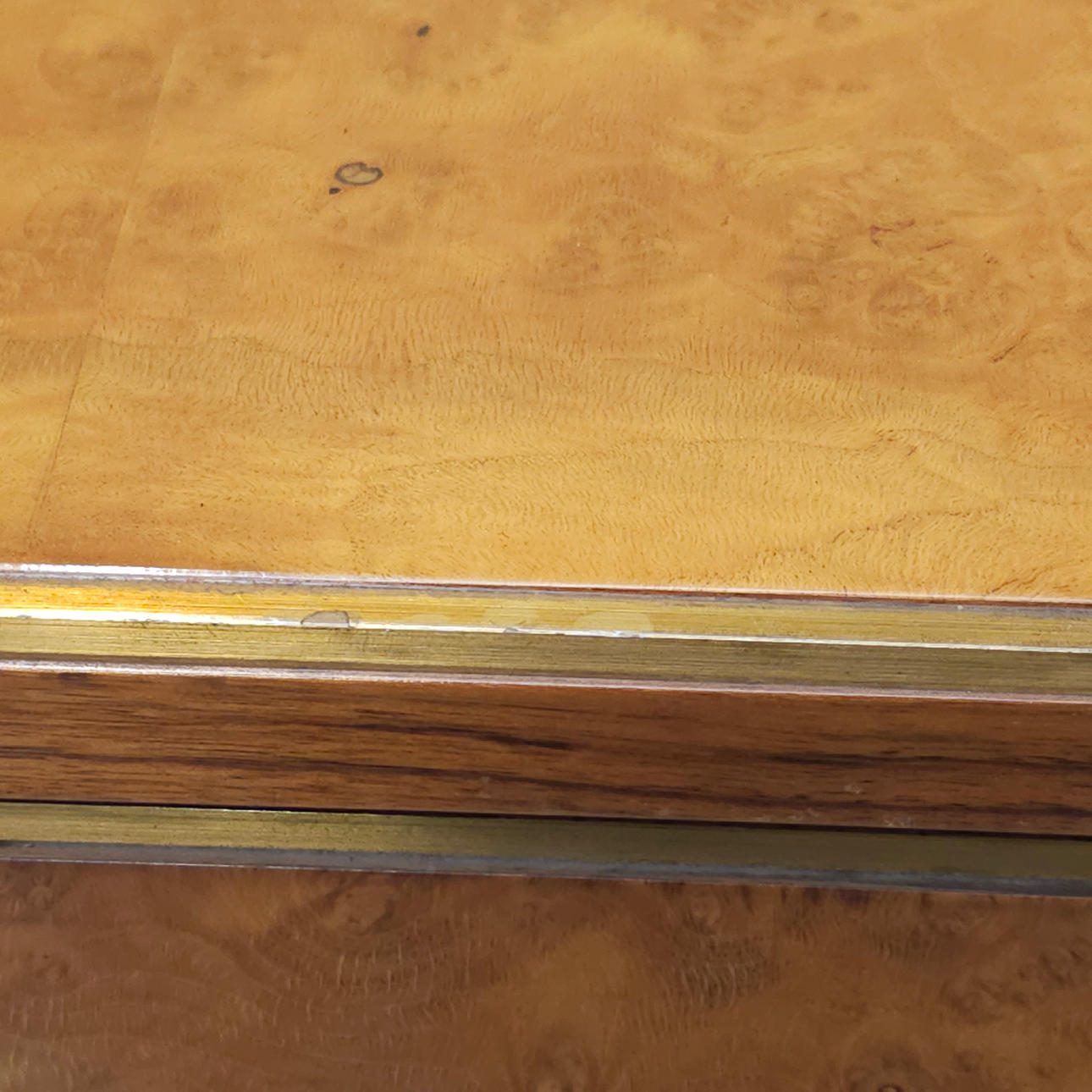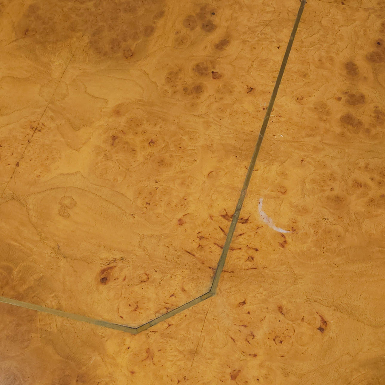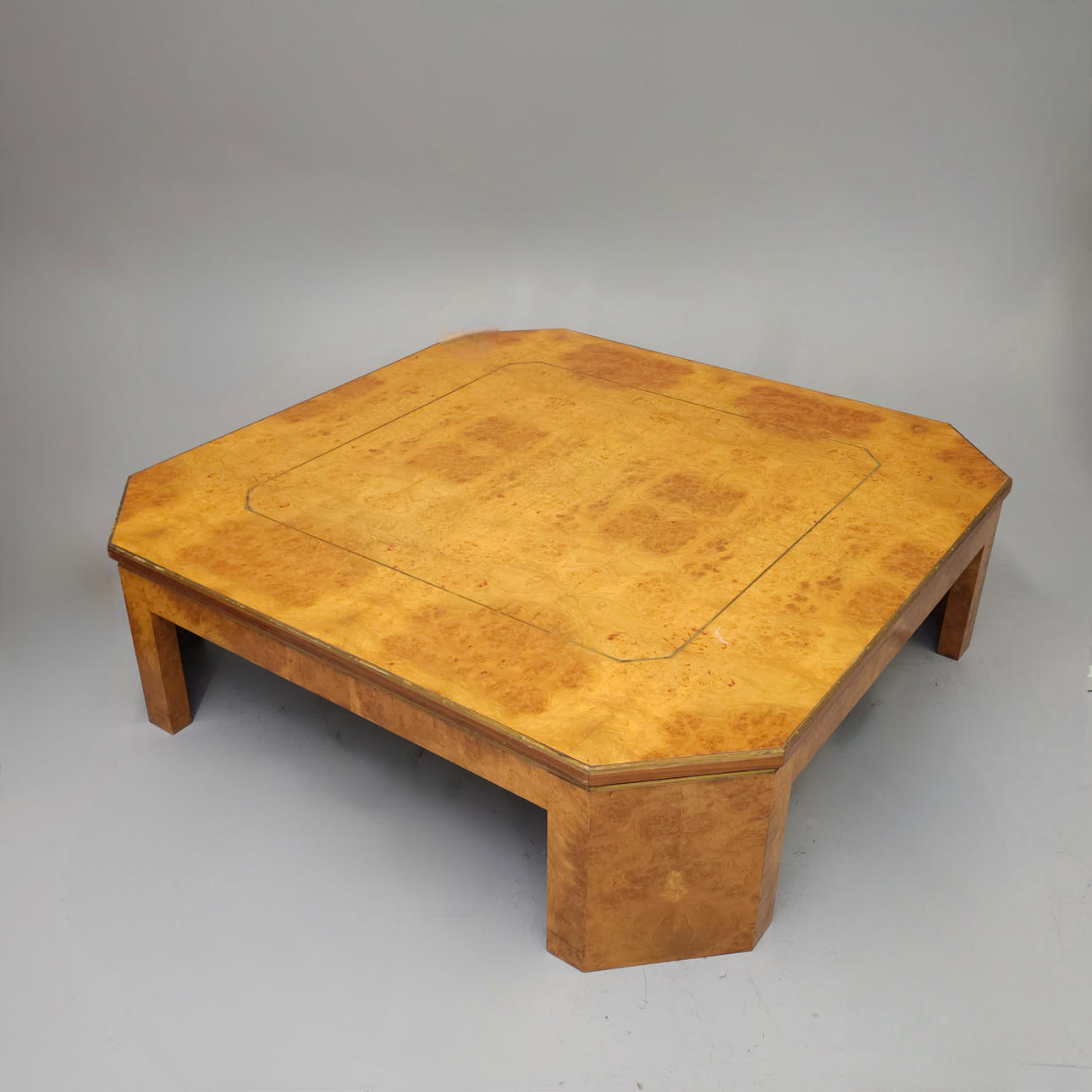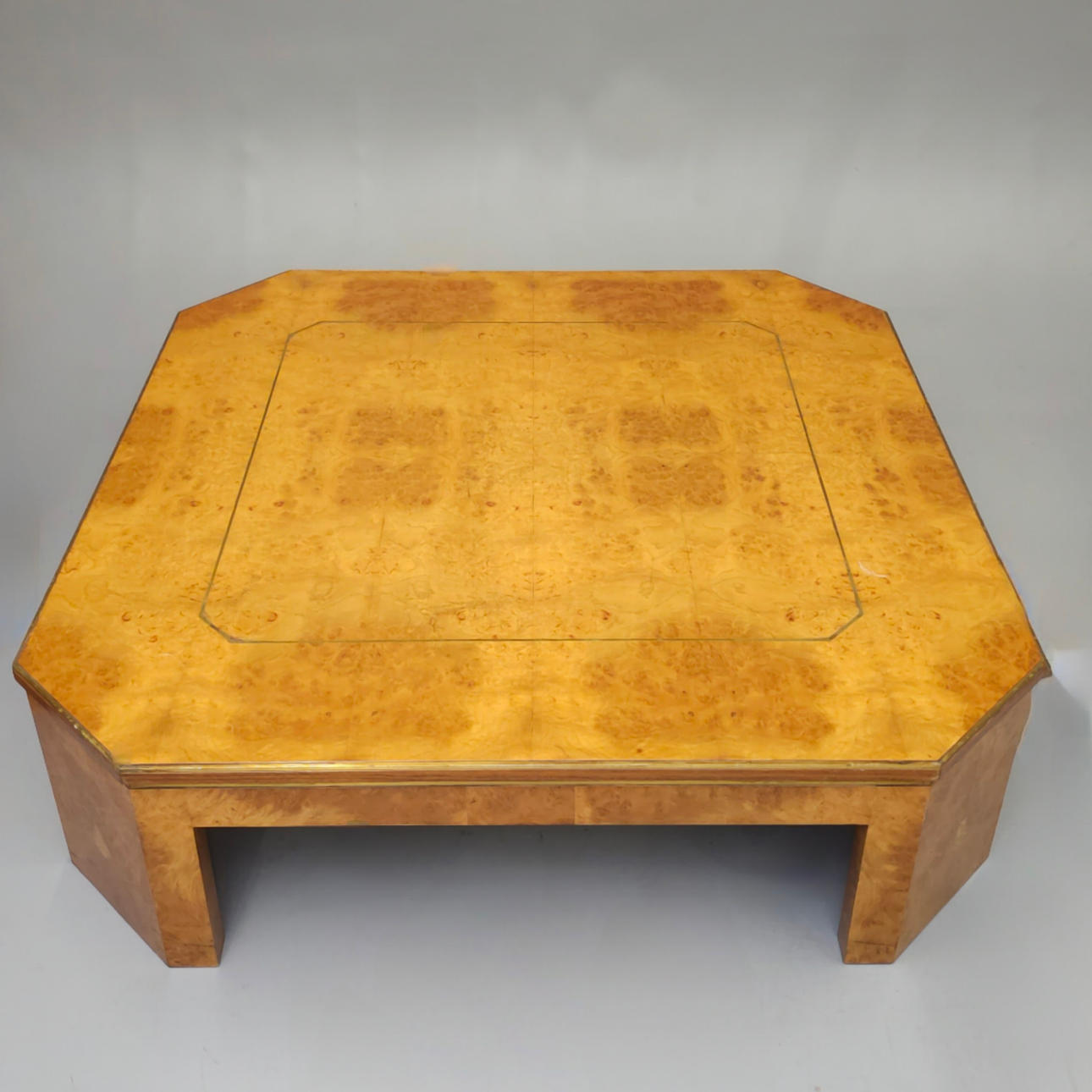 3139855. LARGE BIRCH ROOT PLATED COFFEE TABLE WITH METAL FILLET.