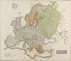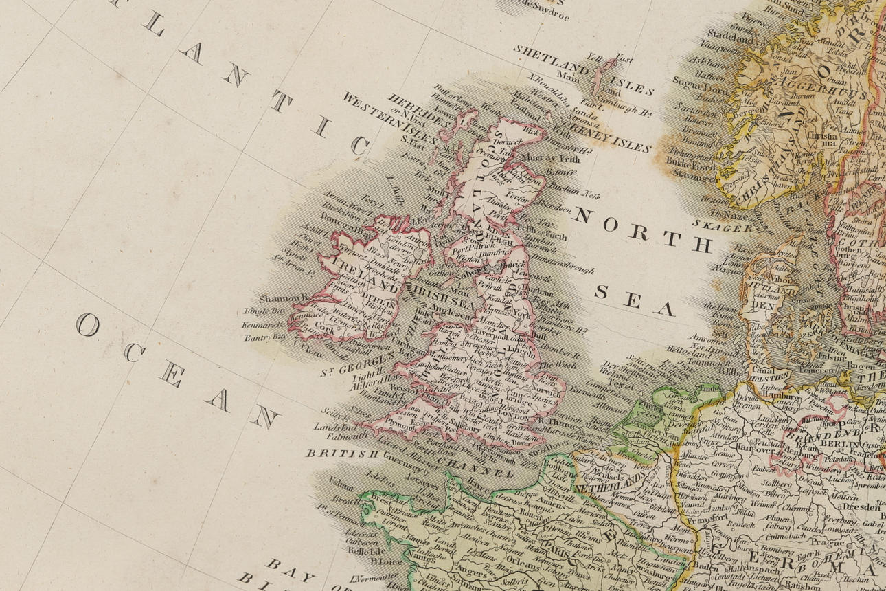 A hand coloured map of Europe with coloured borders and territories. 46 x 54cm. Framed and glazed, 66 x 73 cm overall.