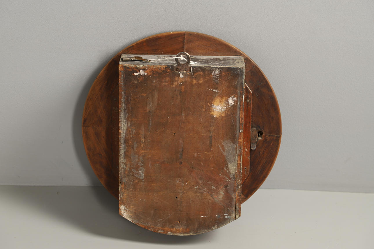 A circular oak school clock, with a painted 30cms dial and black numerals, and in an oak case. With a key and pendulum, case 39.5cms diameter.