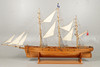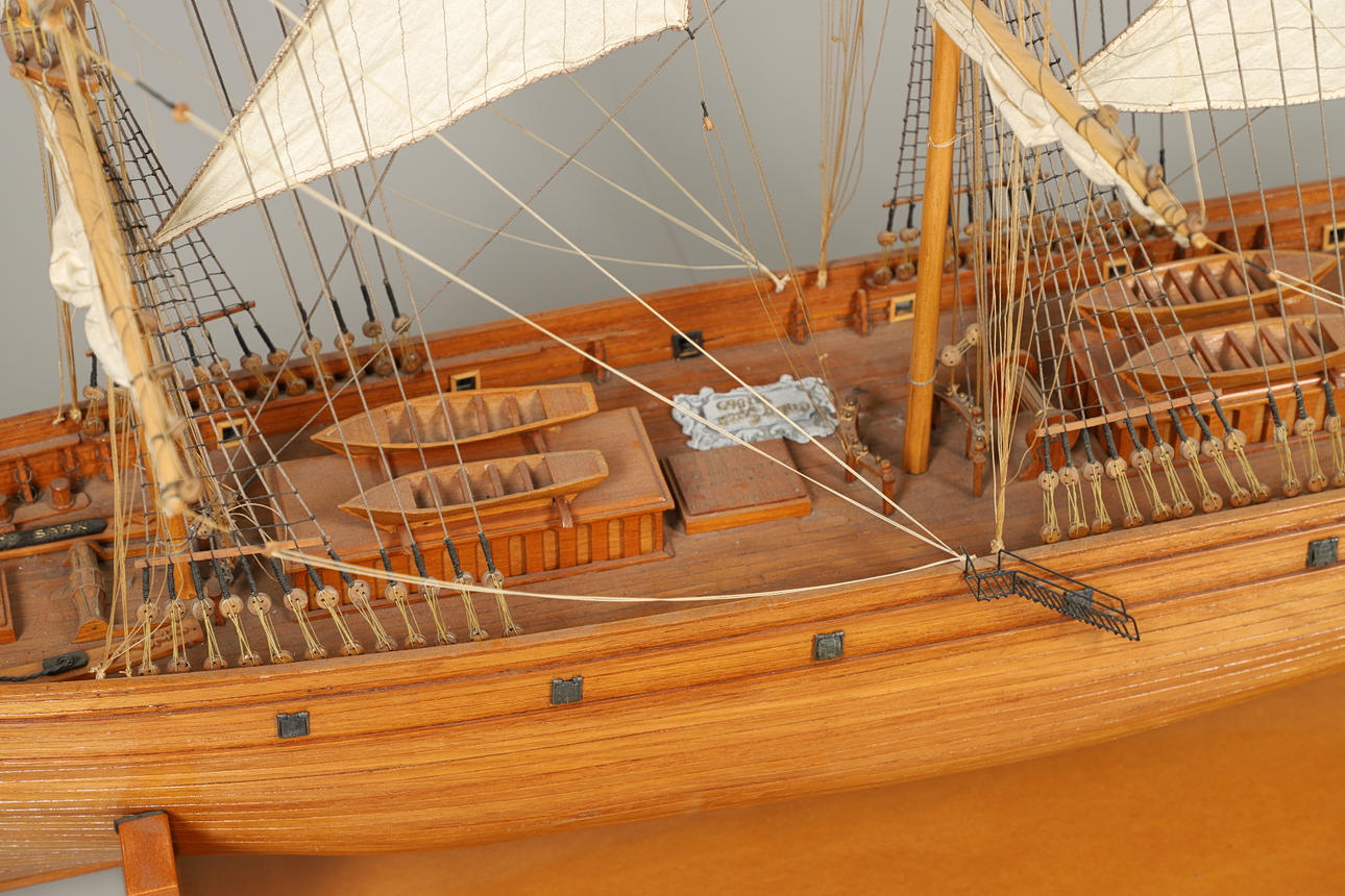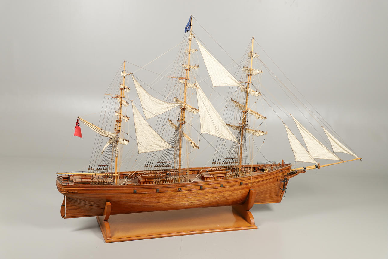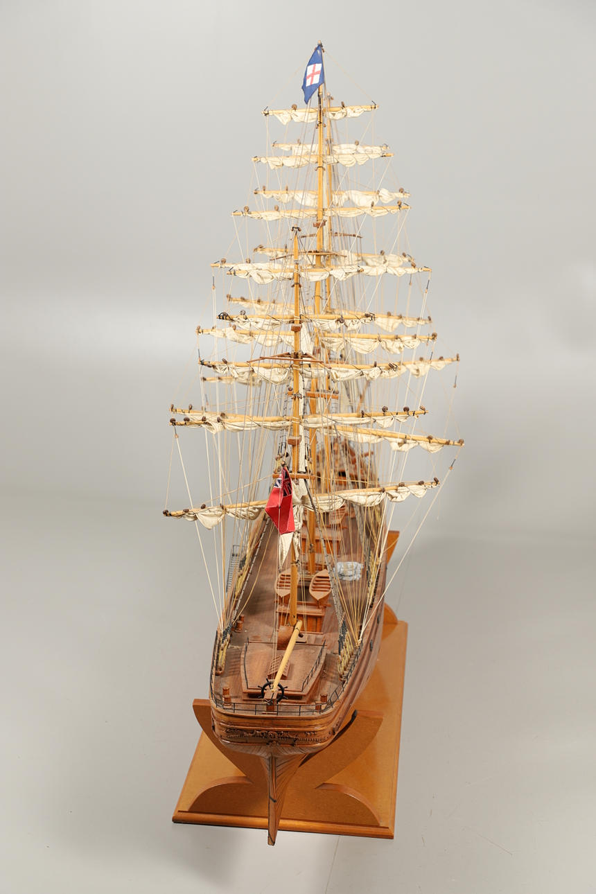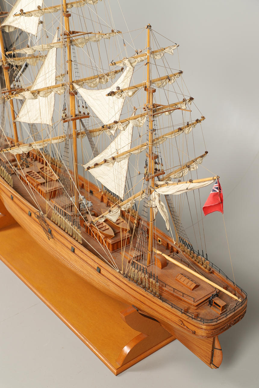 A very large and impressive wooden model of the Cutty Sark, complete with sails and rigging and supported on a wooden base. Approx 213cms long, 137cms long including base.