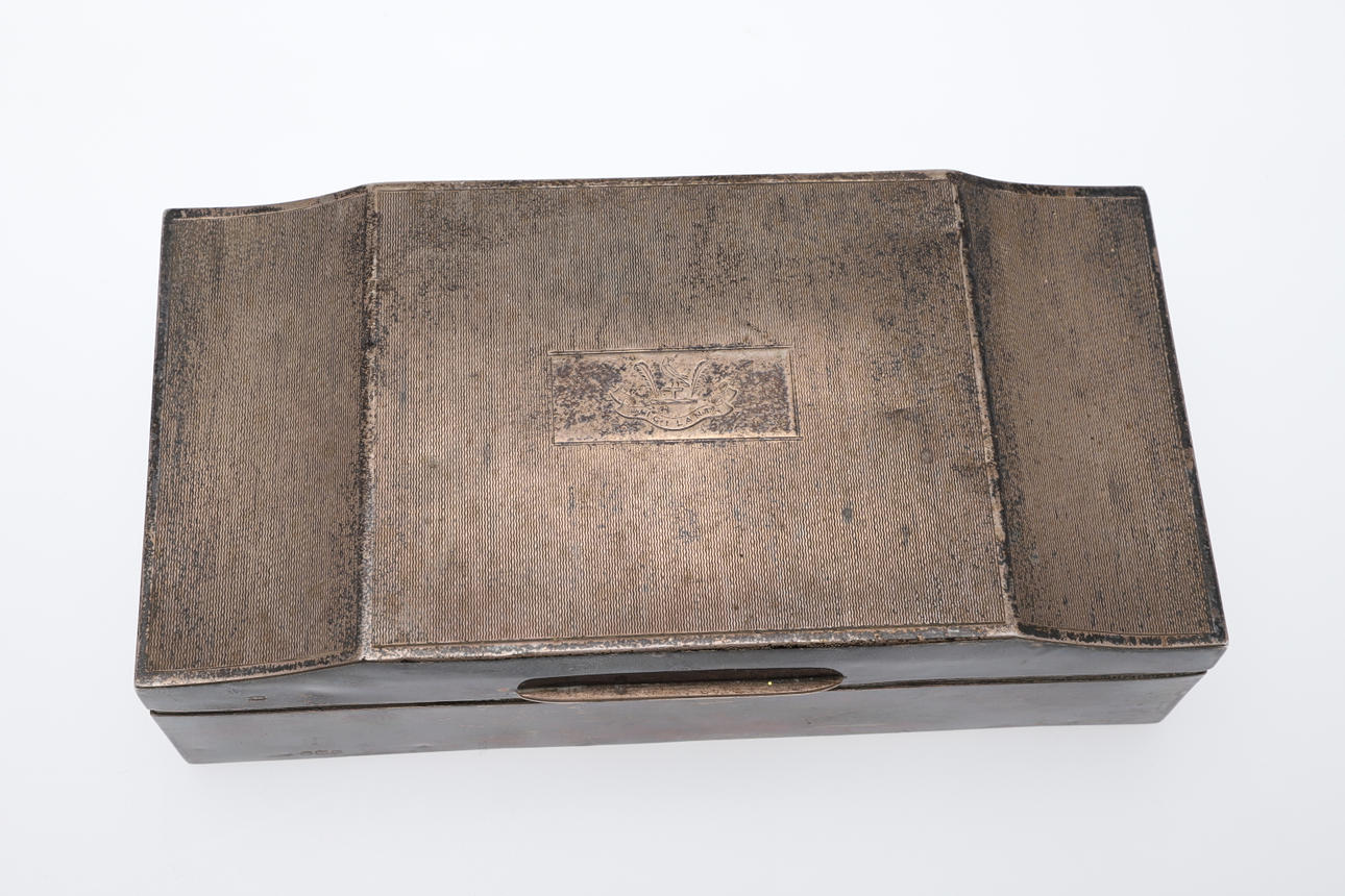 AN ENGINE TURNED SILVER CEDAR LINED CIGARETTE BOX.