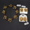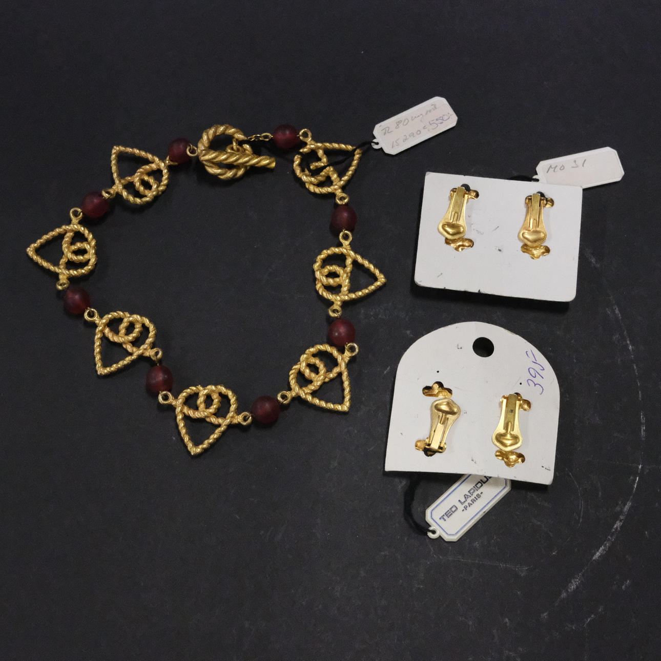 Ted Lapidus, Paris, three pieces of jewellery, gilt: two pairs of earrings with stones, clips, measures approx. 3c2,5cm and necklace with hearts and red stones, length 39cm.