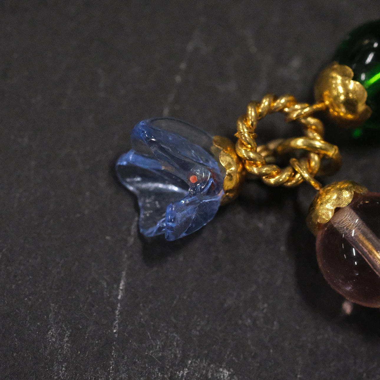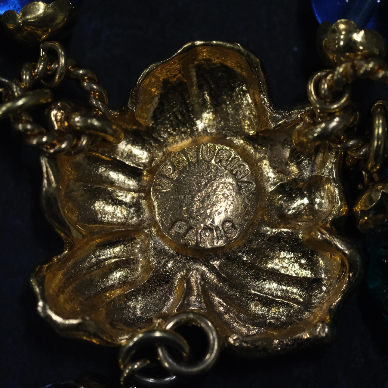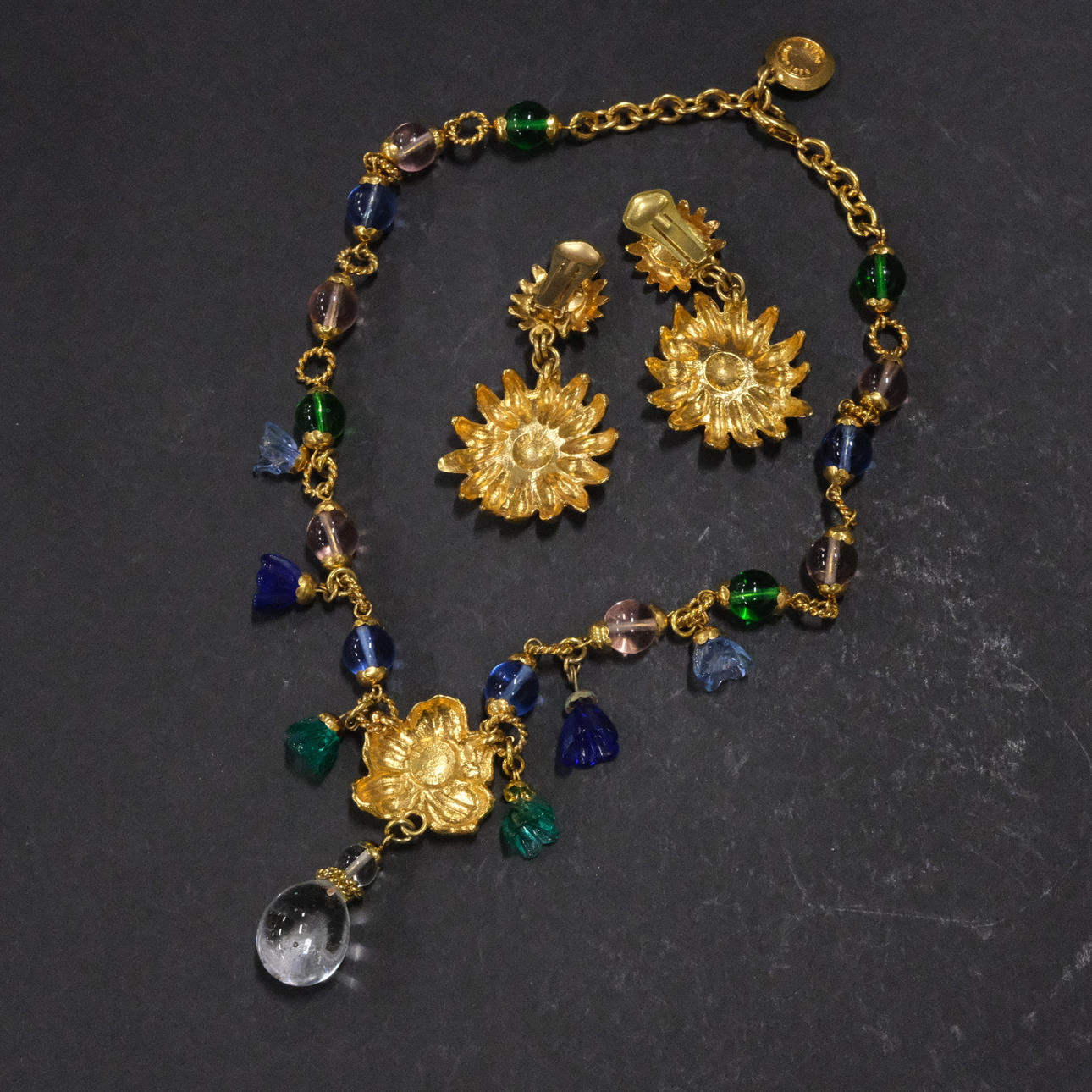 Venturina, Paris, two pieces of jewelry, gilt: a pair of earrings, clips, dimensions approx. 6x3cm. Necklace with uncolored stones and flowers in plastic, length 44cm.