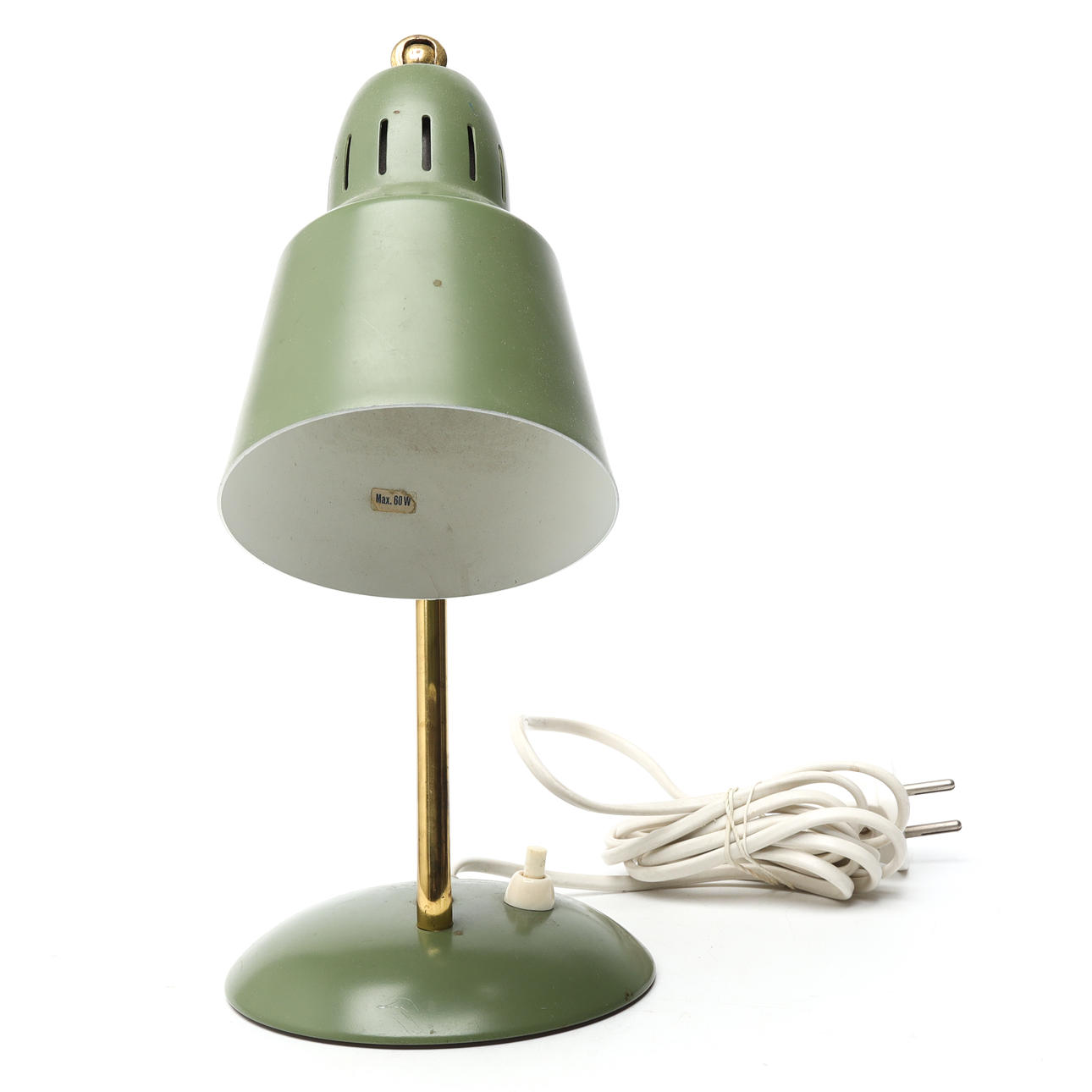 Green painted plate, curved brass arm, height 28 cm.