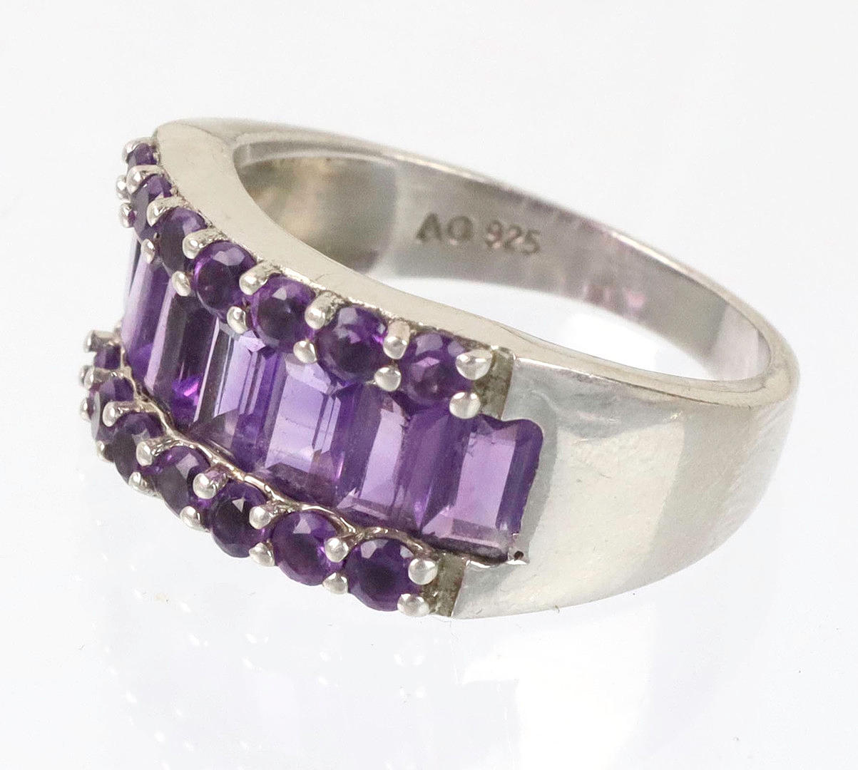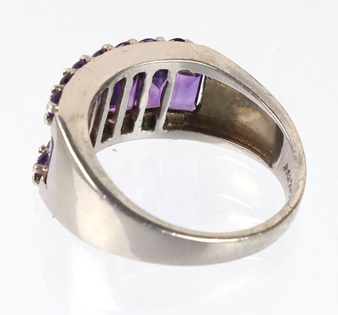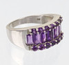 hallmarked silver 925, approx. 5.95 grams, Harry Ivens design, three-row ring head with 7 baquette and 14 round cut amethysts, RG 60, inner diameter 19.1 mm.
