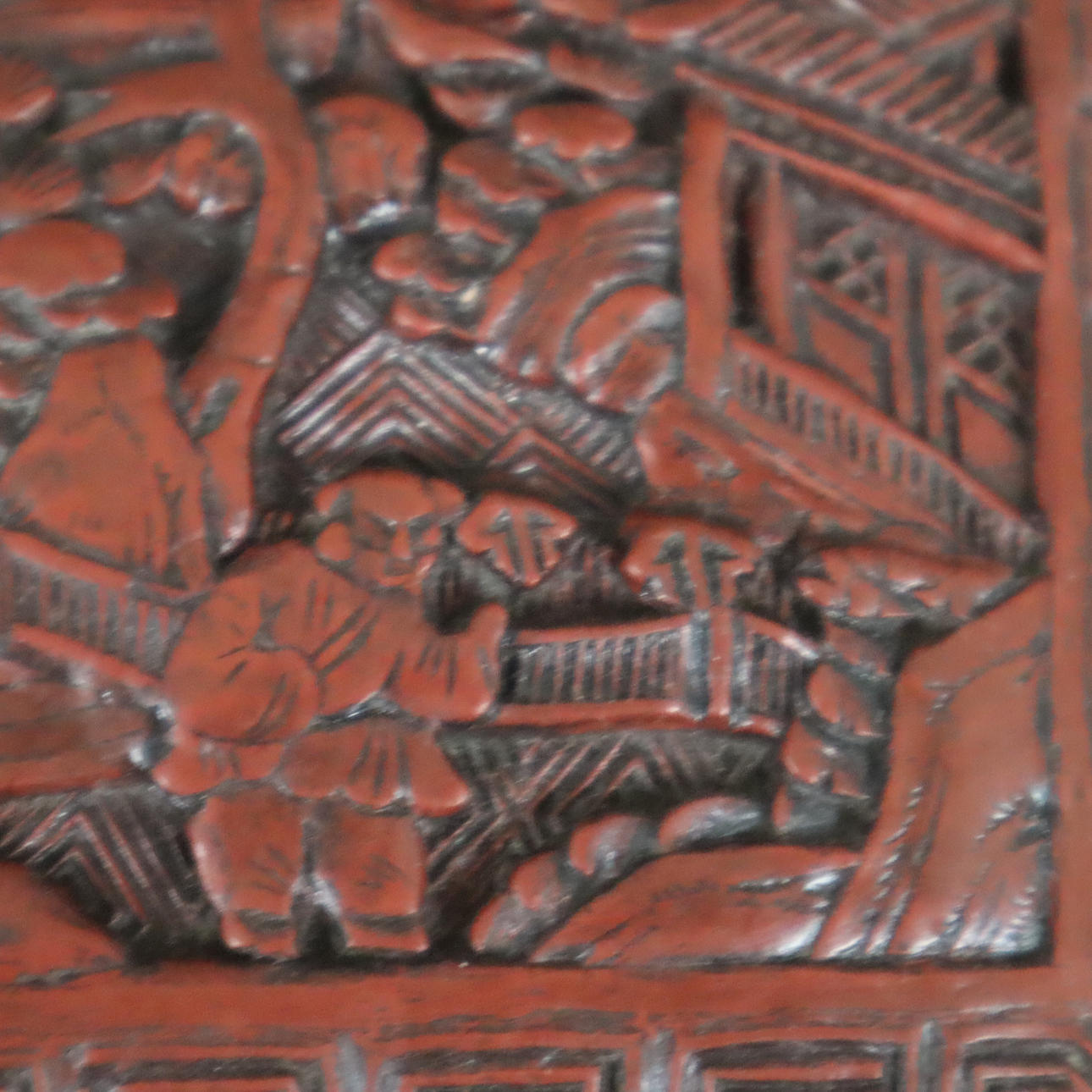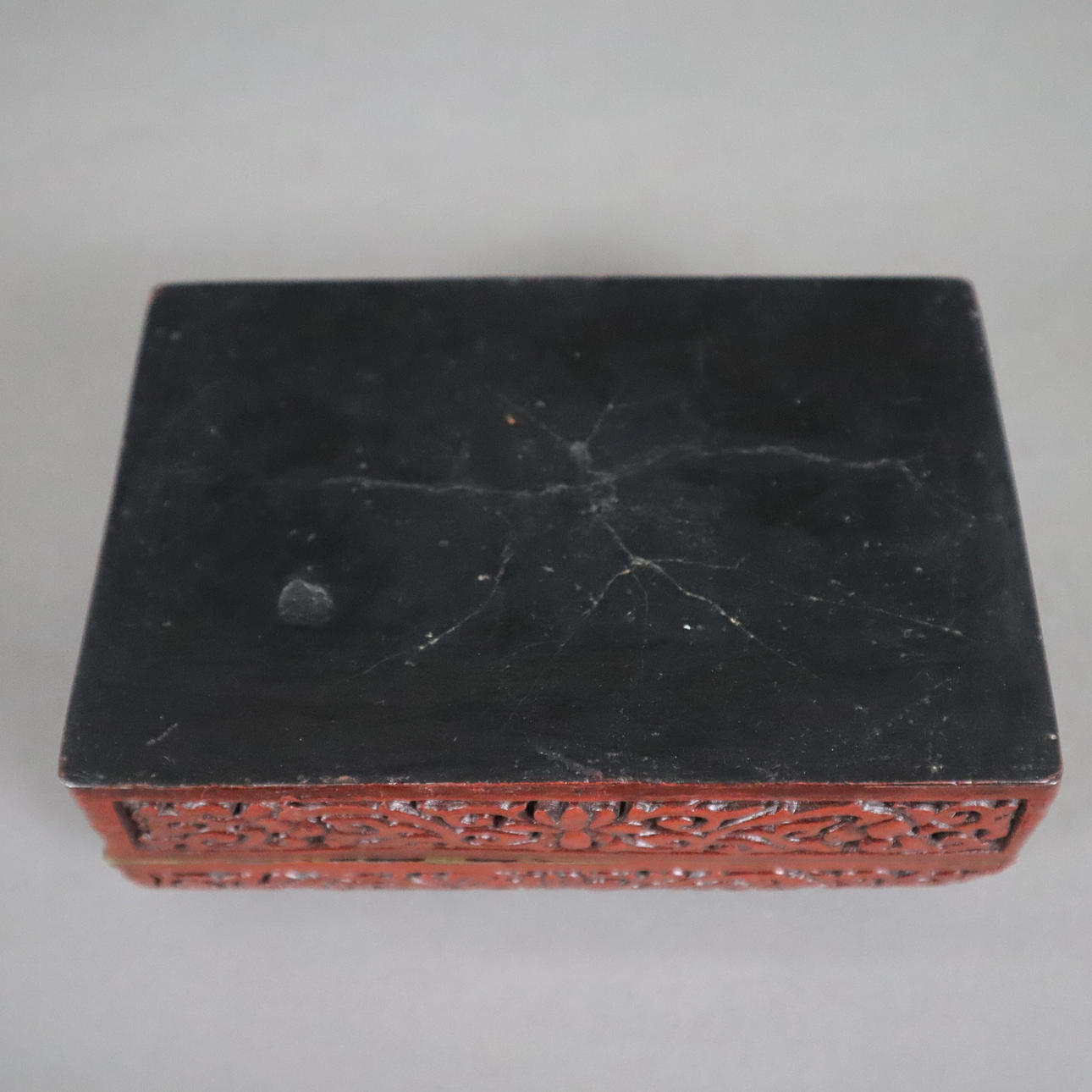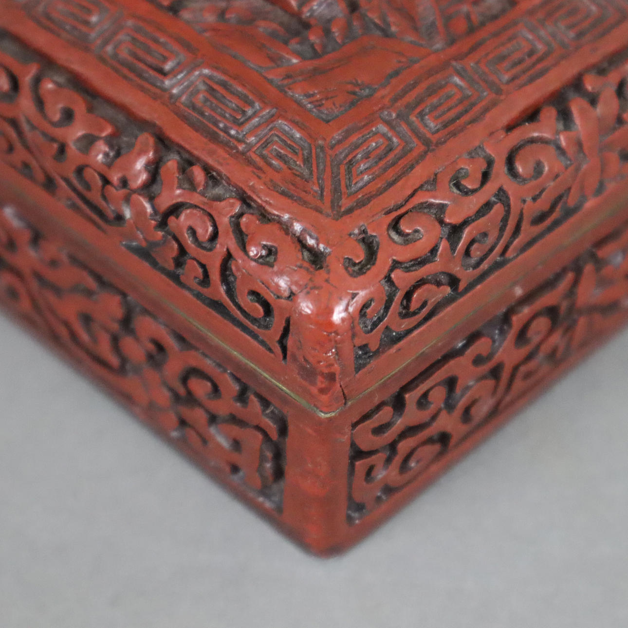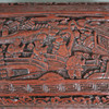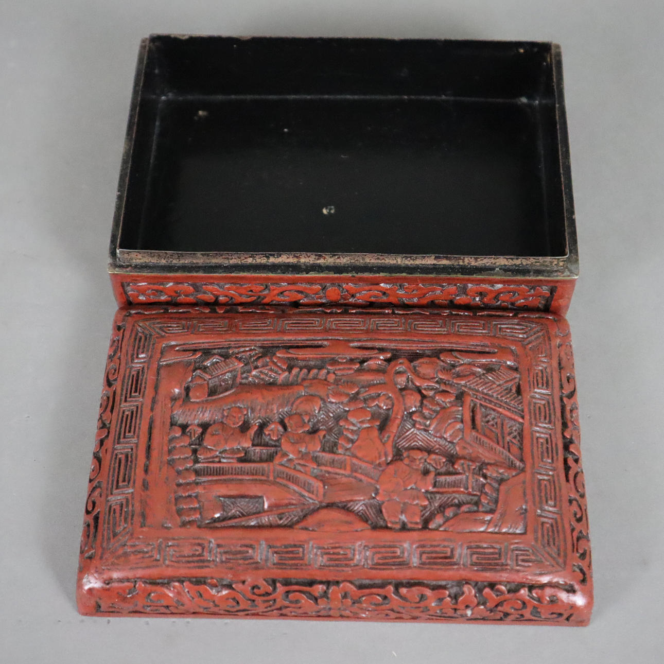Outer wall with red carved lacquer, inner wall and bottom lacquered black, rectangular shape, slip lid with rounded edges, on the lid a finely worked architectural landscape with figures on a bridge, surrounded by a meander border, the sides are decorated with cartouches of lotus tendrils, approx. 4.8x14x9.5cm.