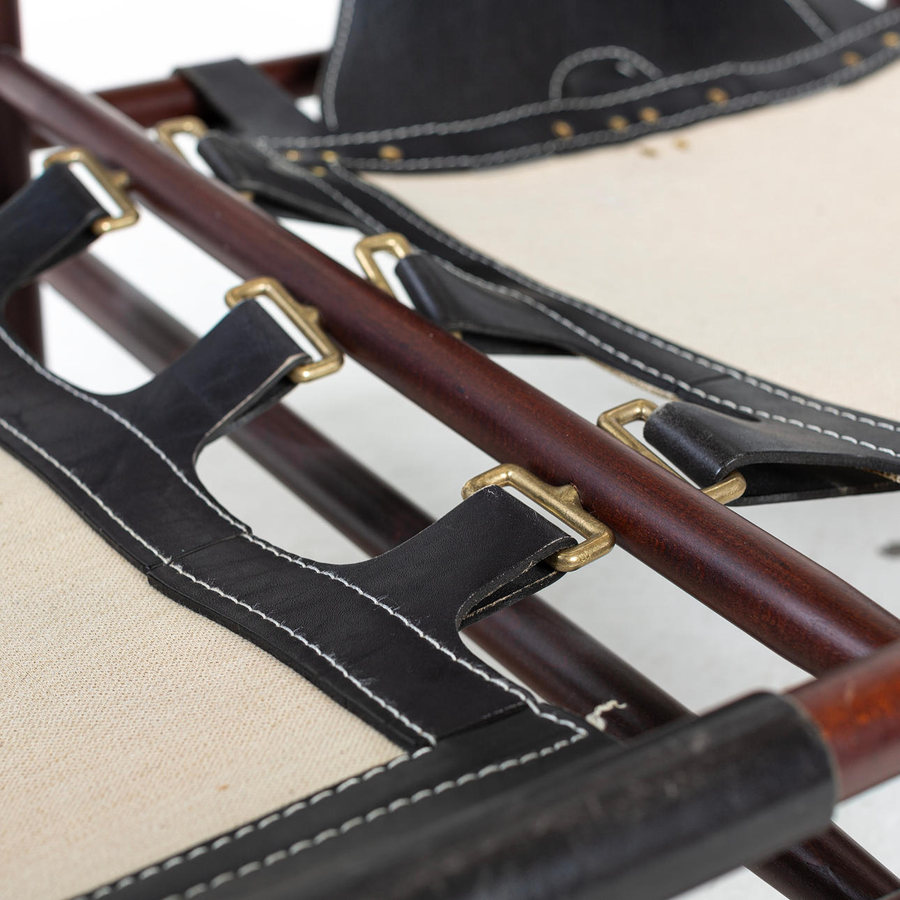 A brace across the back with discolorations. Otherwise good working condition, slight traces of use on leather parts and frame.