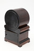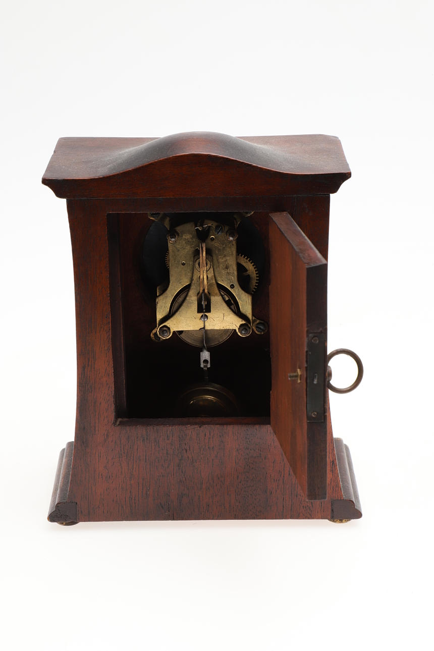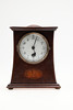 Including a mantle clock with a circular white dial and black numbers, with an unusual circular brass pendulum and wound from the back (26cms high). Also with an Edwardian mantle clock with white enamel dial and inlaid decoration, with a key and pendulum (20cms high). (2).