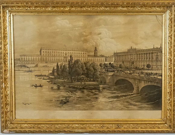 3164290. STIG (SLAS) CLAESSON. View from Söder Mälarstrand towards Stadshuset - Stockholm, signed and dated 77. 236/300.