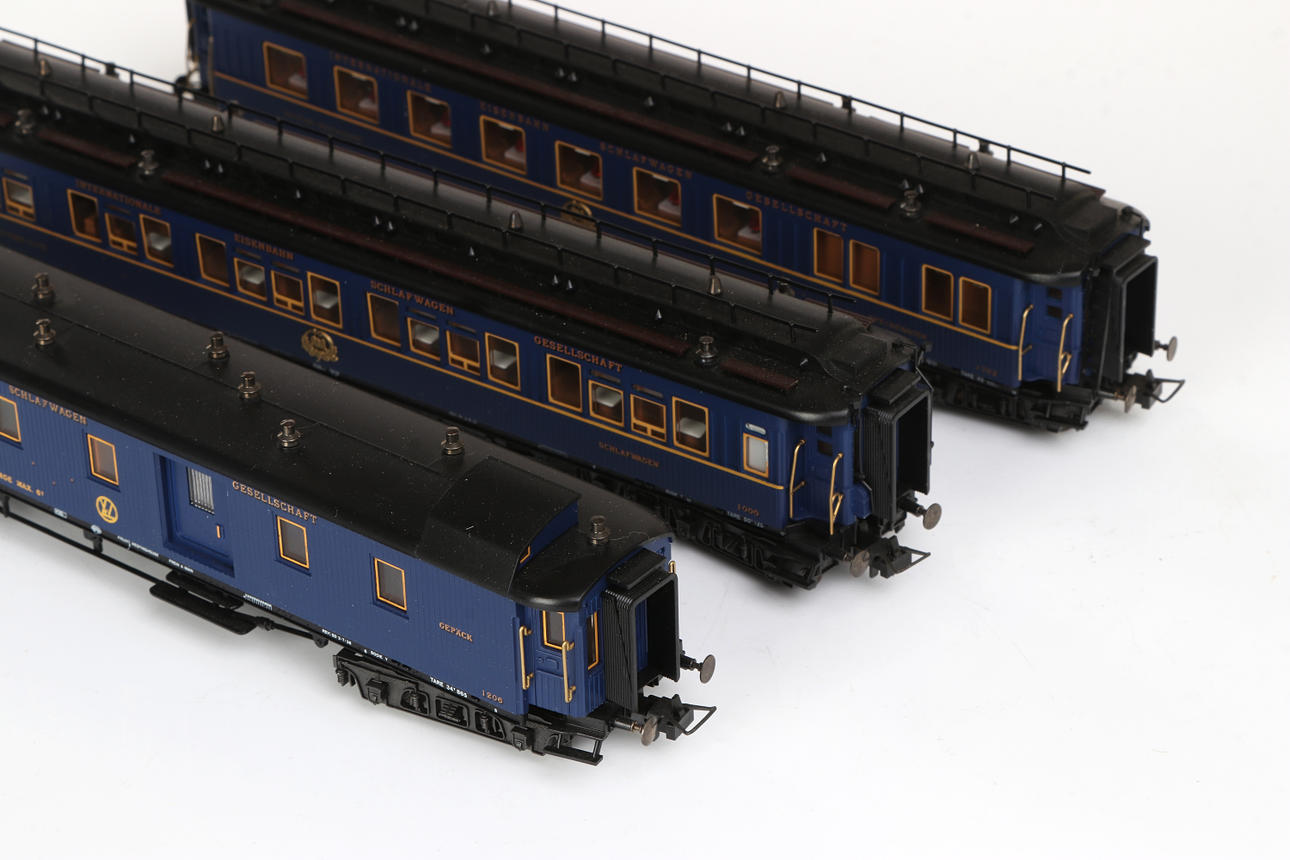 Plastic and metal. Gckwagen, length approx. 23,5 cm Speisewagen, length approx. 24,5 cm Schlafwagen, length approx. 25,5 cm.