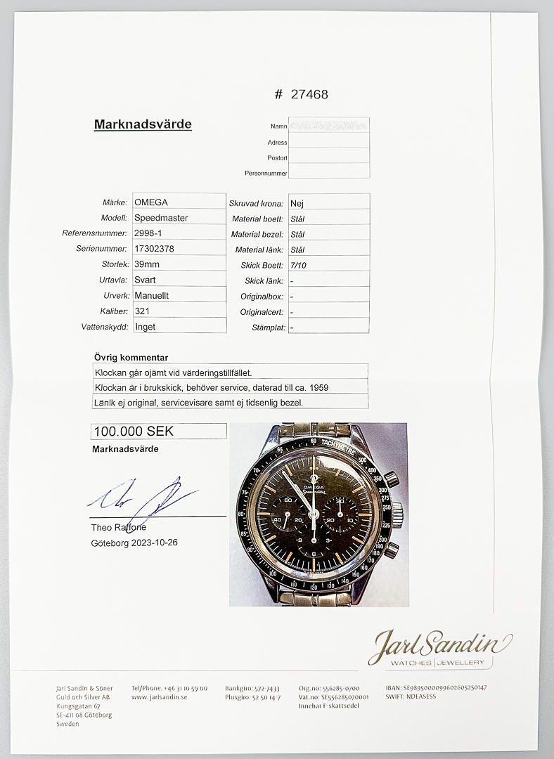 Valuation certificate and condition report from 26/10/23 are included. The watch was purchased in the early 90's and has not been used since 1998. Served at Gaston's Gothenburg.
