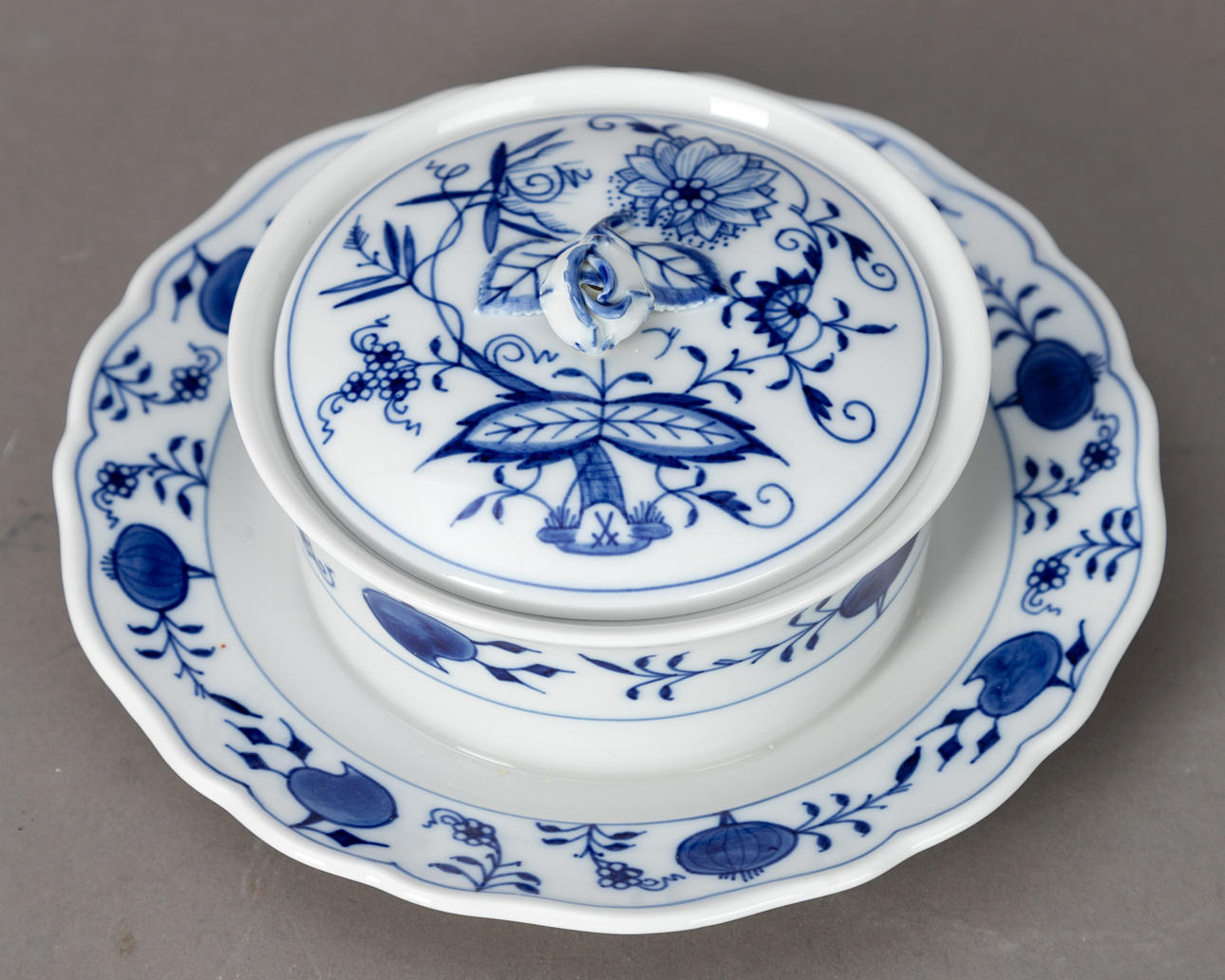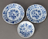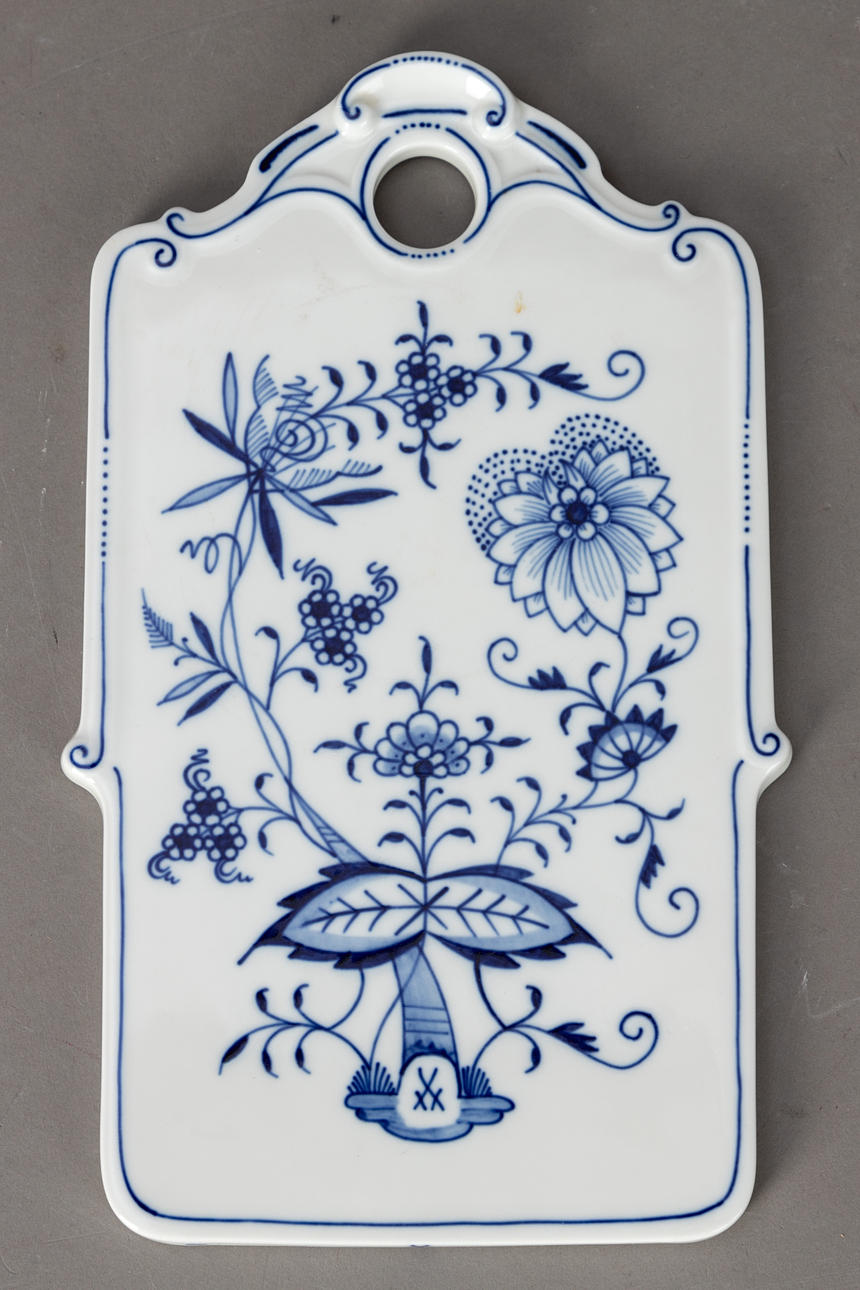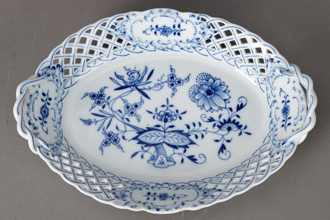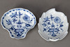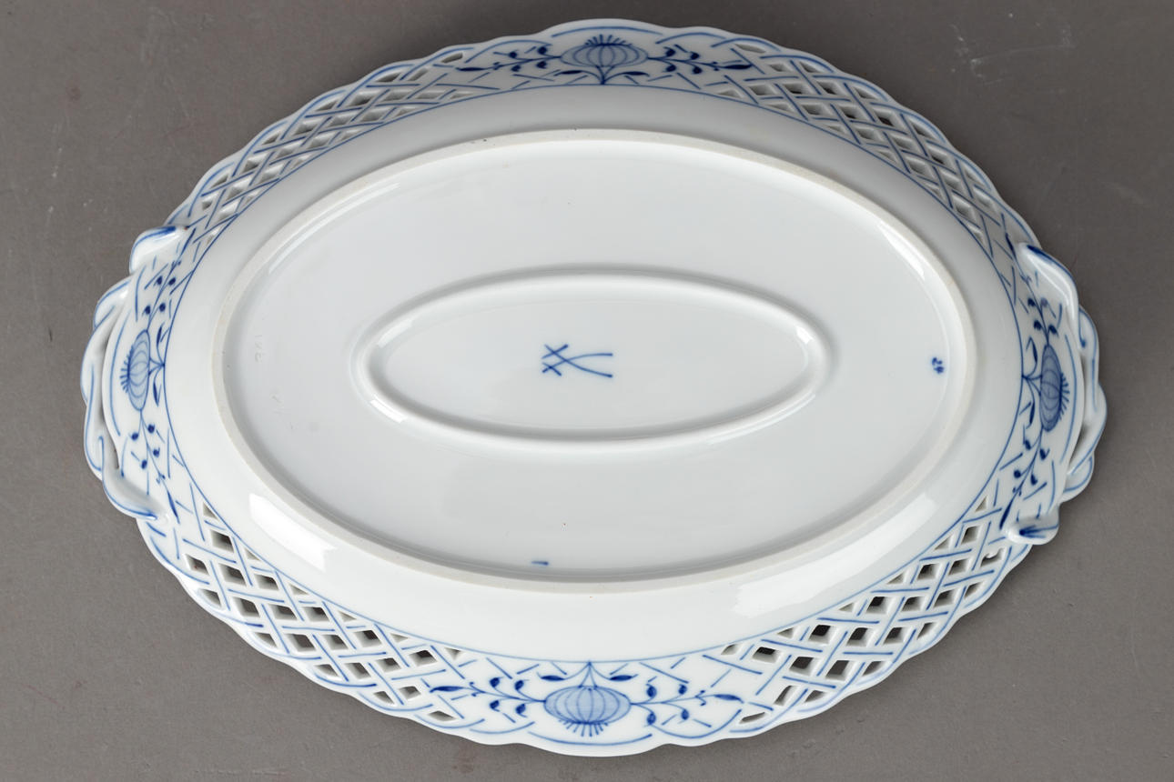 White porcelain with underglaze blue painting. “Neuer Ausschnitt” shape, “onion pattern” decor. Underglaze blue sword mark.