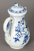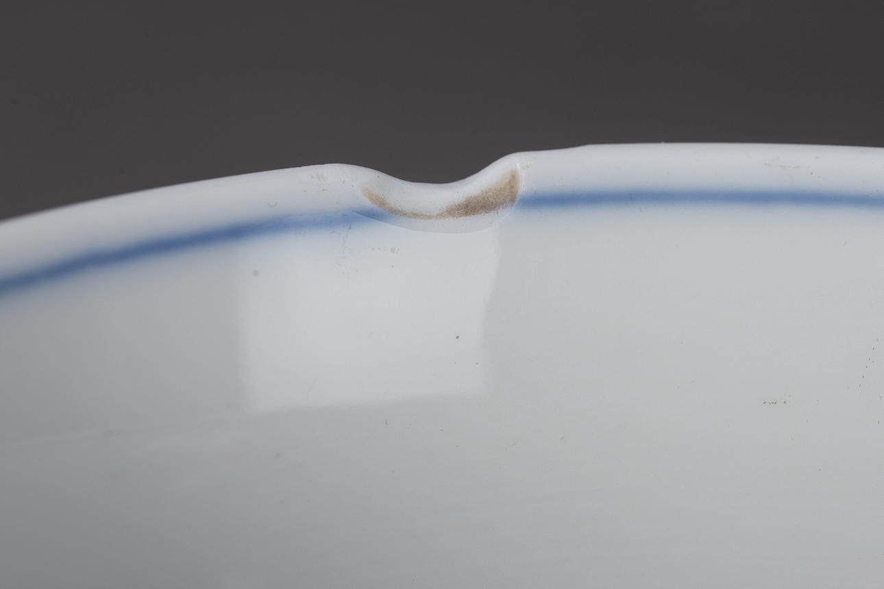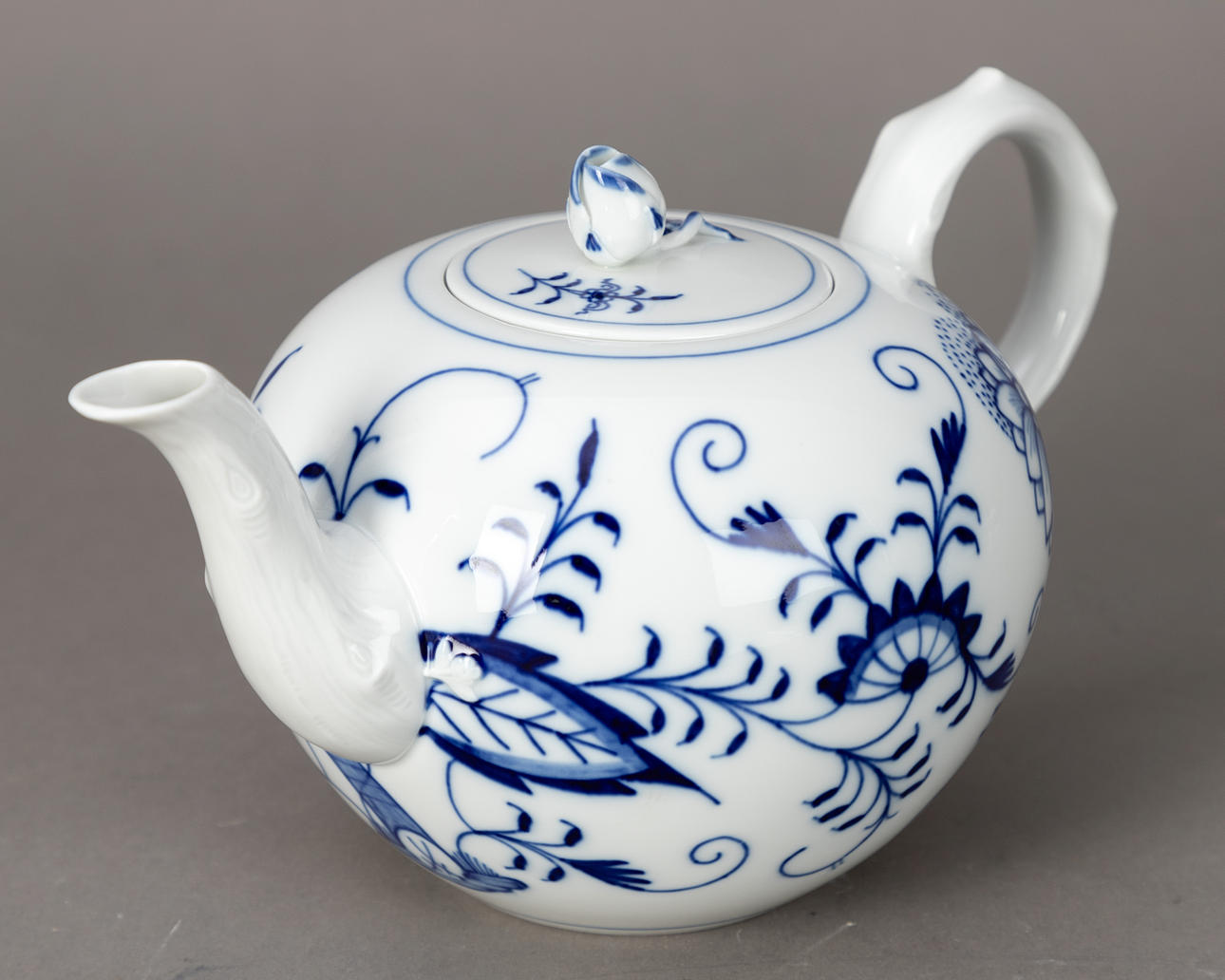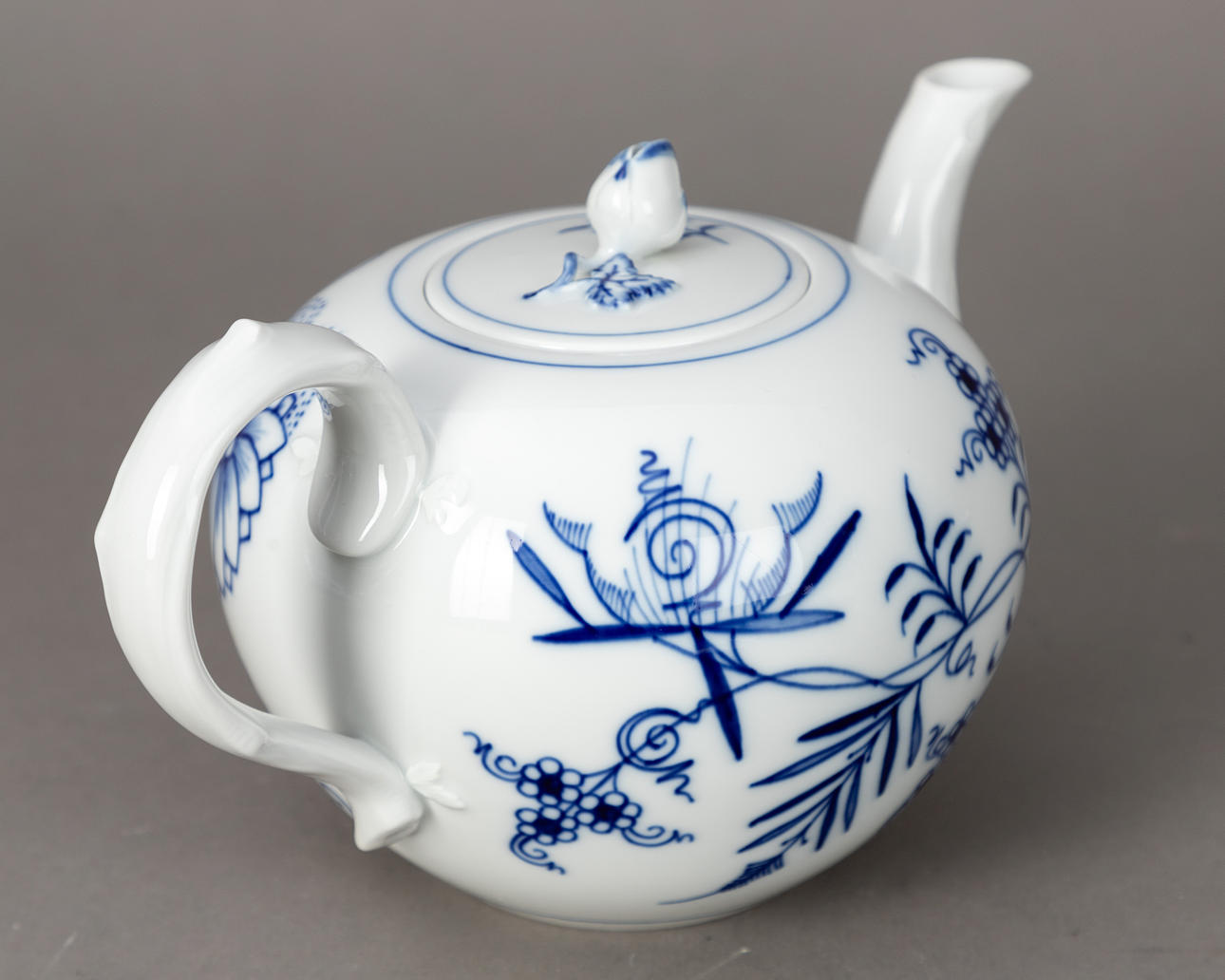 White porcelain with underglaze blue painting. “Neuer Ausschnitt” shape, “onion pattern” decor. Underglaze blue sword mark.