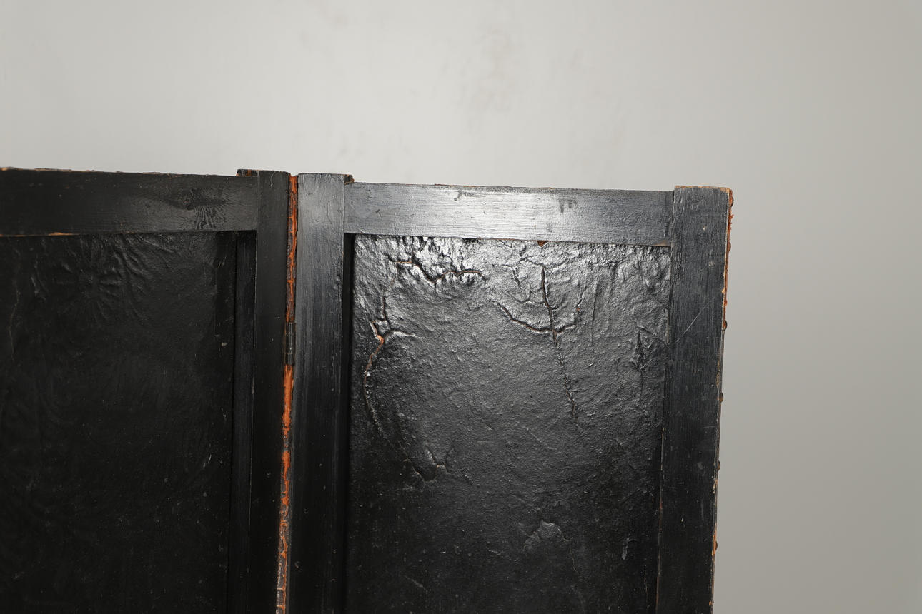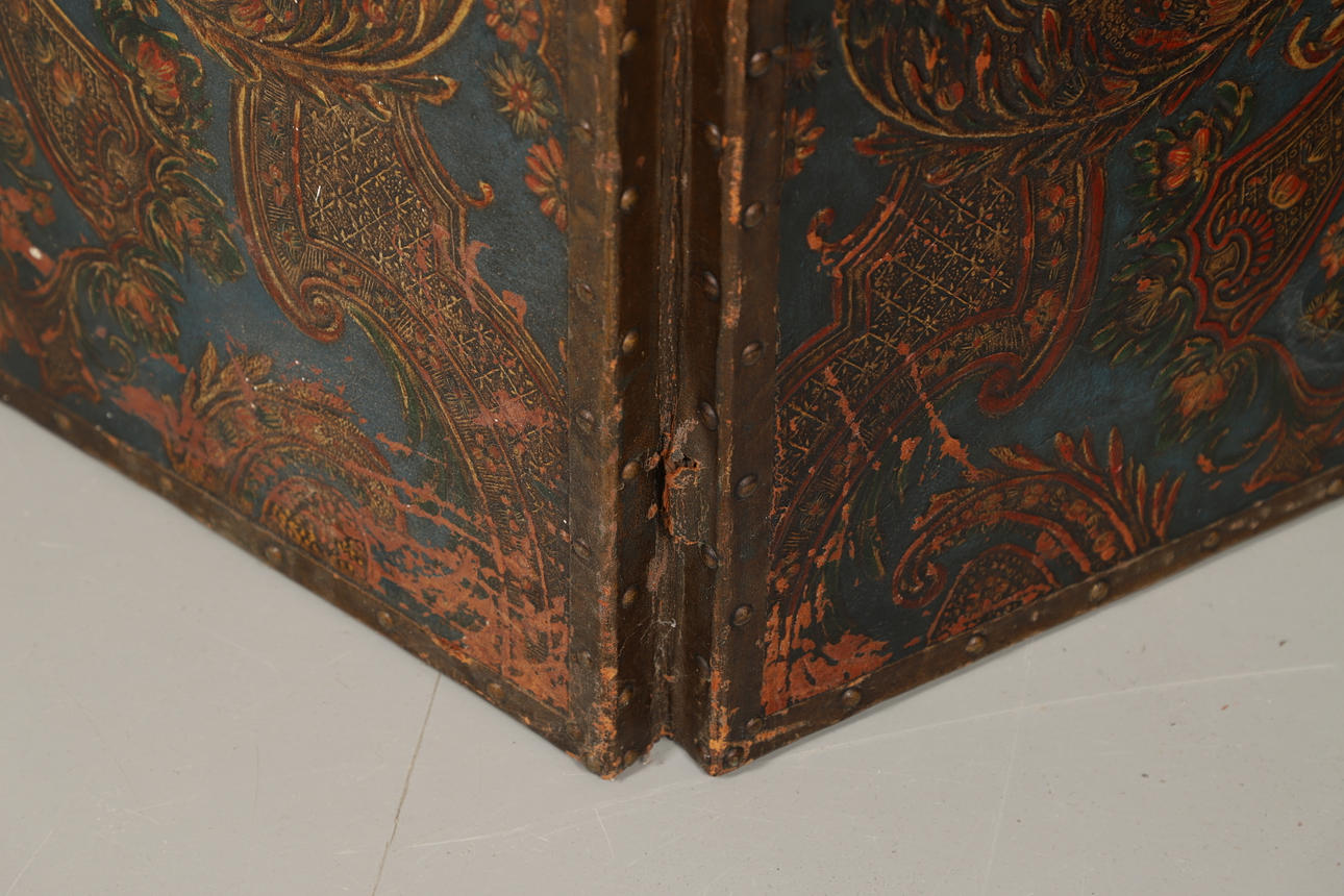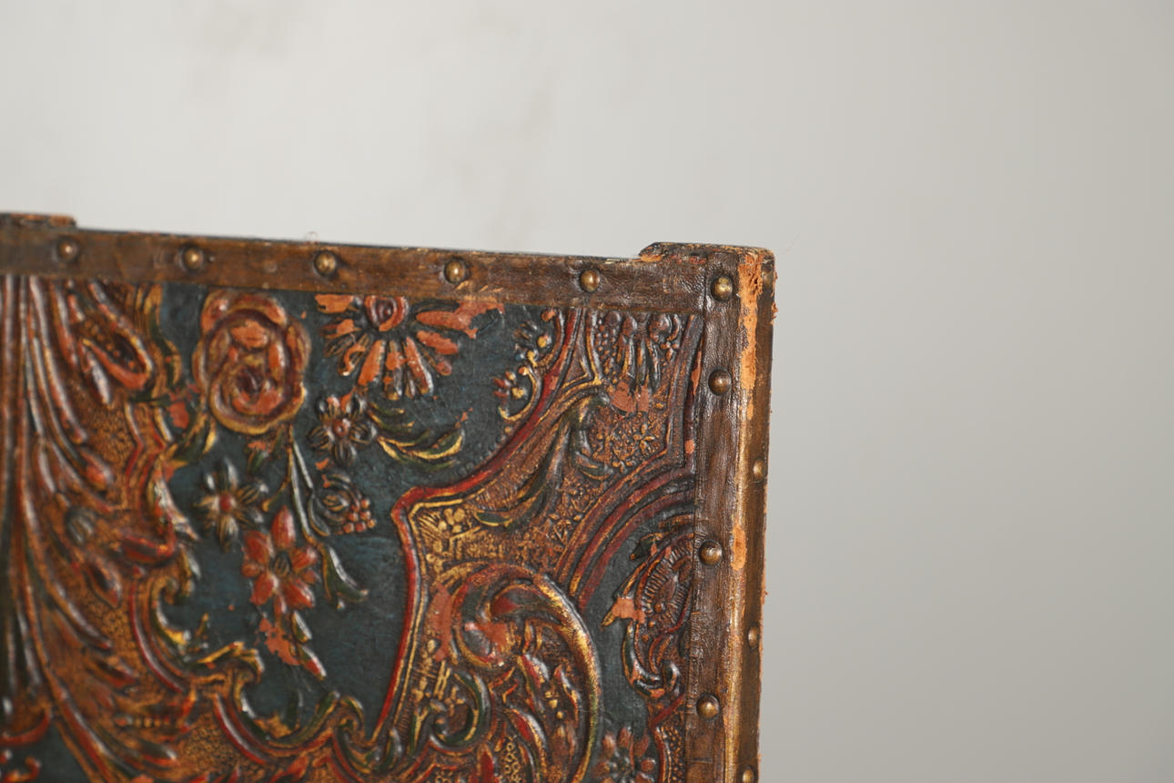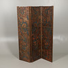 A leather and wooden three fold room screen, the panels painted and gilded with floral designs and with brass stud decoration. 152cms high.