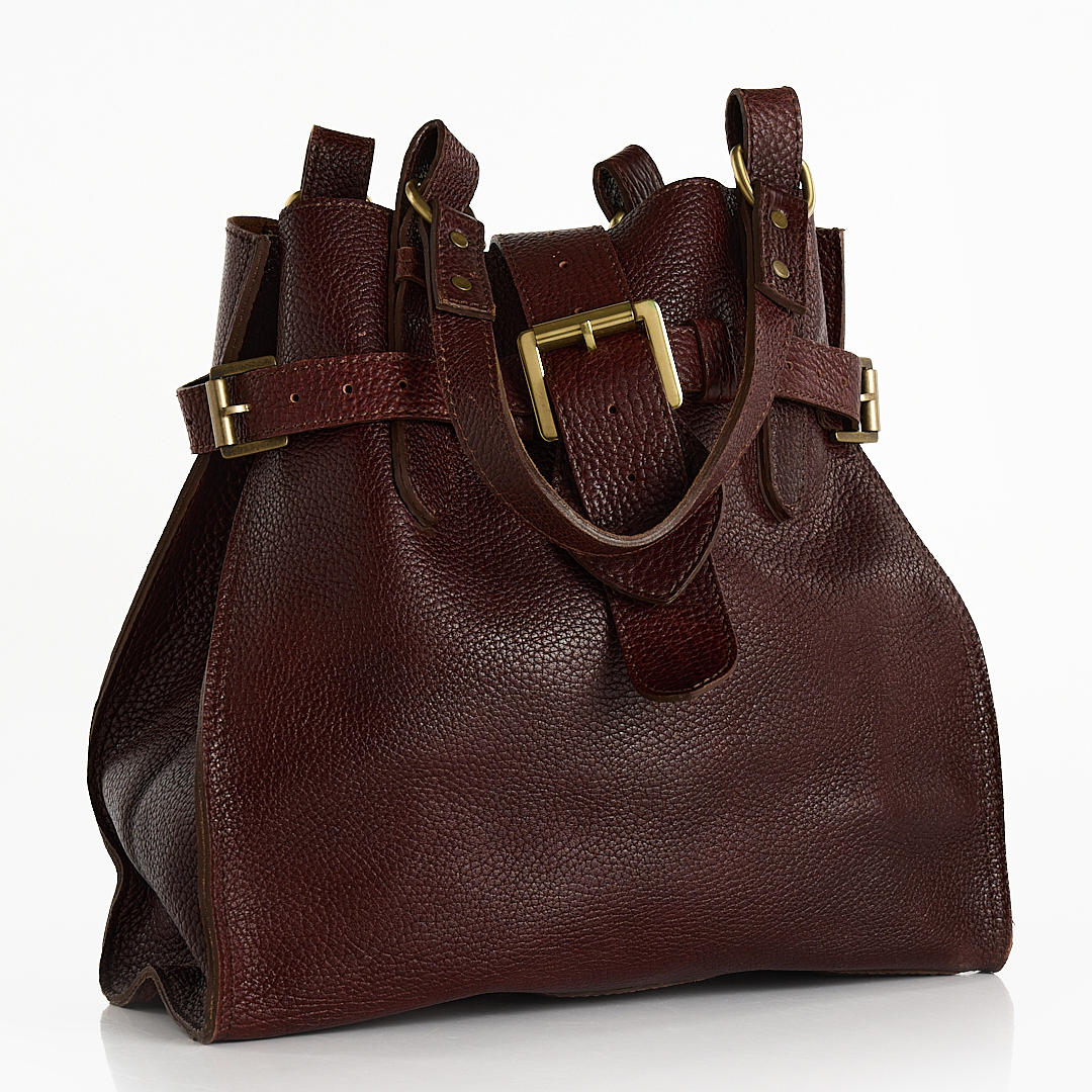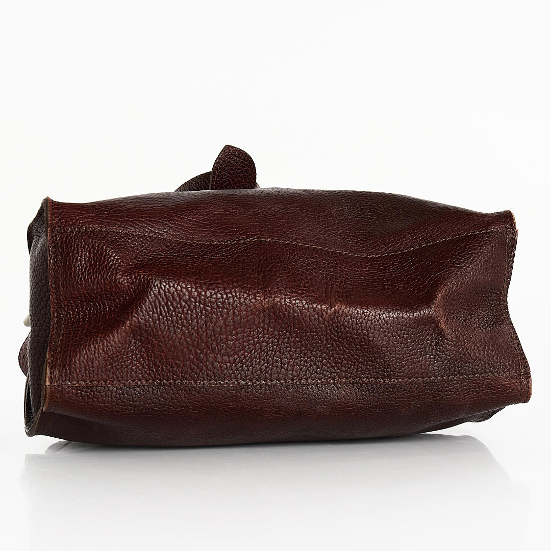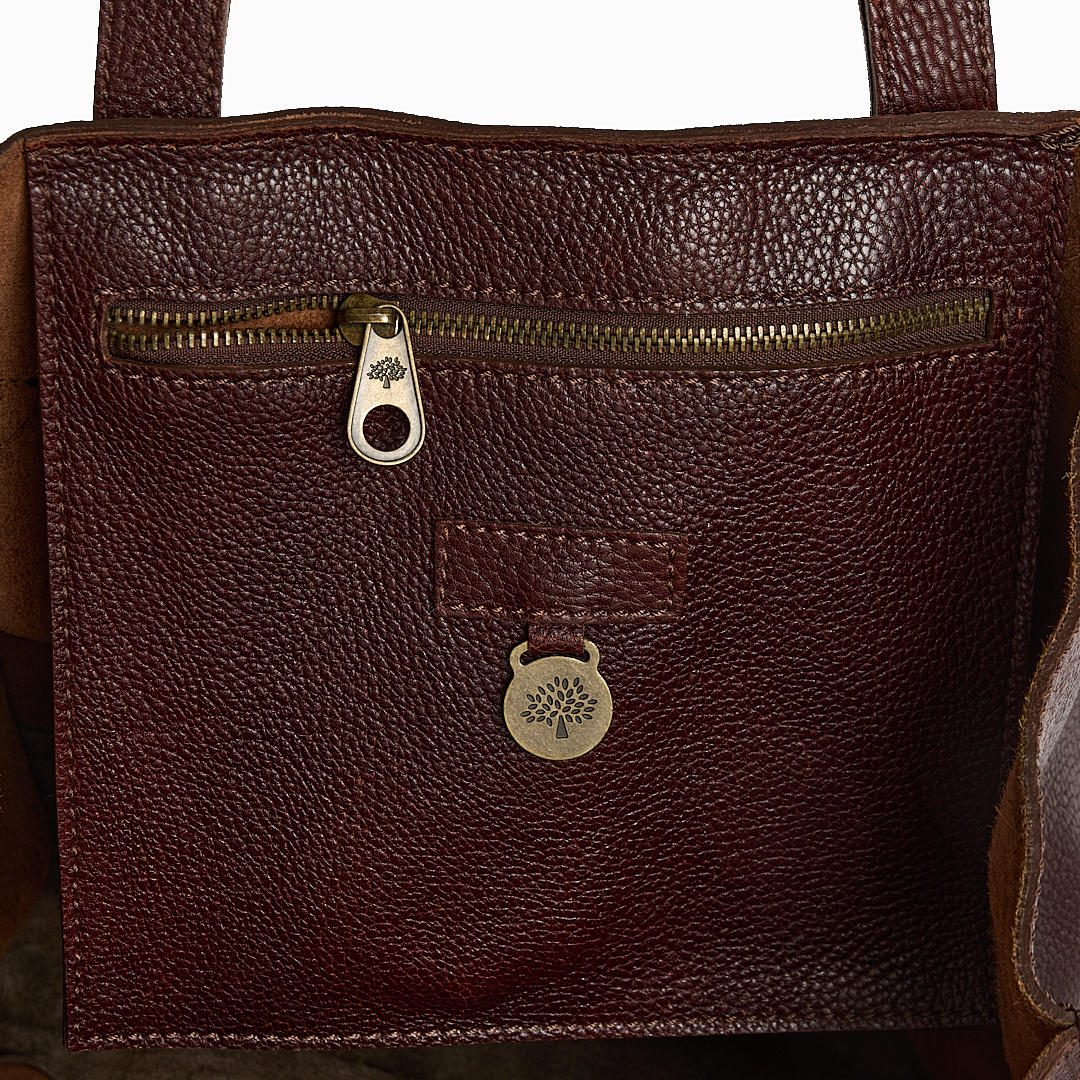Maroon handbag from Mulberry in model “Elgin”. Leather with brass details. One interior zip pocket. Closure with magnetic button.