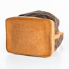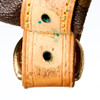 A brass button loosened at the shoulder strap attachment. Leather strap with wear and stretch marks. A slight bright spot on the bottom of the inner lining.