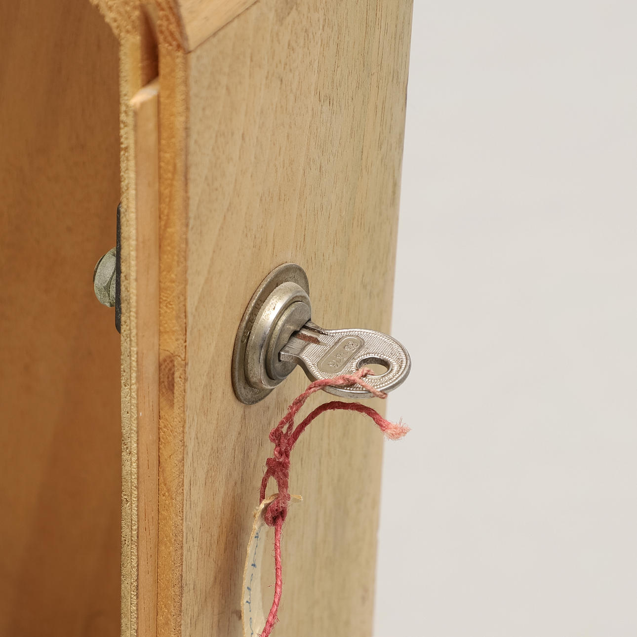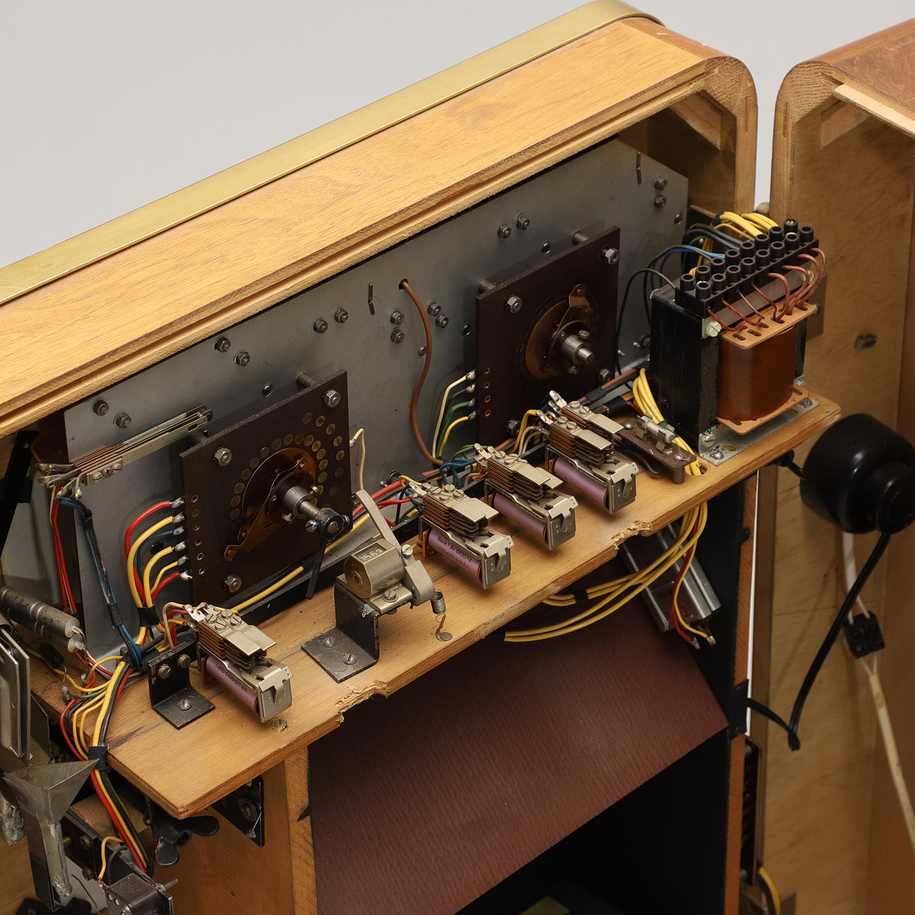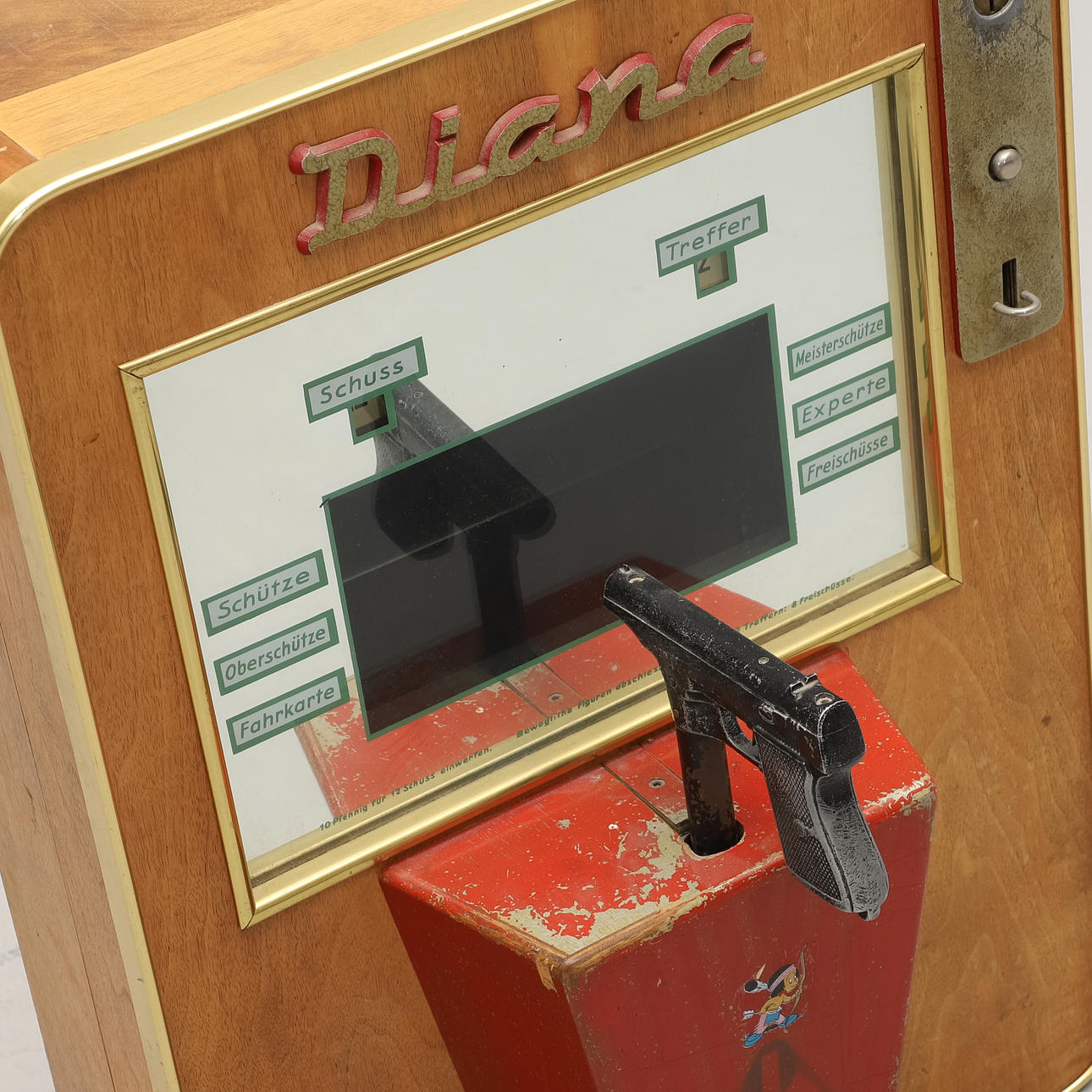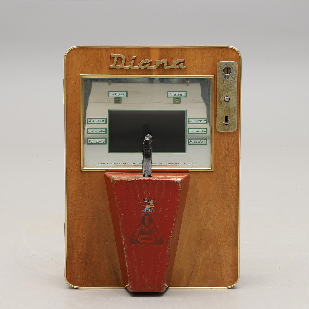 Walnut veneered box, painted metal and glass. Imo-Automatenfabrik Helmut Jentzsch. Height 70, width 50,5 cm.